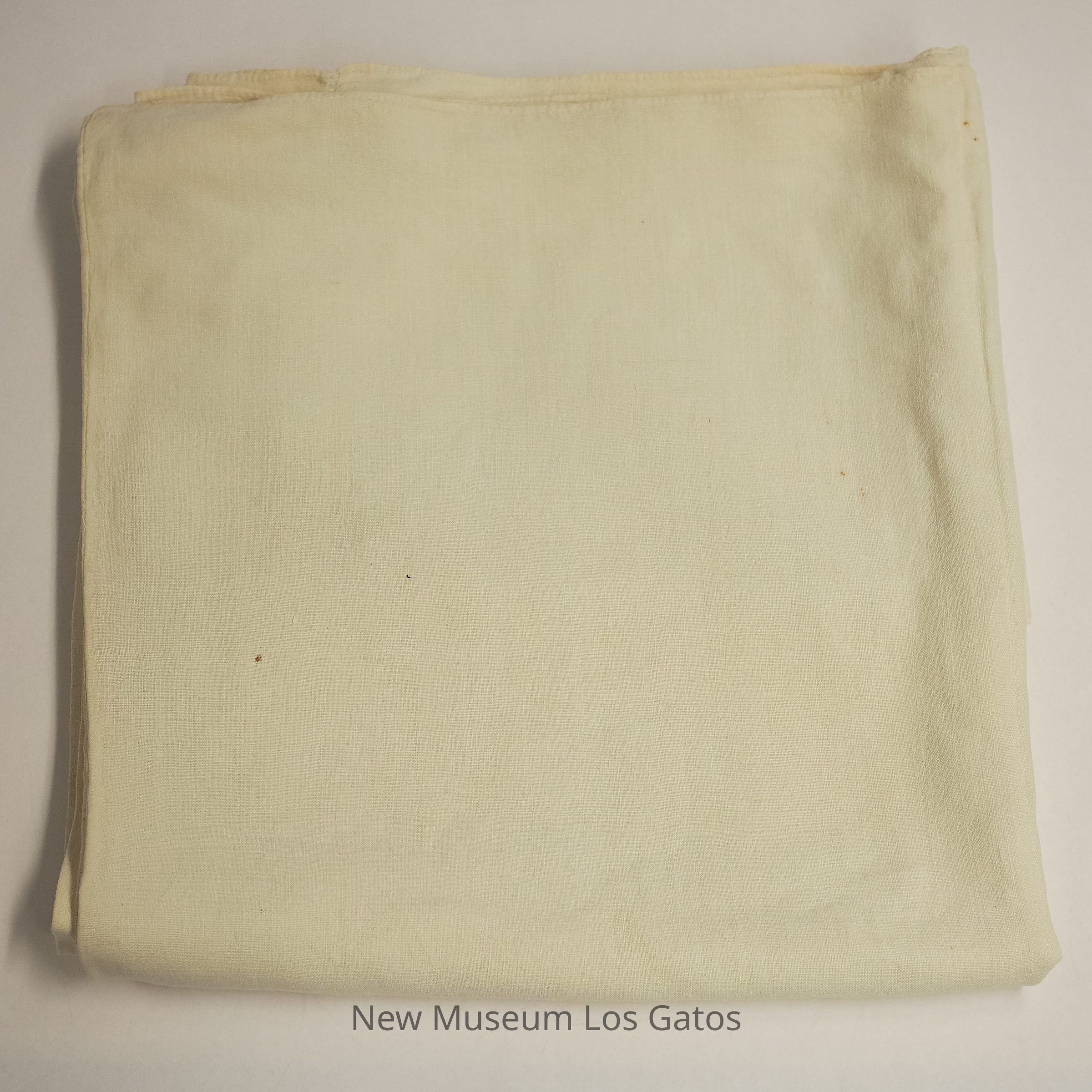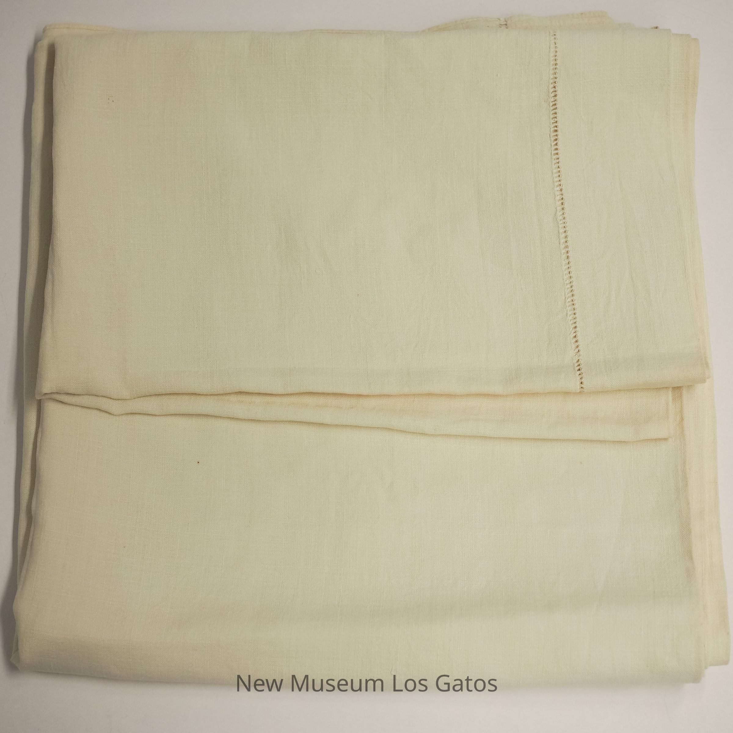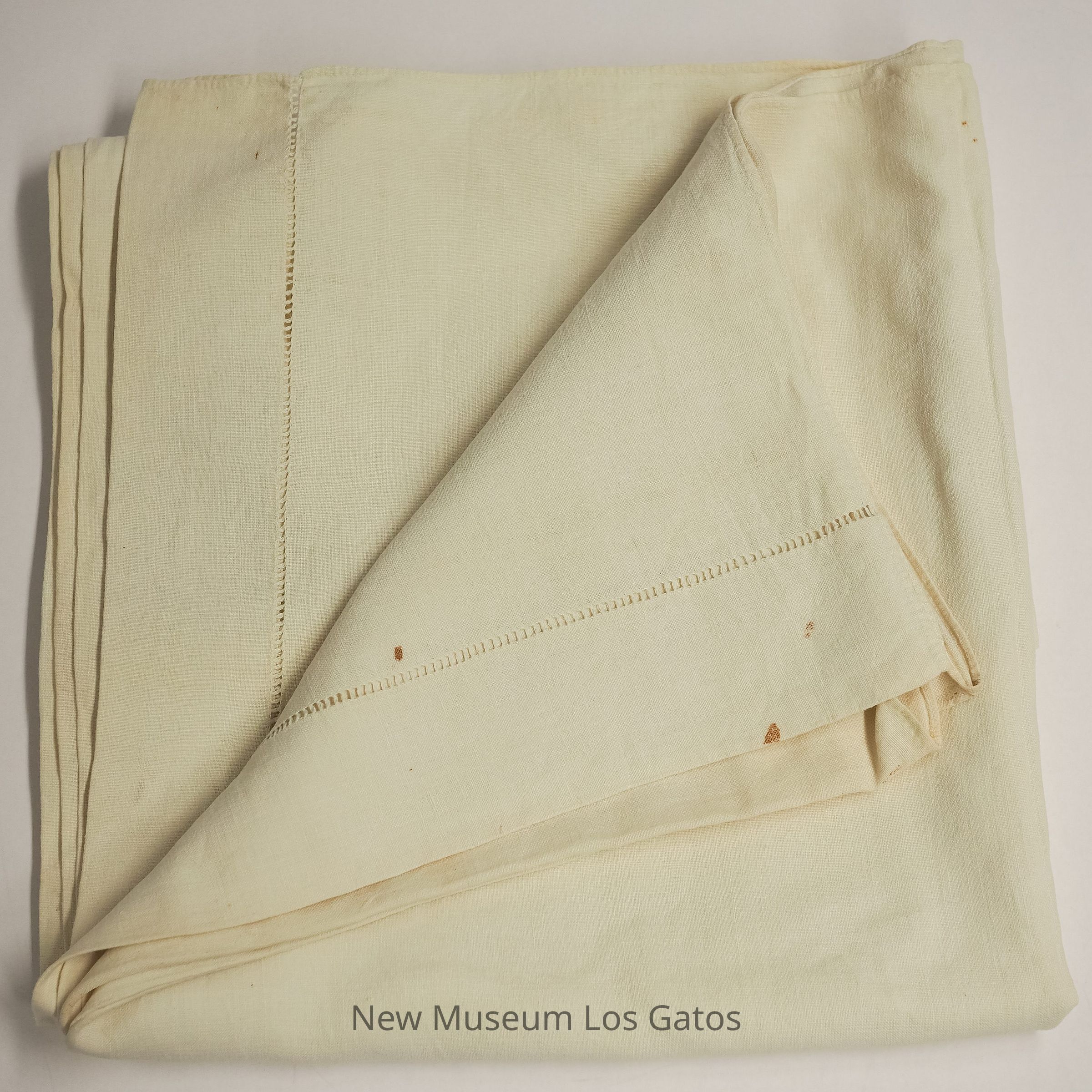 A large, plain, off-white hand sewn linen tablecloth, with eyelet detailing.Collection