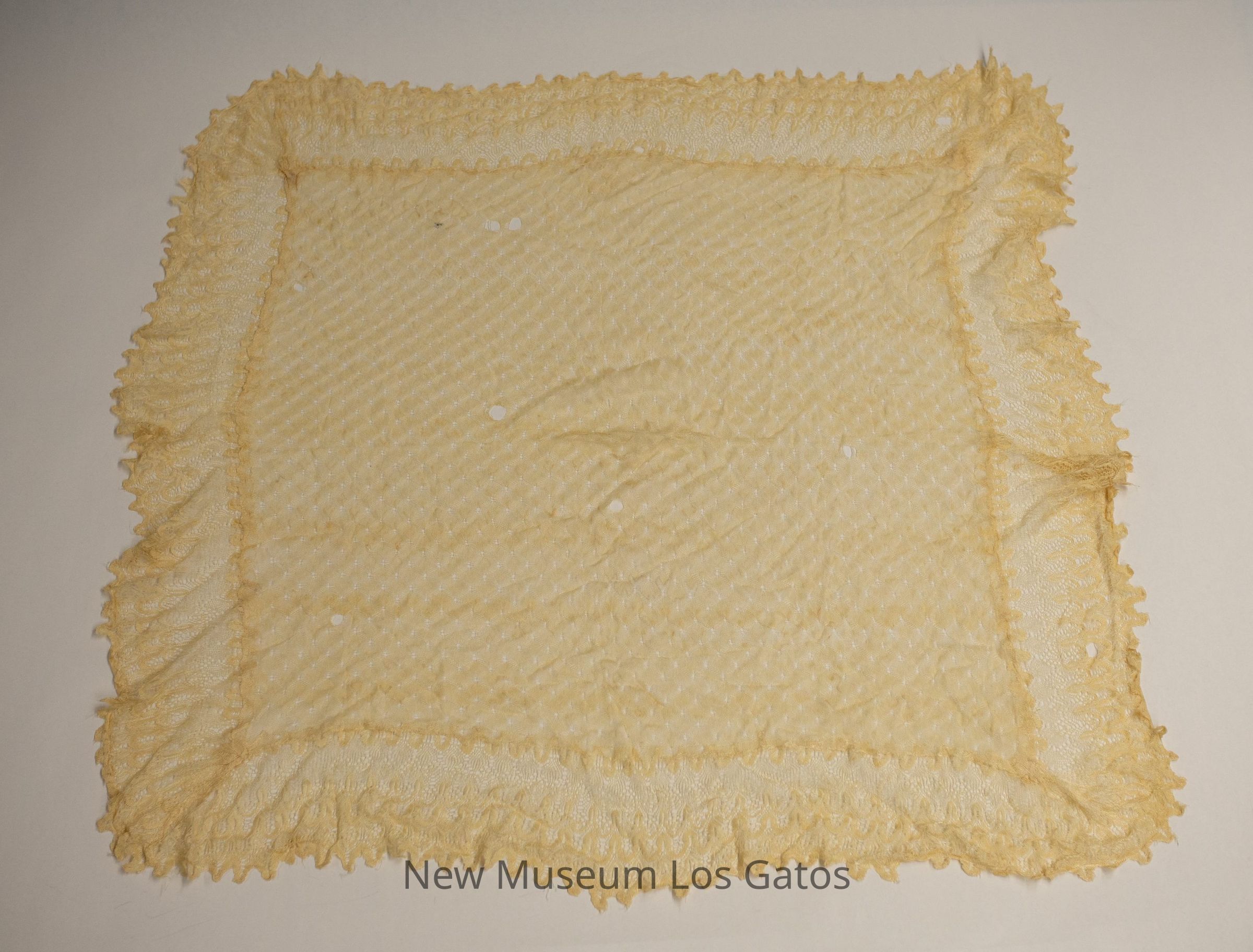 A small, square, lace ecru-colored tablecloth. The center of the tablecloth has a more solid appearance, while the edges have a more wavy appearance.