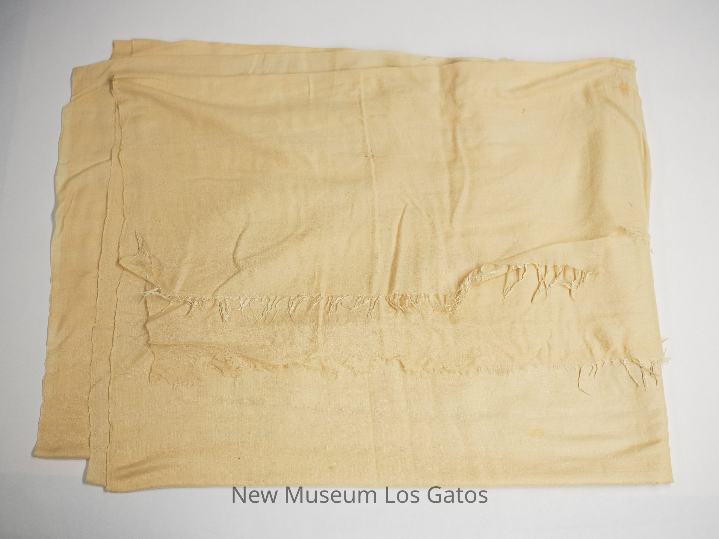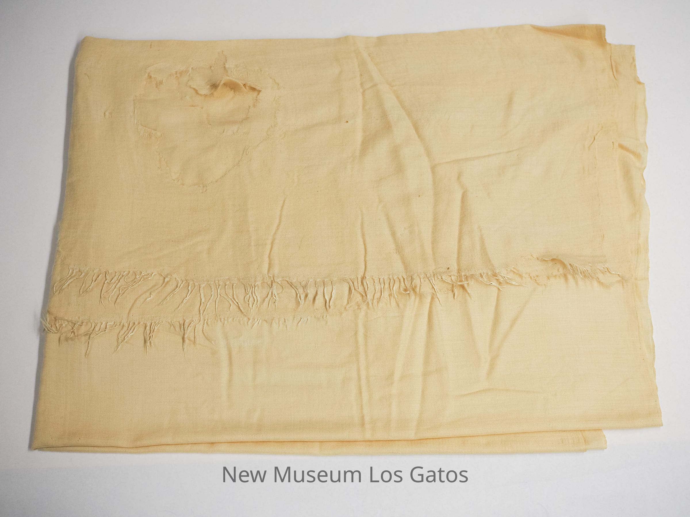 A large, plain, cream cotton tablecloth with a fringed edge.