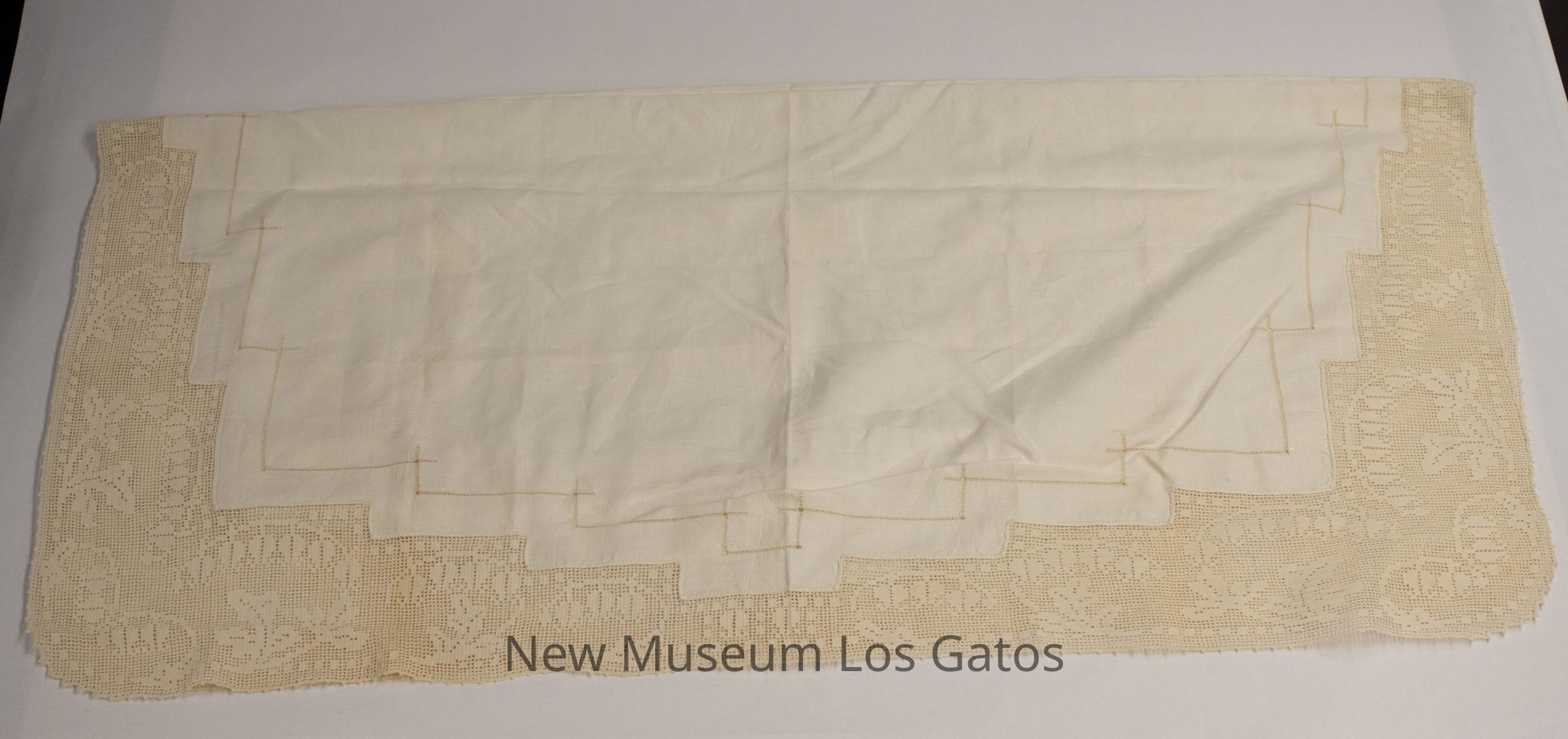 A square, white tablecloth with decorative trim. The center of the tablecloth is solid, with eyelet holes forming a line pattern. There is white handmade trim along all four edges, featuring a floral and leaf pattern.