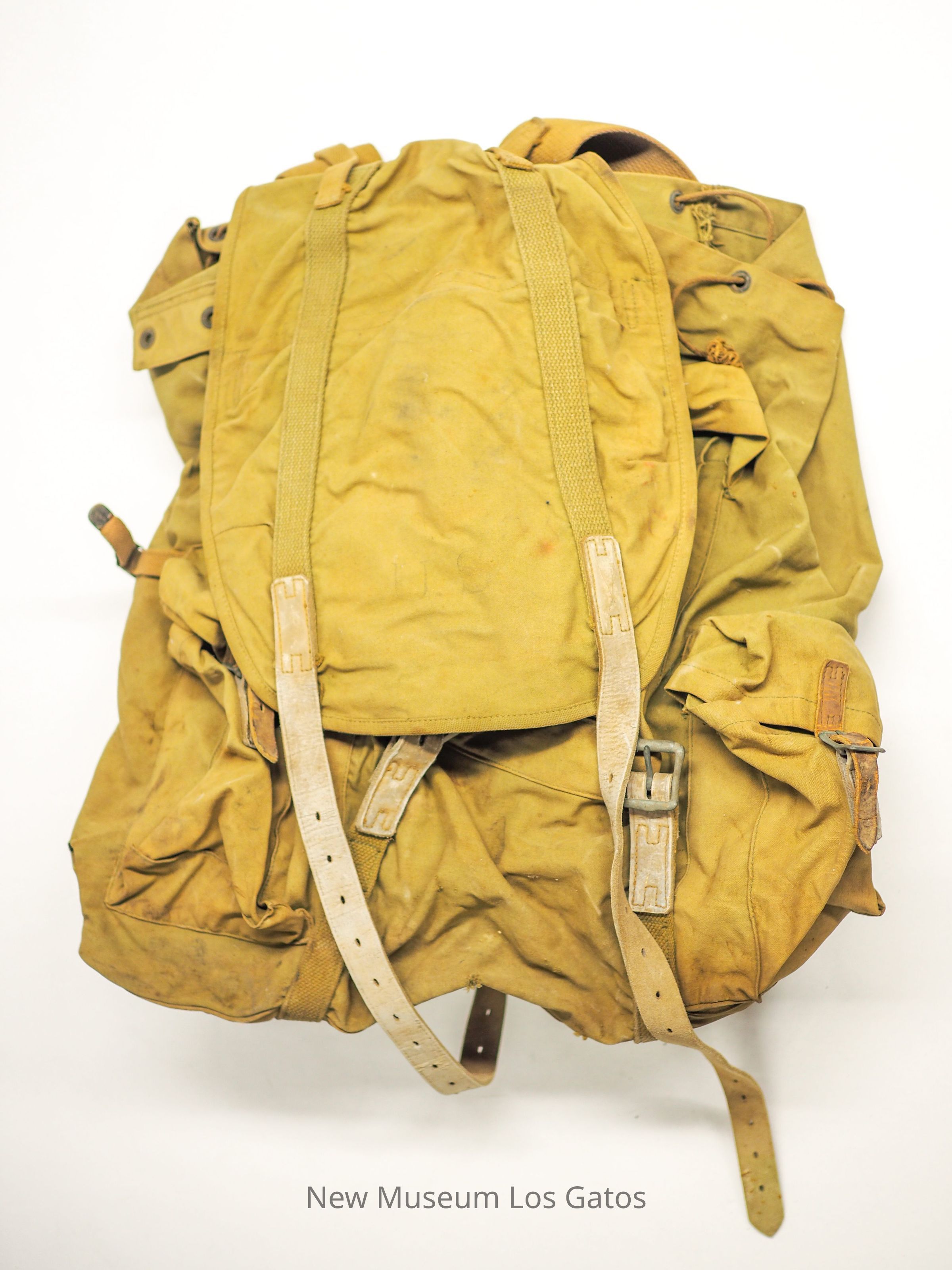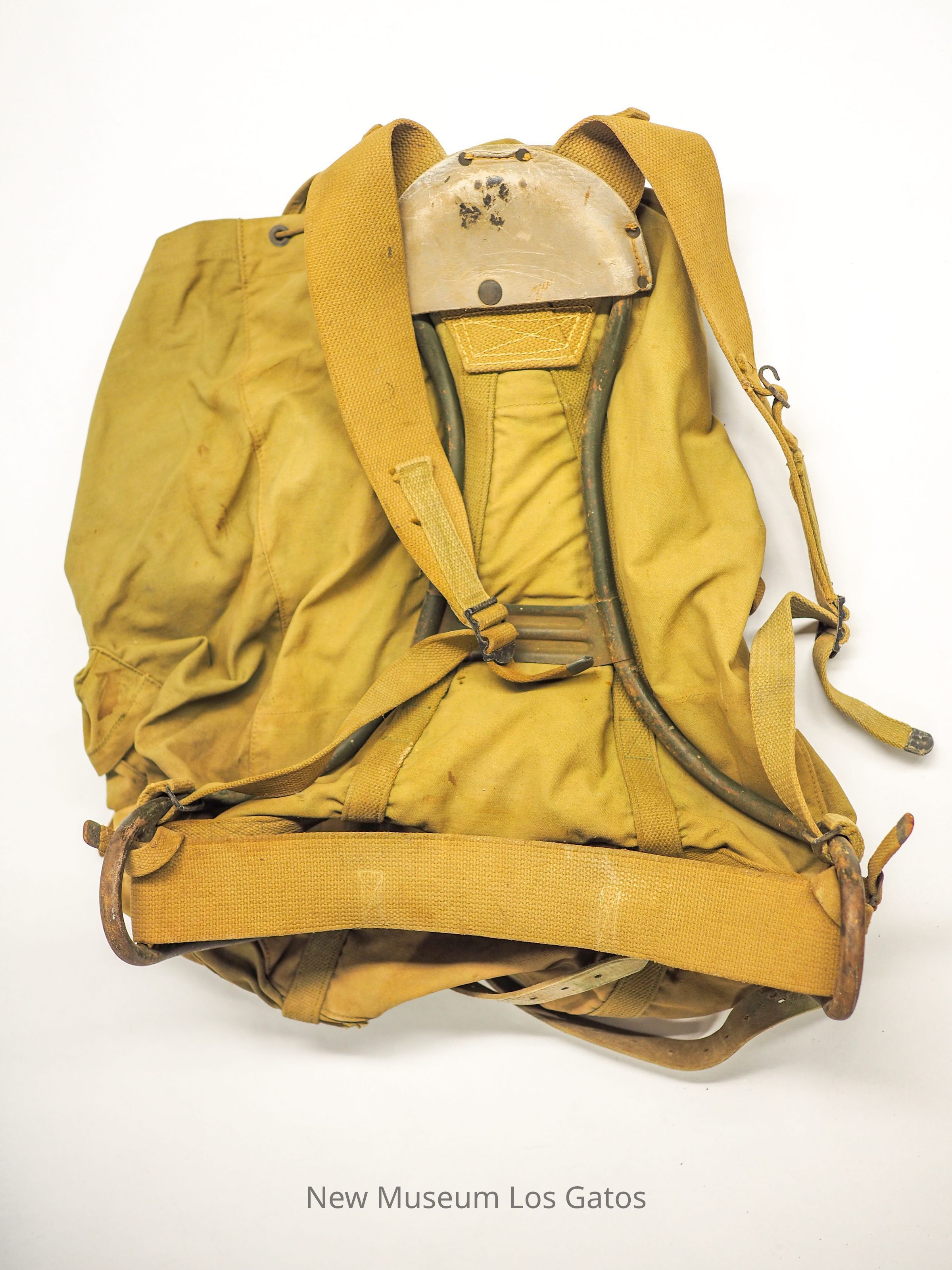 A tan military-issue backpack with metal brace.