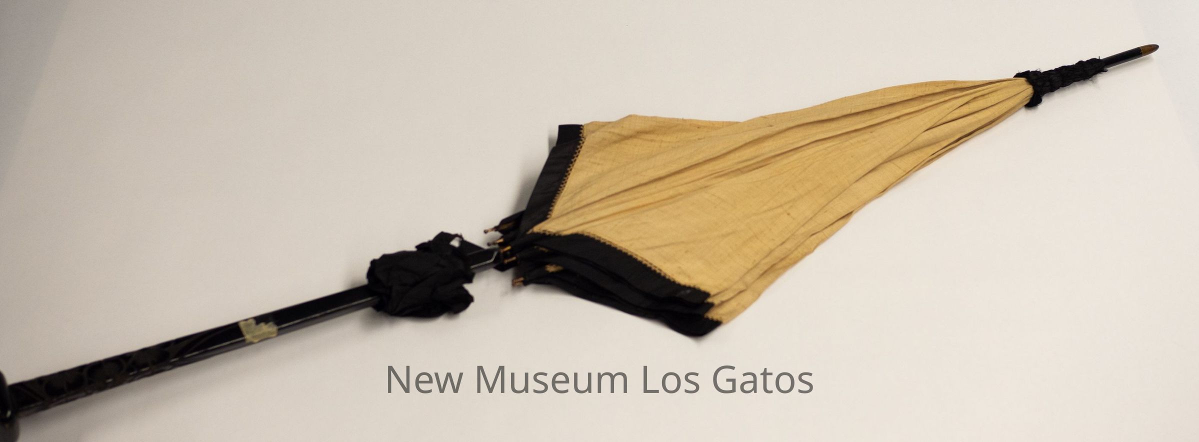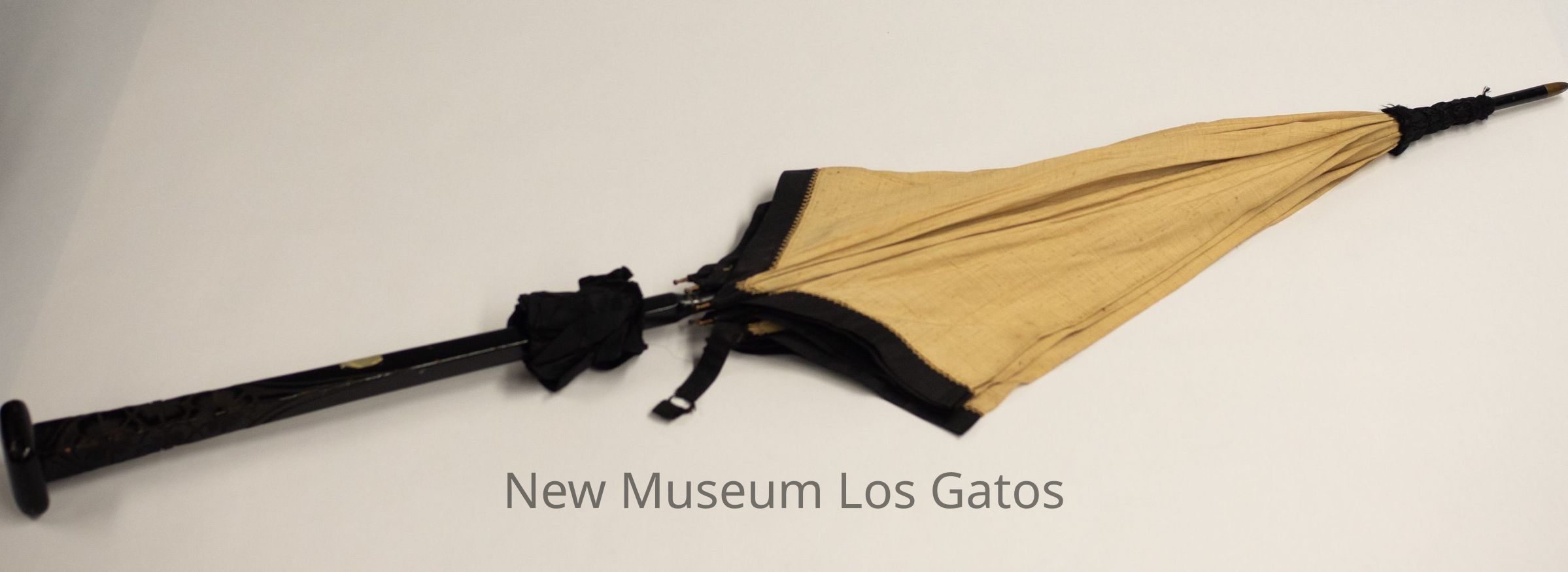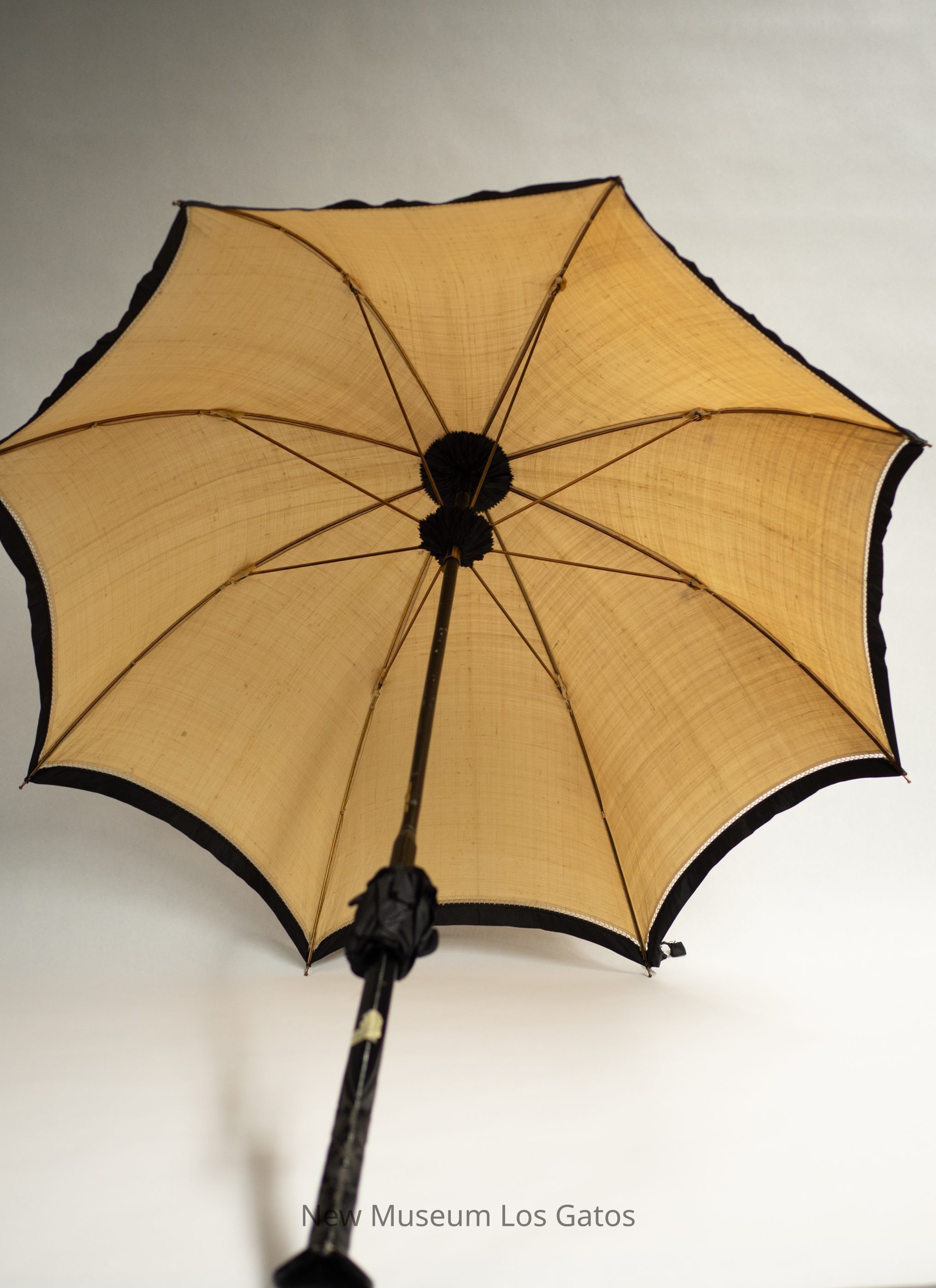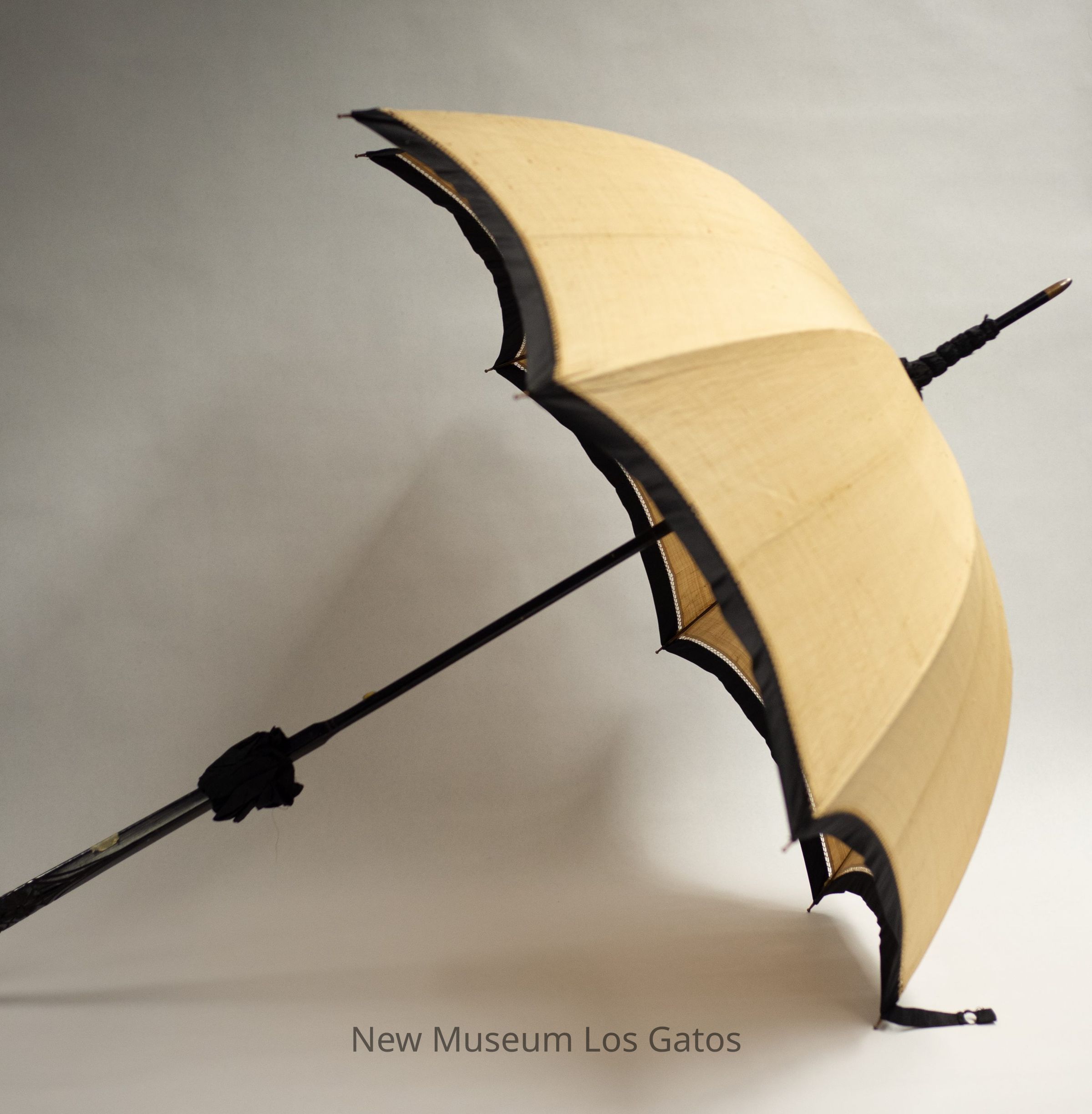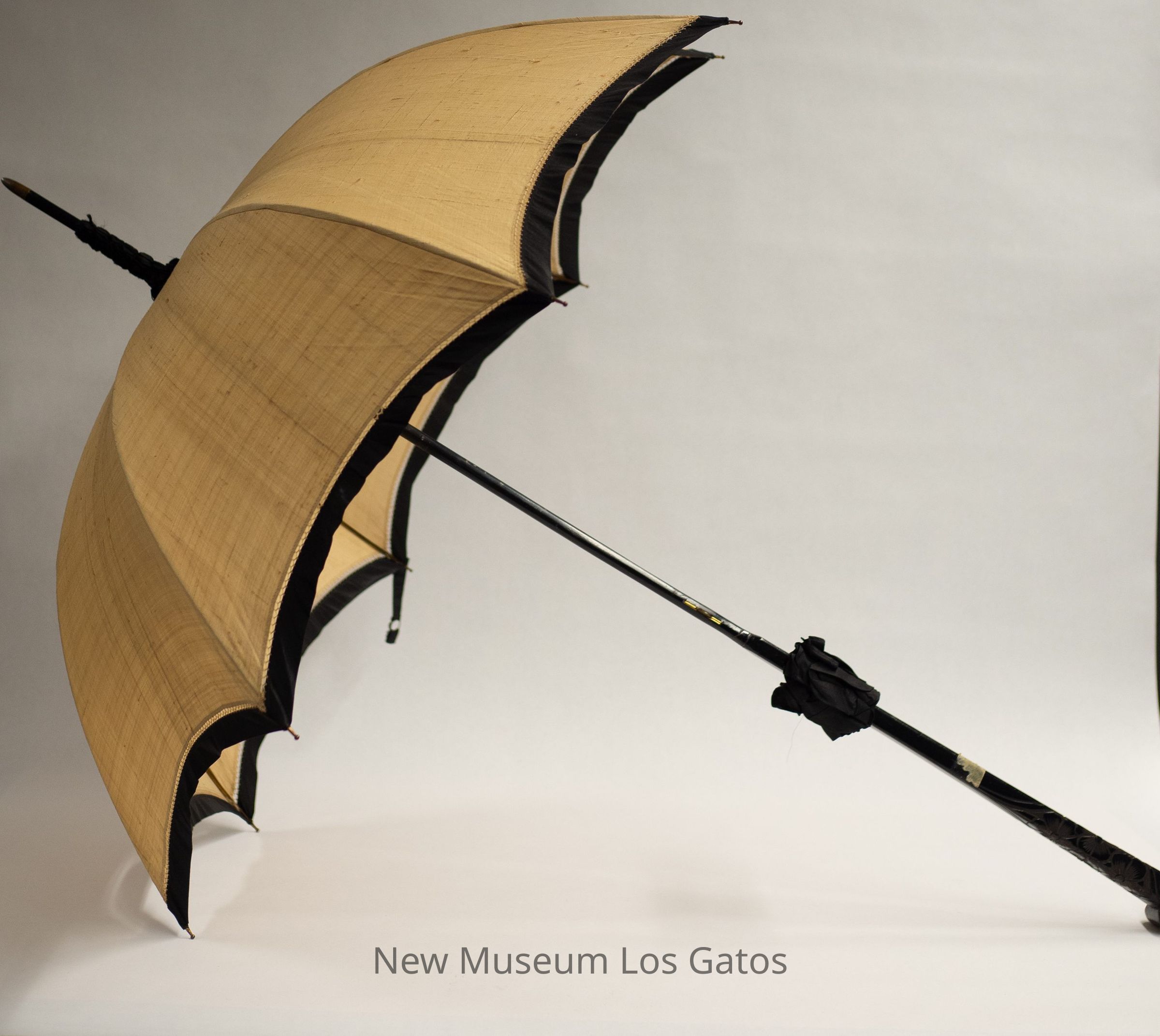 A large tan parasol with black trimmings. The handle is black-colored wood with floral engravings at the end. There is a button clasp to close the umbrella at the end of the main shaft. The tip has a long fine point with a gold and silver tip. The umbrella portion is tan, with beige lace inset.Collection