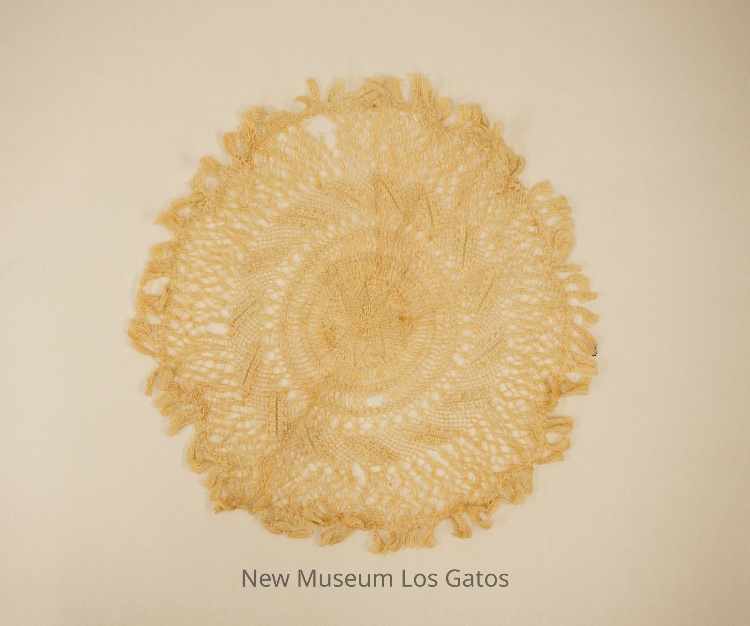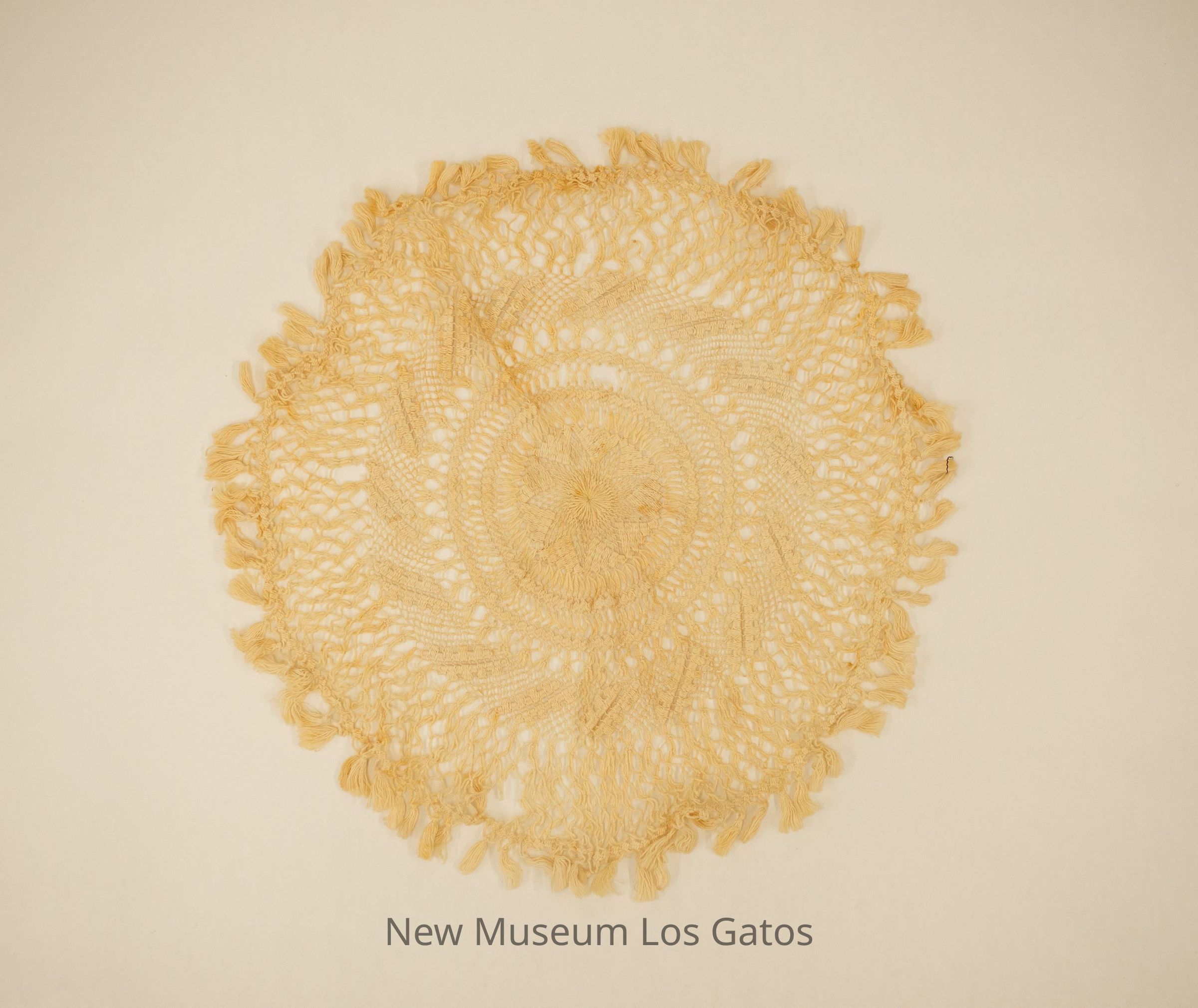 An off-white, tatted doily. There is a star pattern in the center, with numerous circles surrounding the star. Each circle features a different geometric design. There are tassels around the edge.Collection