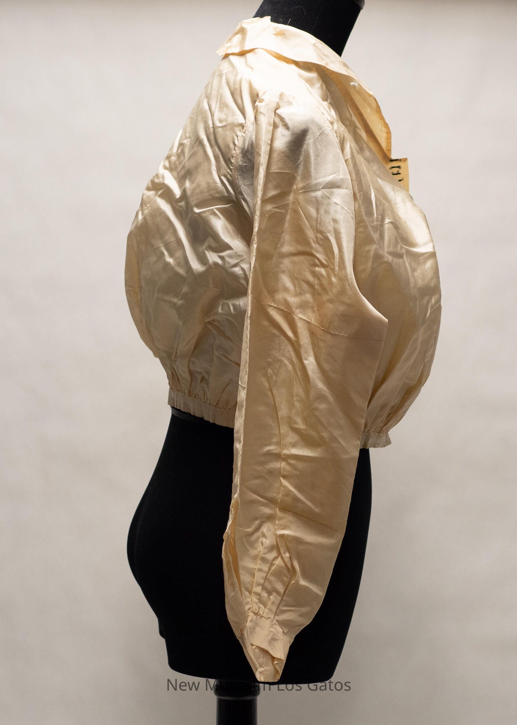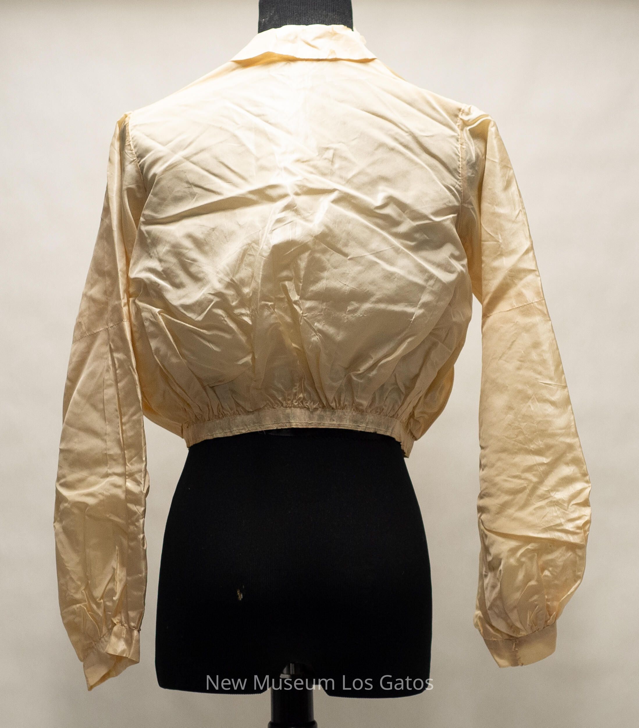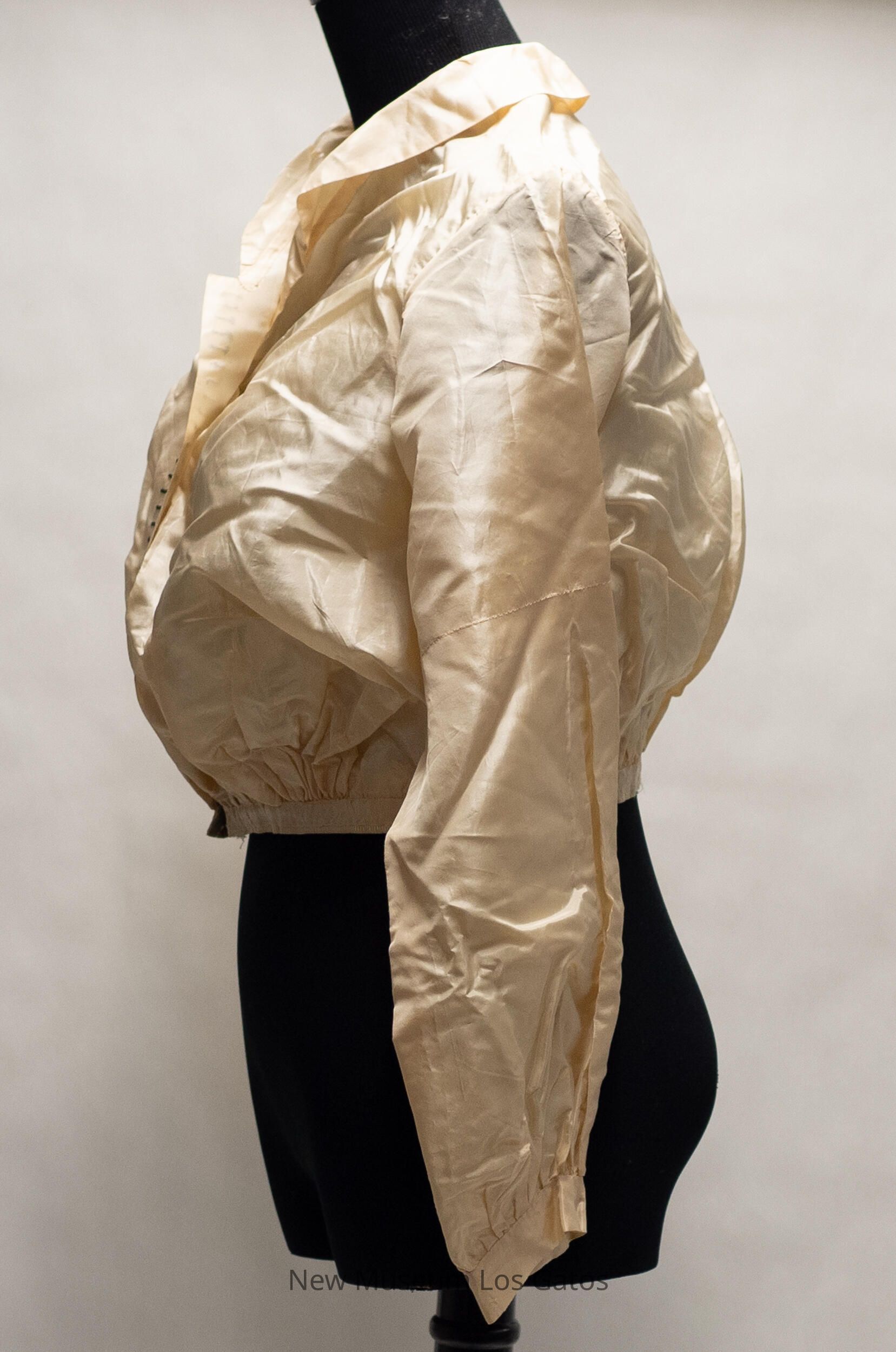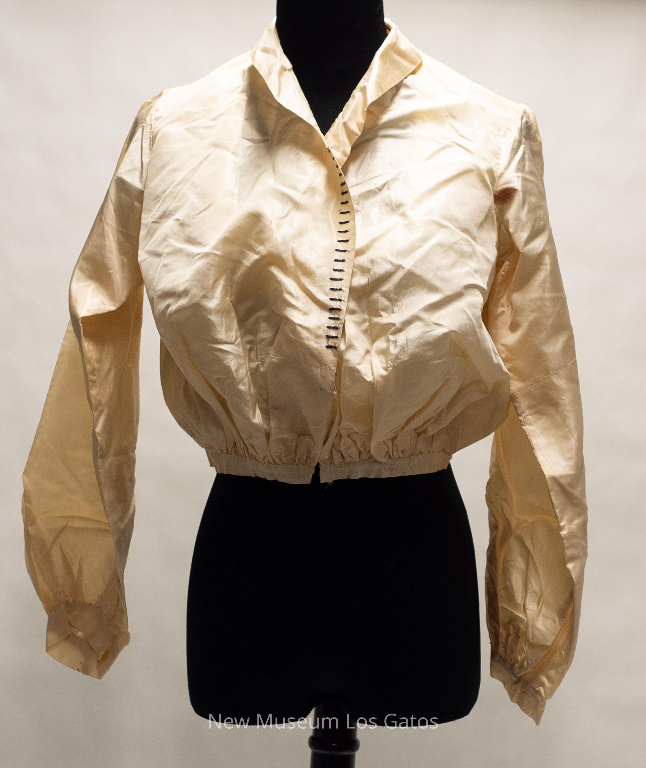 A light cream colored tea gown bodice. The bodice is collared, and closes down the front with a series of hook-and-eye clasps. The sleeves are long, and there is a decorative ribbon around the bottom of the jacket, as well as decorative, horizontal black lines sewn on the right side of the bodice.Collection