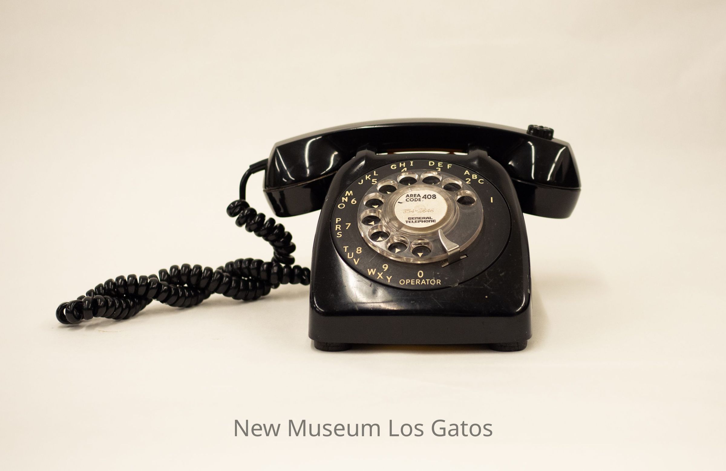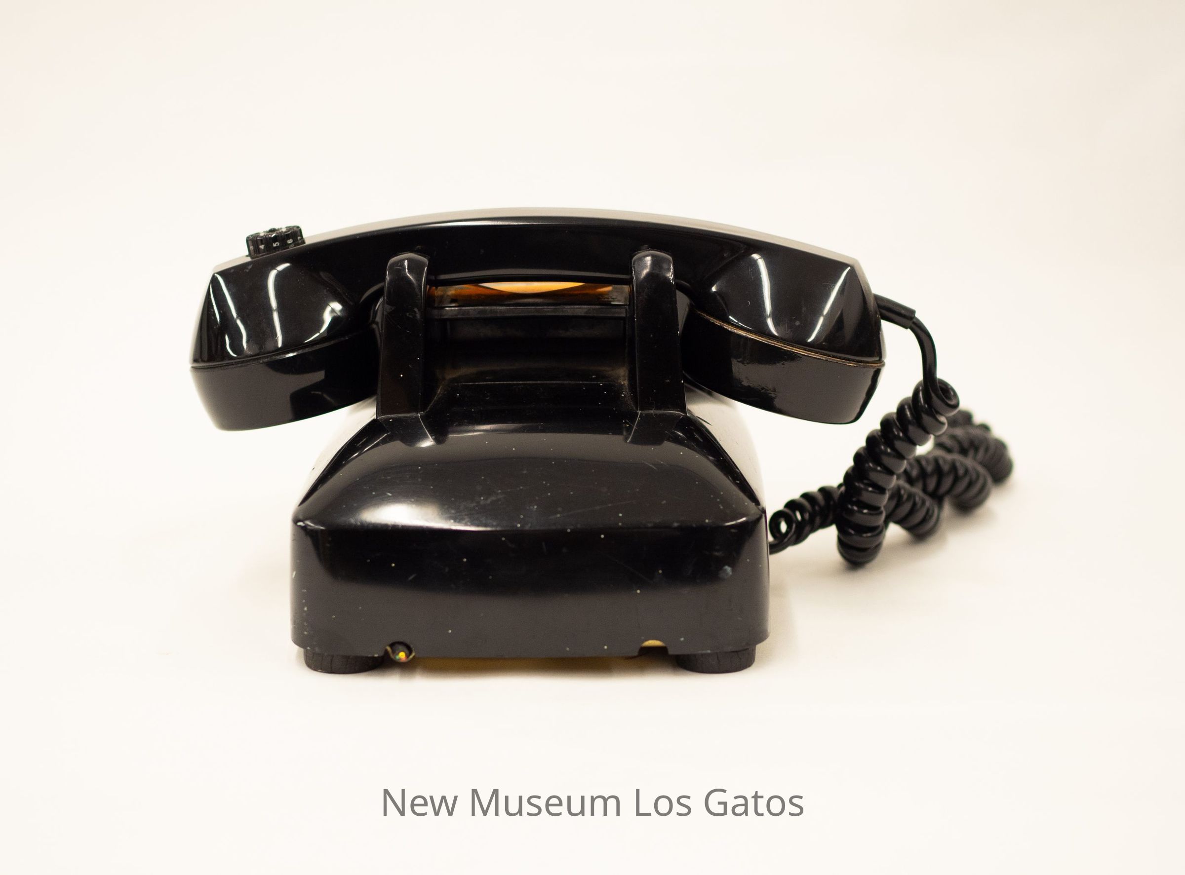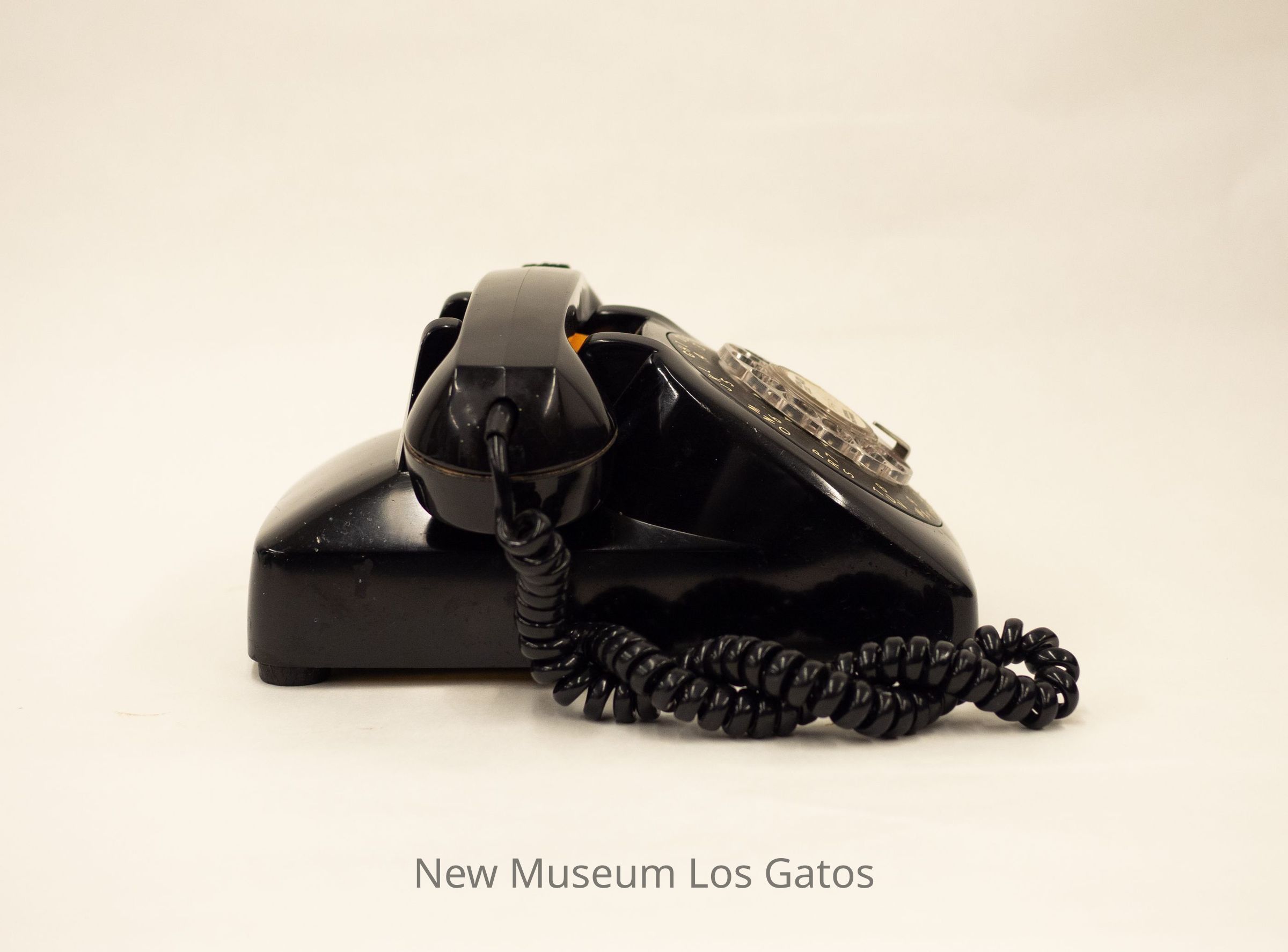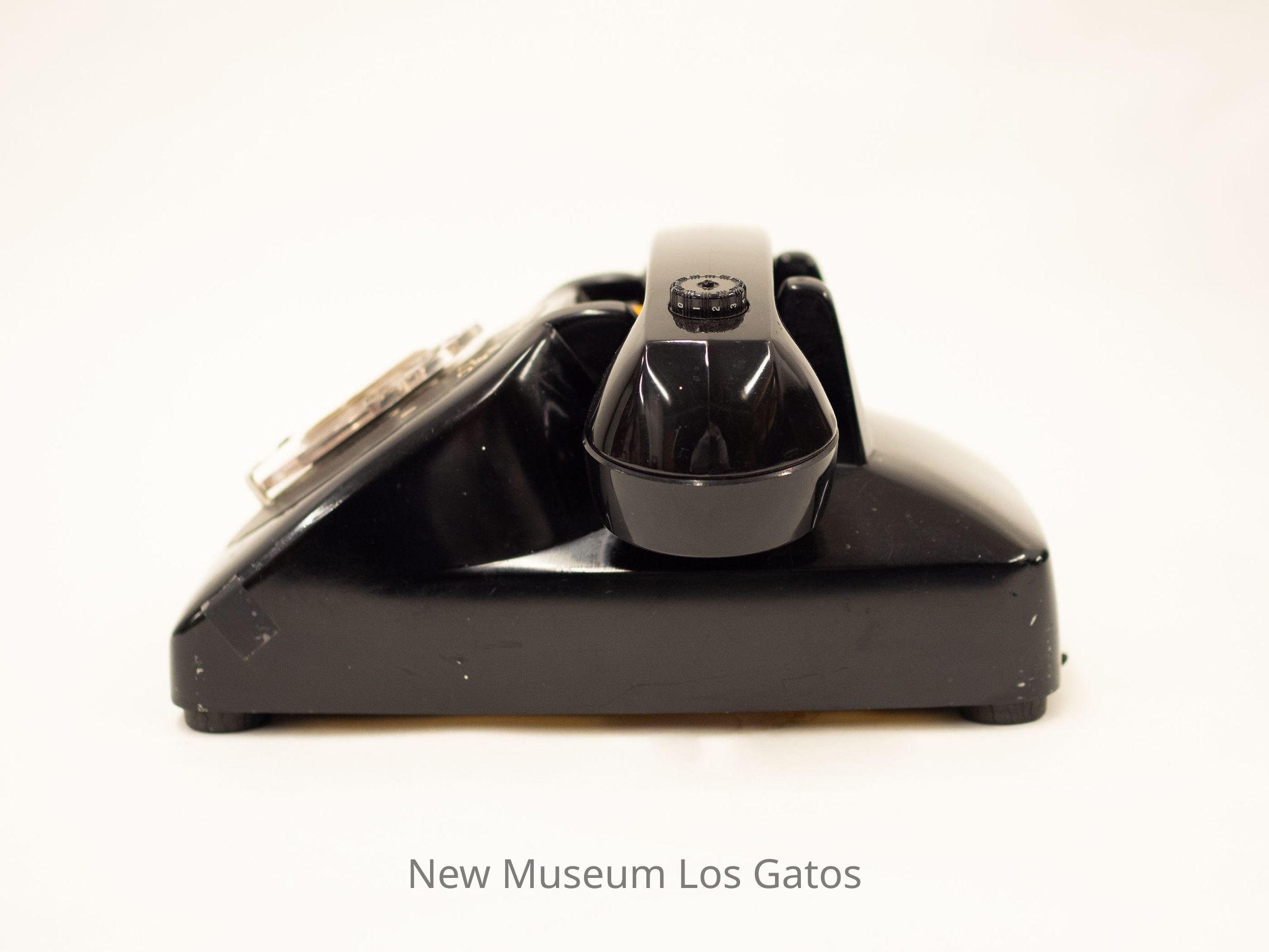 A black rotary telephone. The body of the telephone features numbers one through nine, along with the alphabet, starting from right to left. The wheel is clear, and there is a white sticky in the center. The cord and receiver are also black.Collection