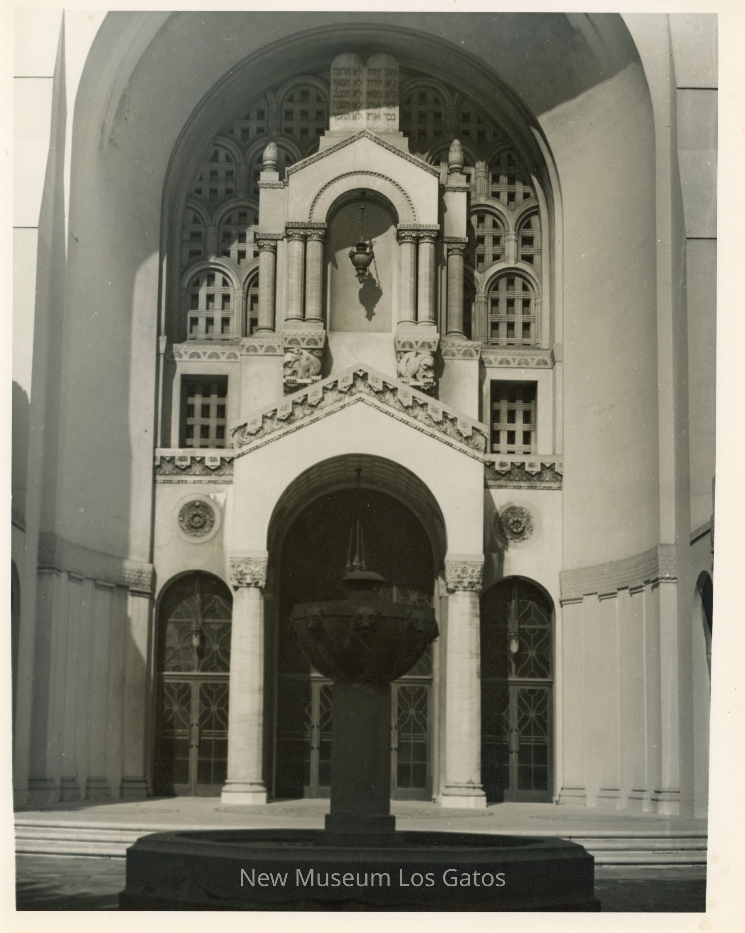 A black and white photo of Temple Emanu-El, featuring a front view of the temple. The temple has decorative doorways and decorative arches. There is ornamentation bordering the doorways and windows. A tablet with Hebrew writing is near the top of the building.