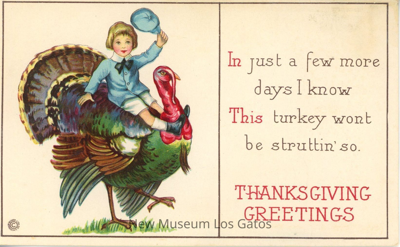 A postcard celebrating the Thanksgiving holiday. The face of the postcard features an illustration of a young child riding a turkey on the left side, while the right side has an inscription. The postcard is unused and un-mailed.Collection