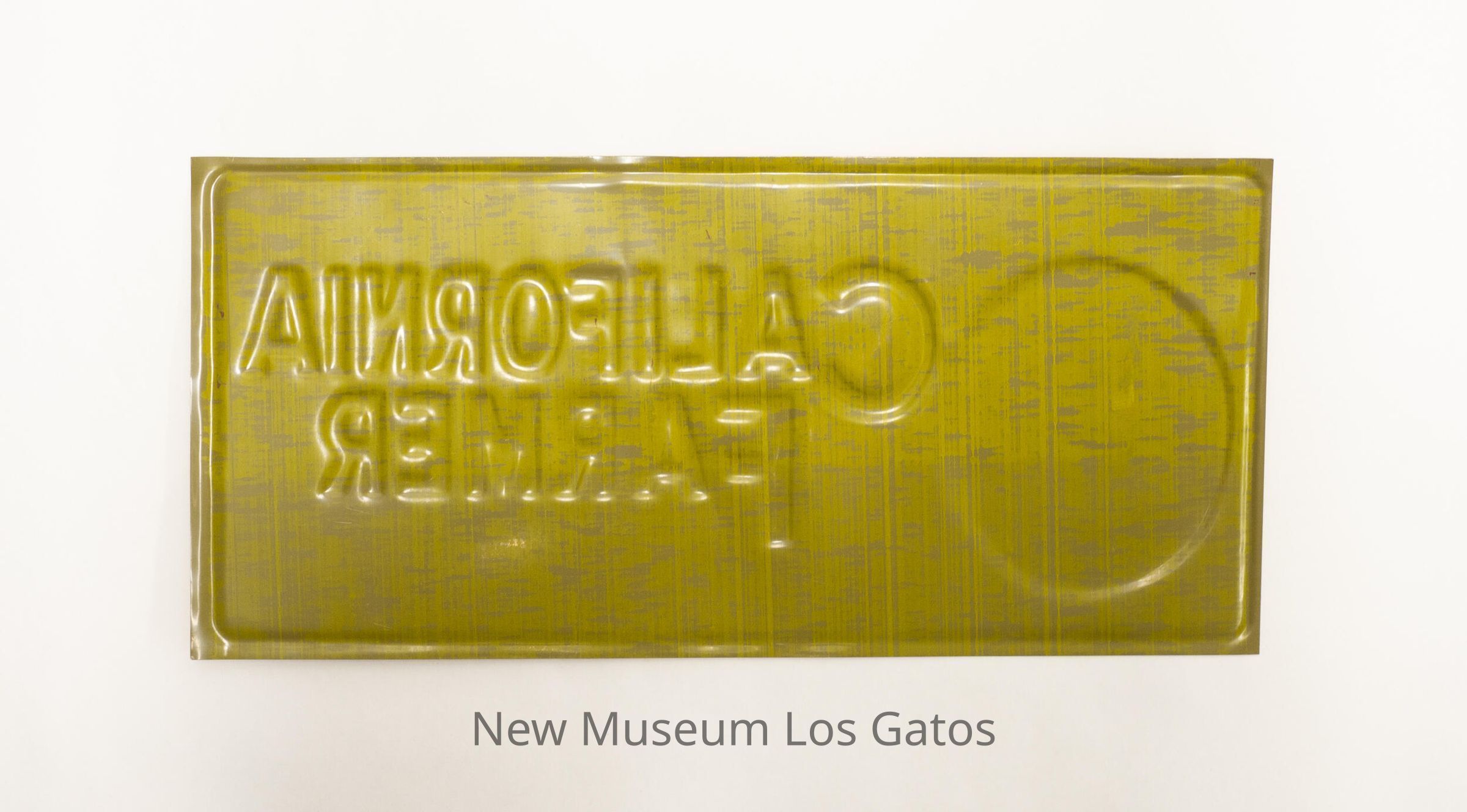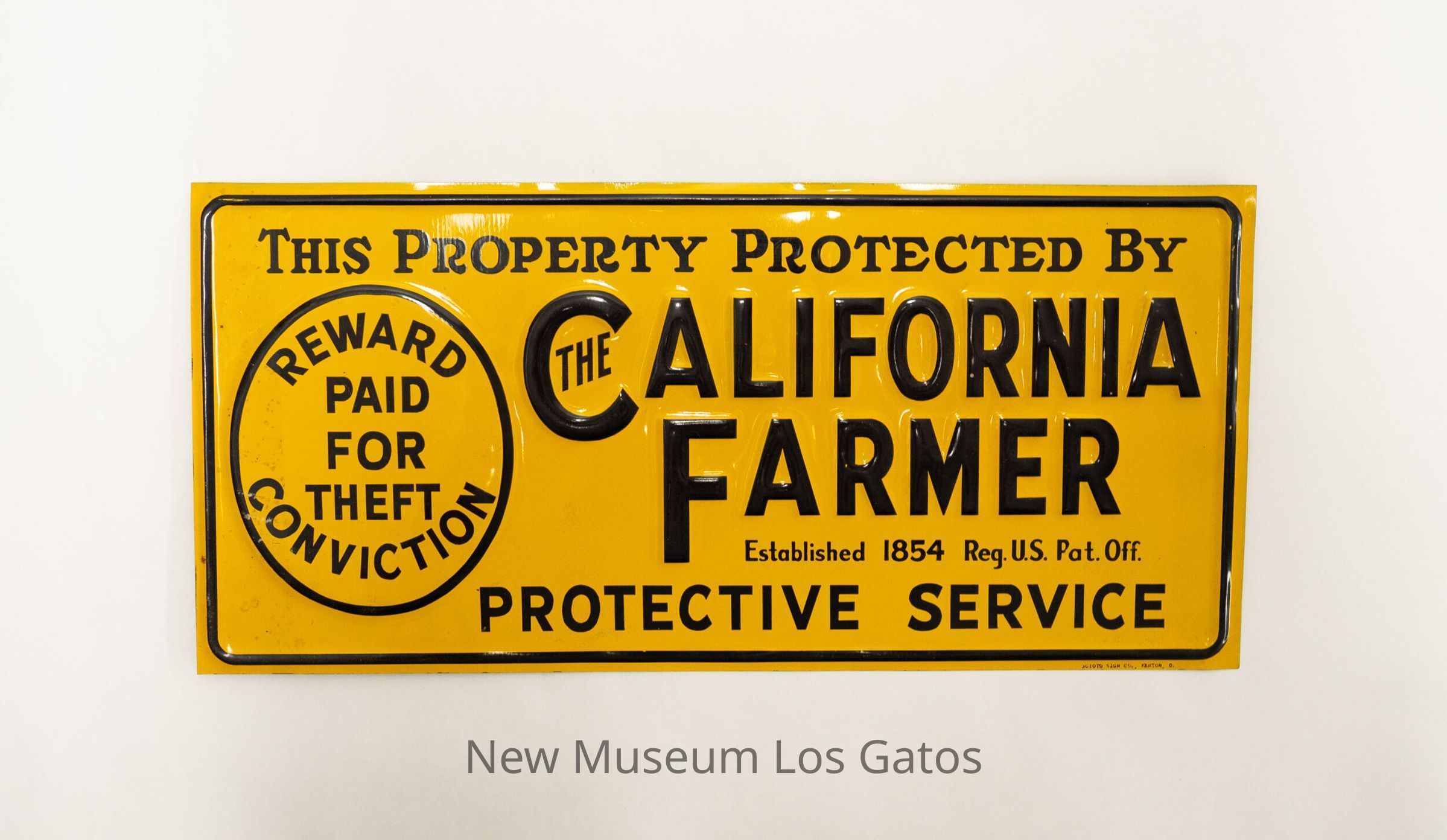 A rectangular, thin metal sign, issued by "The California Farmer" magazine. The background is yellow, and the embossed lettering is black. Details of the inscription can be found below.Collection