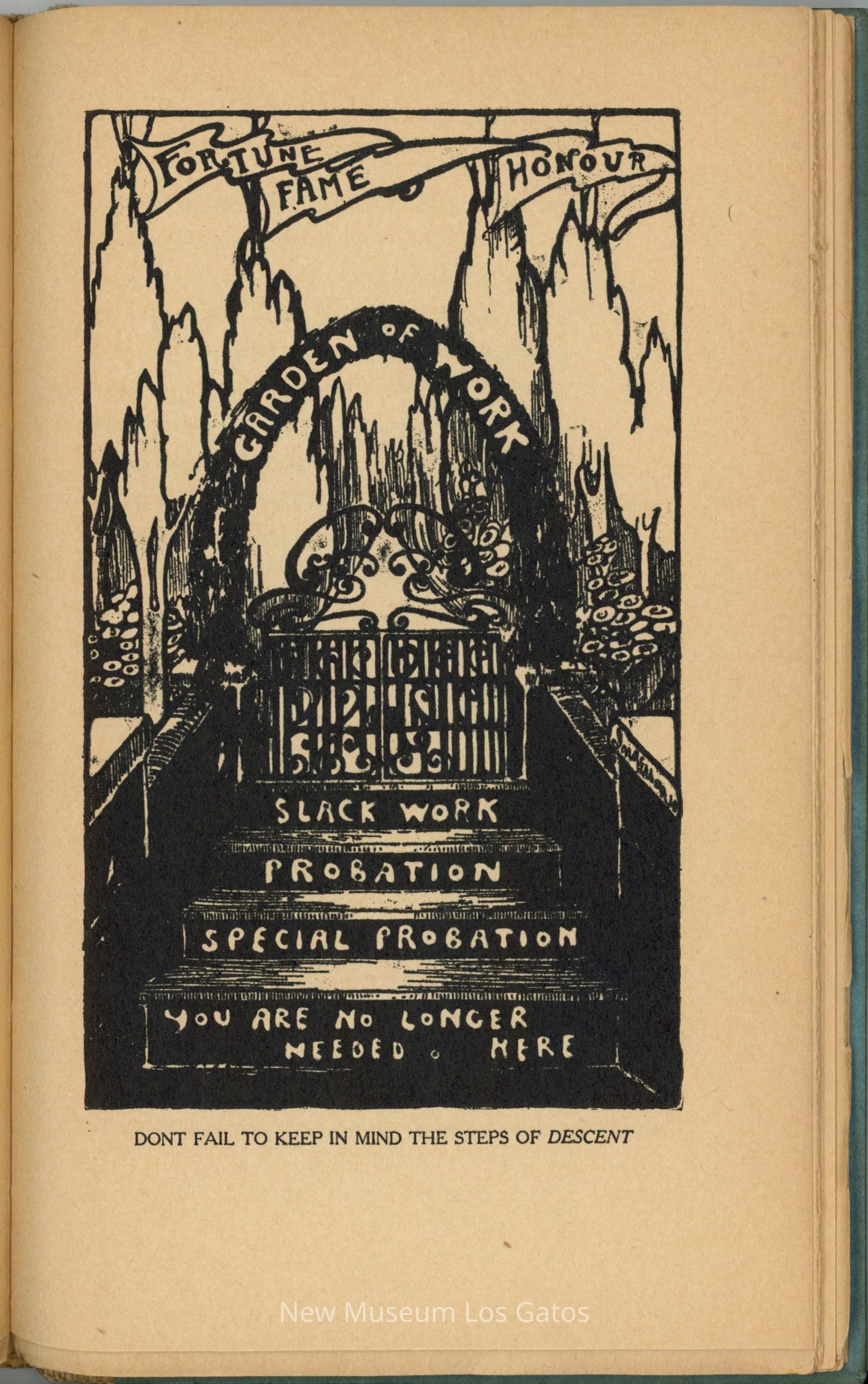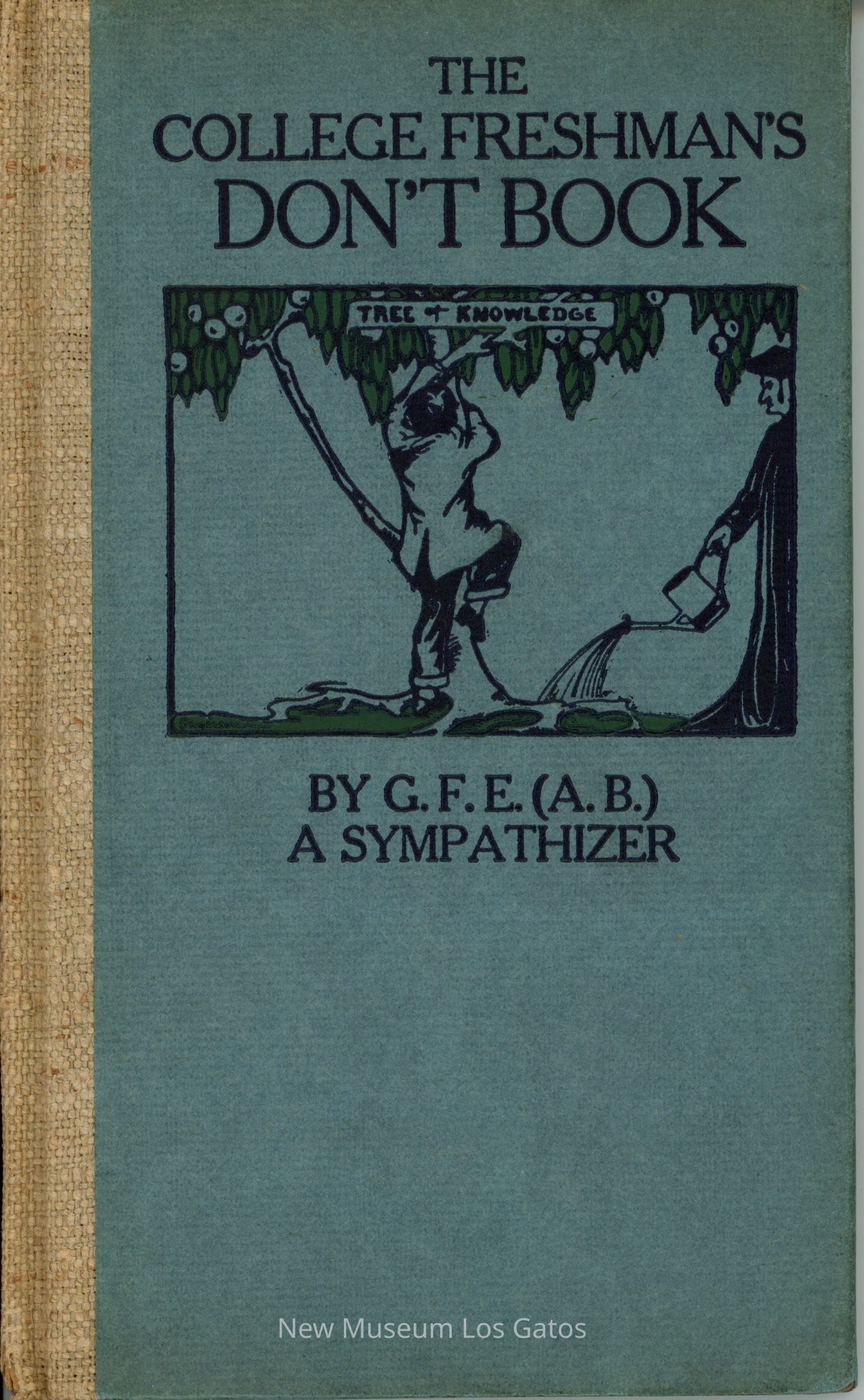 A small, blue paper-bound book, with a brown fabric/woven spine, the contents of which feature tips and tricks for attending university. The front cover features an illustration of a person climbing the 'Tree of Knowledge,' with another person in robes watering the tree from the right side.Collection