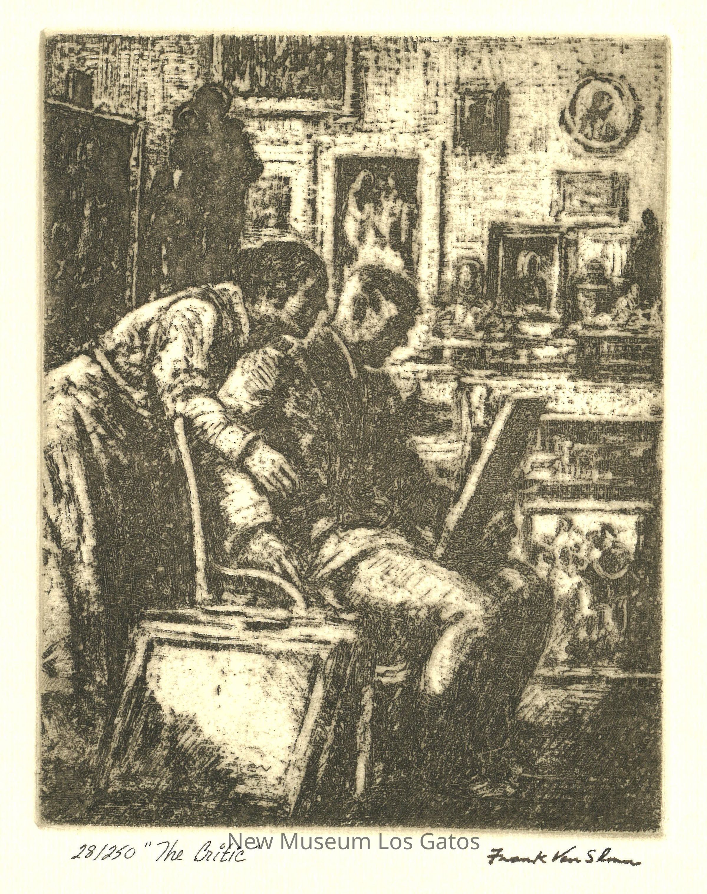 A monochrome print of a seated man looking at a painting on his lap, while a woman looks over his shoulder. There are numerous other paintings and works of art in the room surrounding the pair. The print is hinge mounted onto a mat board.