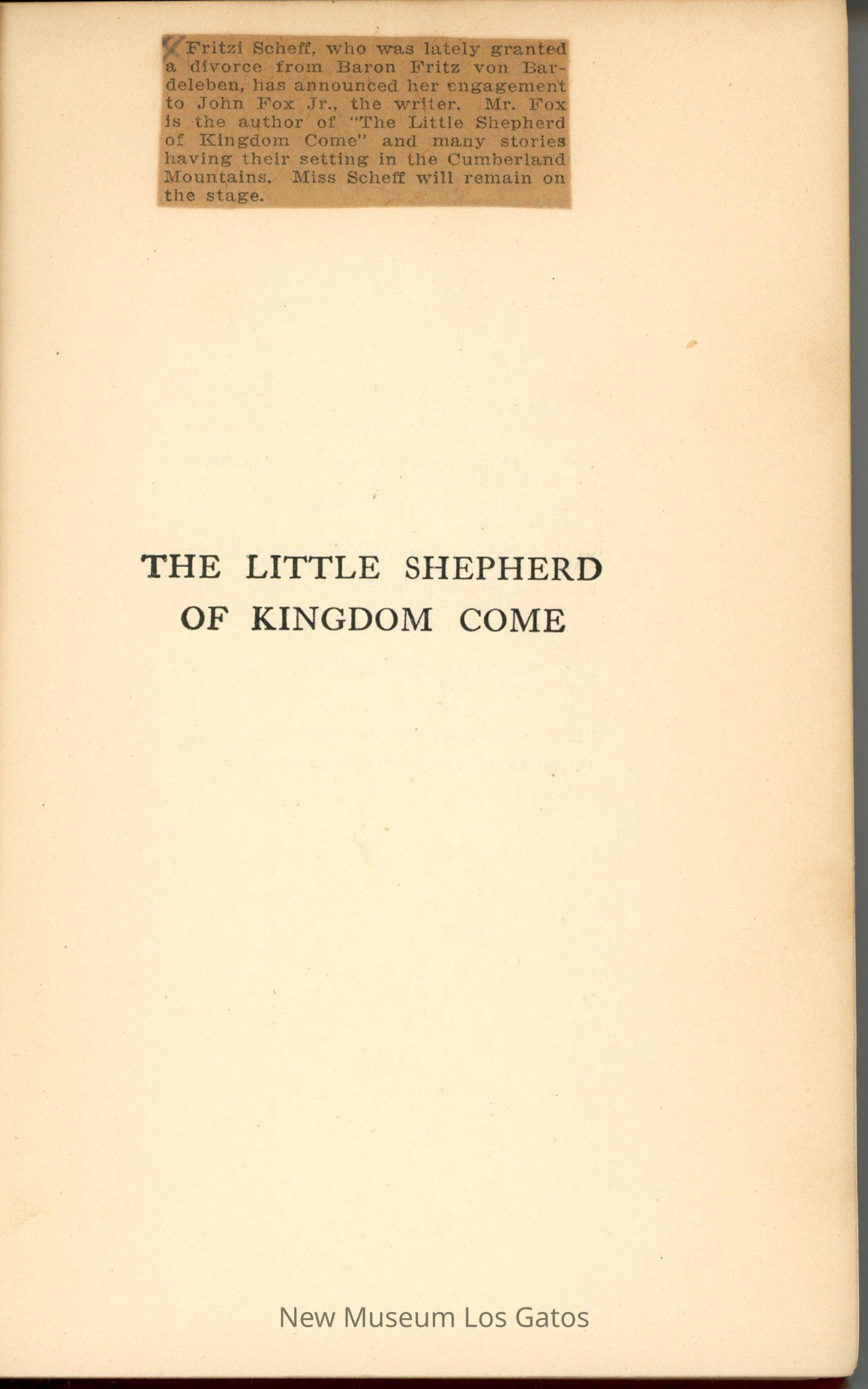 Frtizi Scheff, who was lately granted a divorce from Baron Fritz Von Bardeleben, has announced her engagement to John Fox Jr., the writer. Mr. Fox is the author of "The Little Shepherd of Kingdom Come" and many stories having the setting the Cumberland Mountains. Miss Scheff will remain on the stage.
