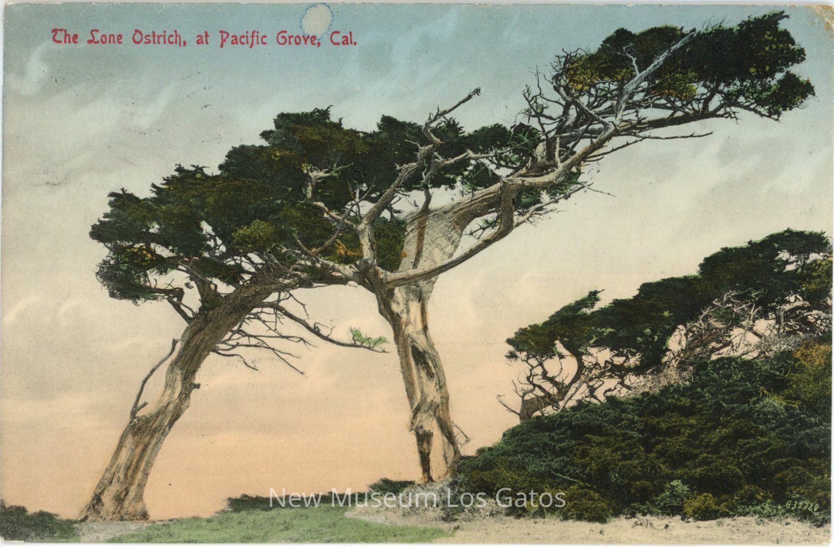 A postcard with a colorized photograph of a pair of trees called "The Lone Ostrich," in Pacific Grove, California. The postcard has been mailed, and includes an addressee, a stamp, and a sender.Subject Place