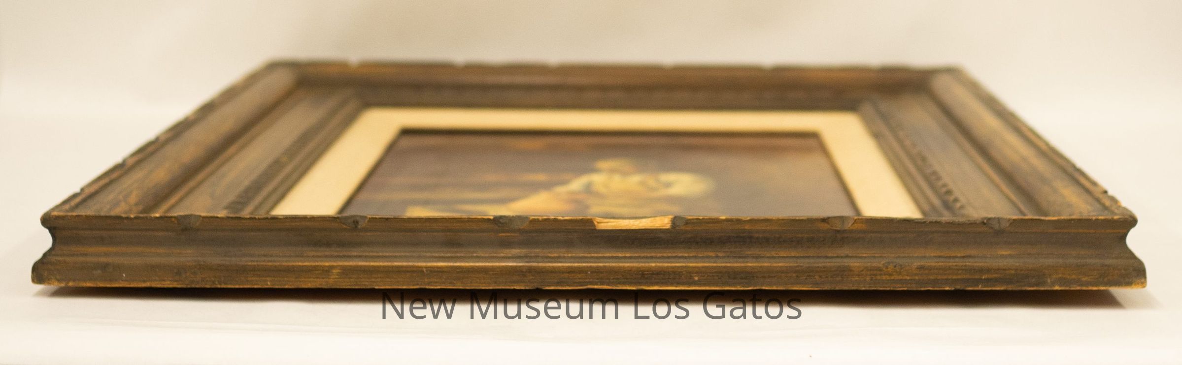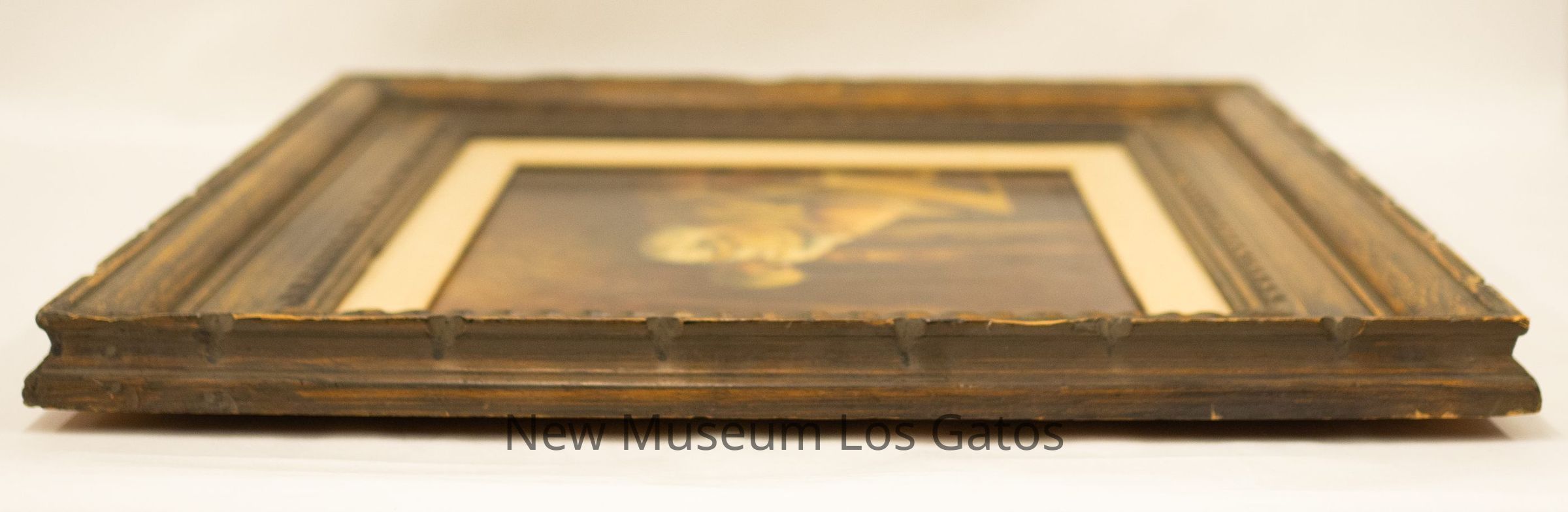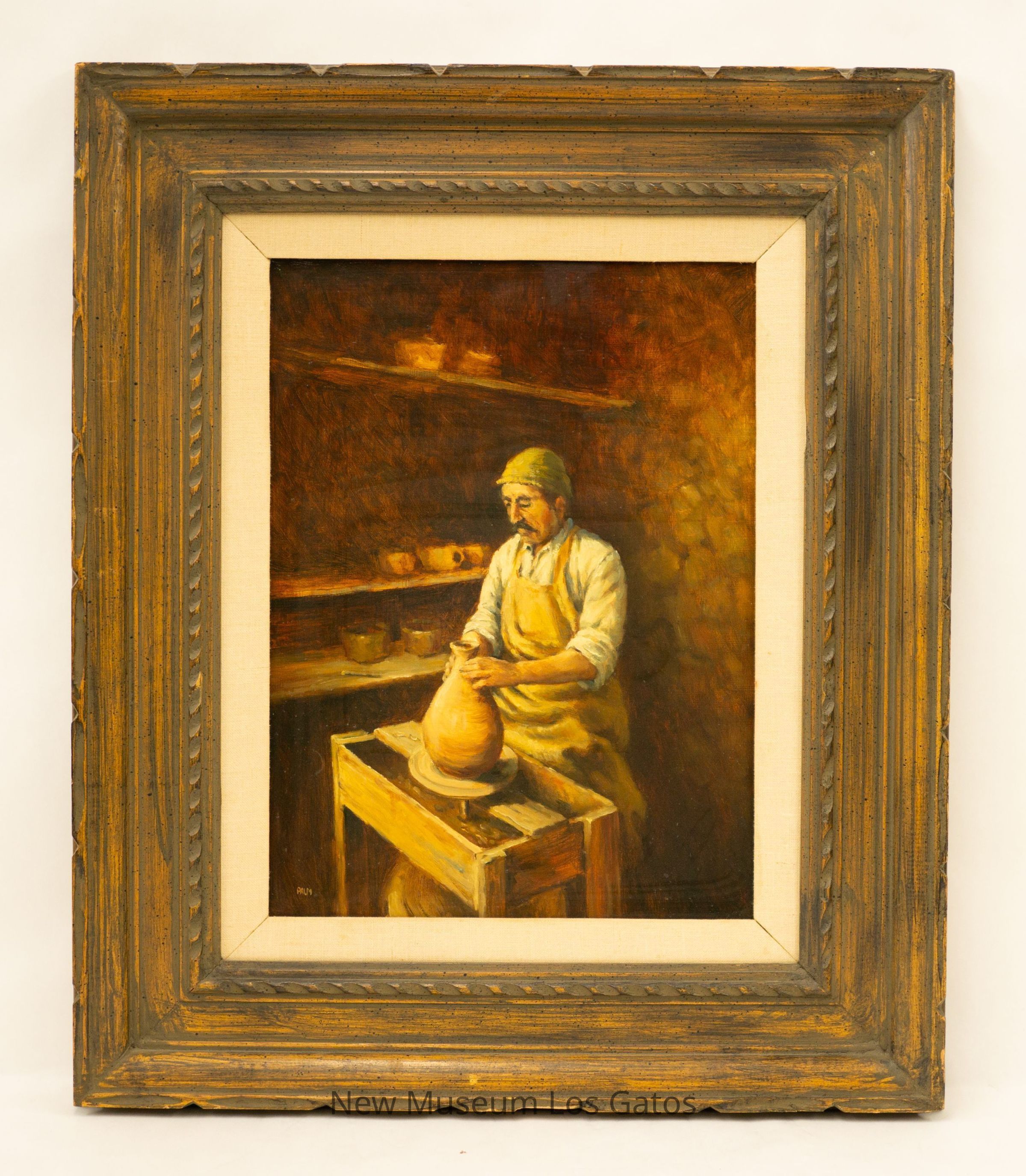 A painting of a man throwing a vessel on a pottery wheel in a wooden frame.