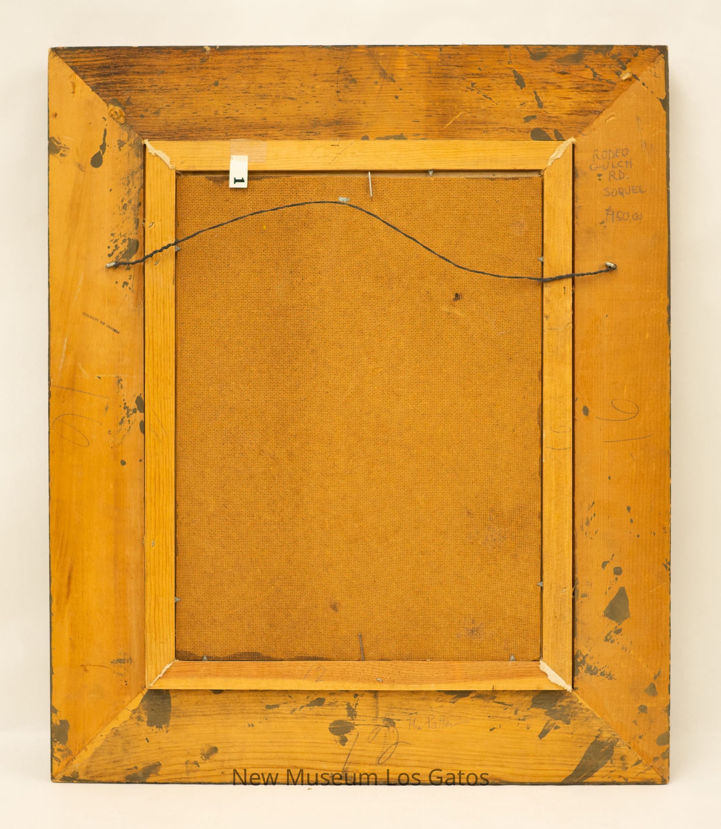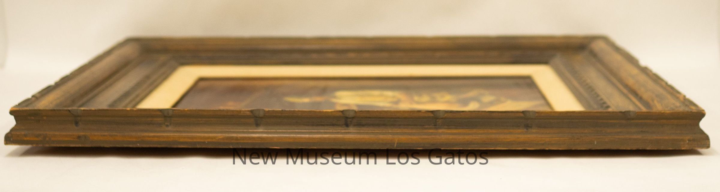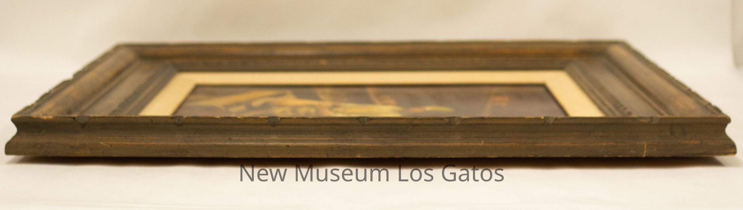 A painting of a man throwing a vessel on a pottery wheel in a wooden frame.