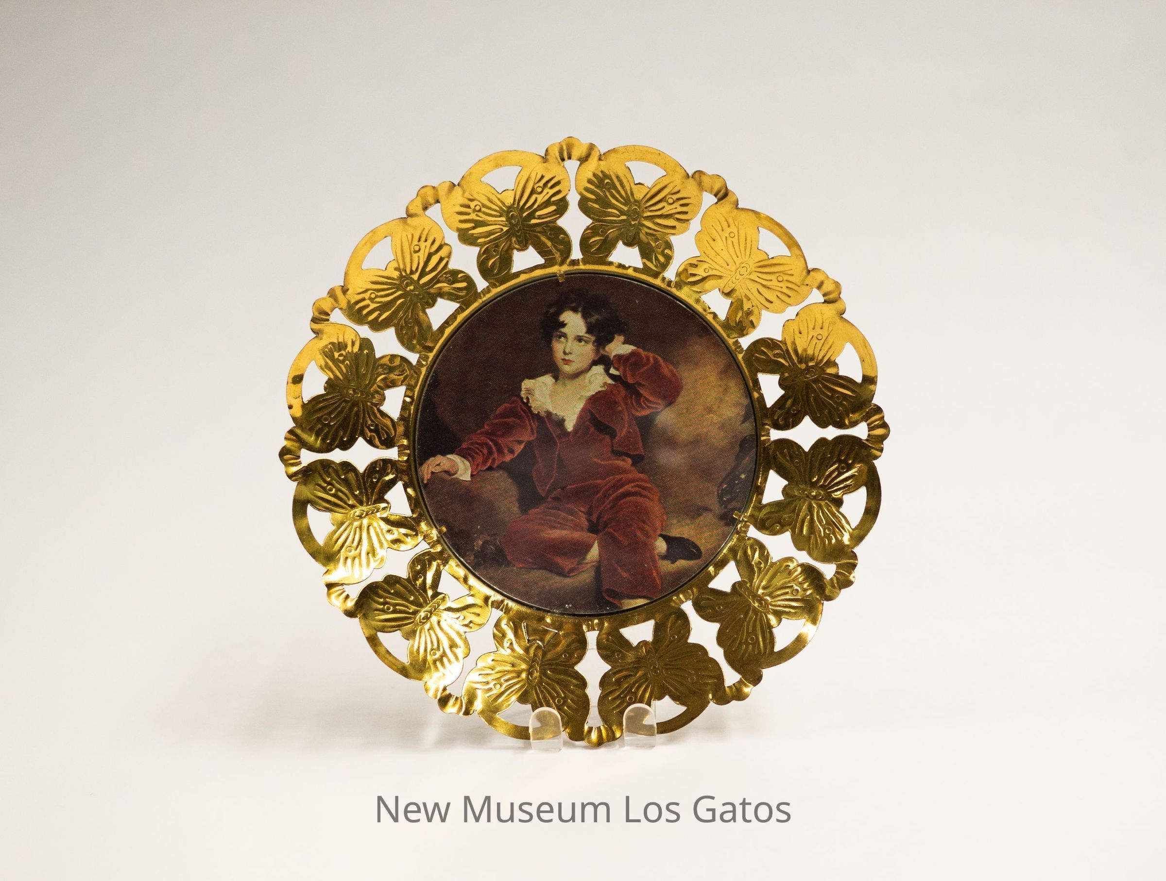A brass decorative wall hanging, featuring a reproduction of Sir Thomas Lawrence's painting "The Red Boy" in the center. The painting features seven year old Charles William Lambton, dressed in red, sitting on a brown chair with one leg underneath him, and an arm resting on his head. The print is surrounded by connecting brass butterflies.Collection