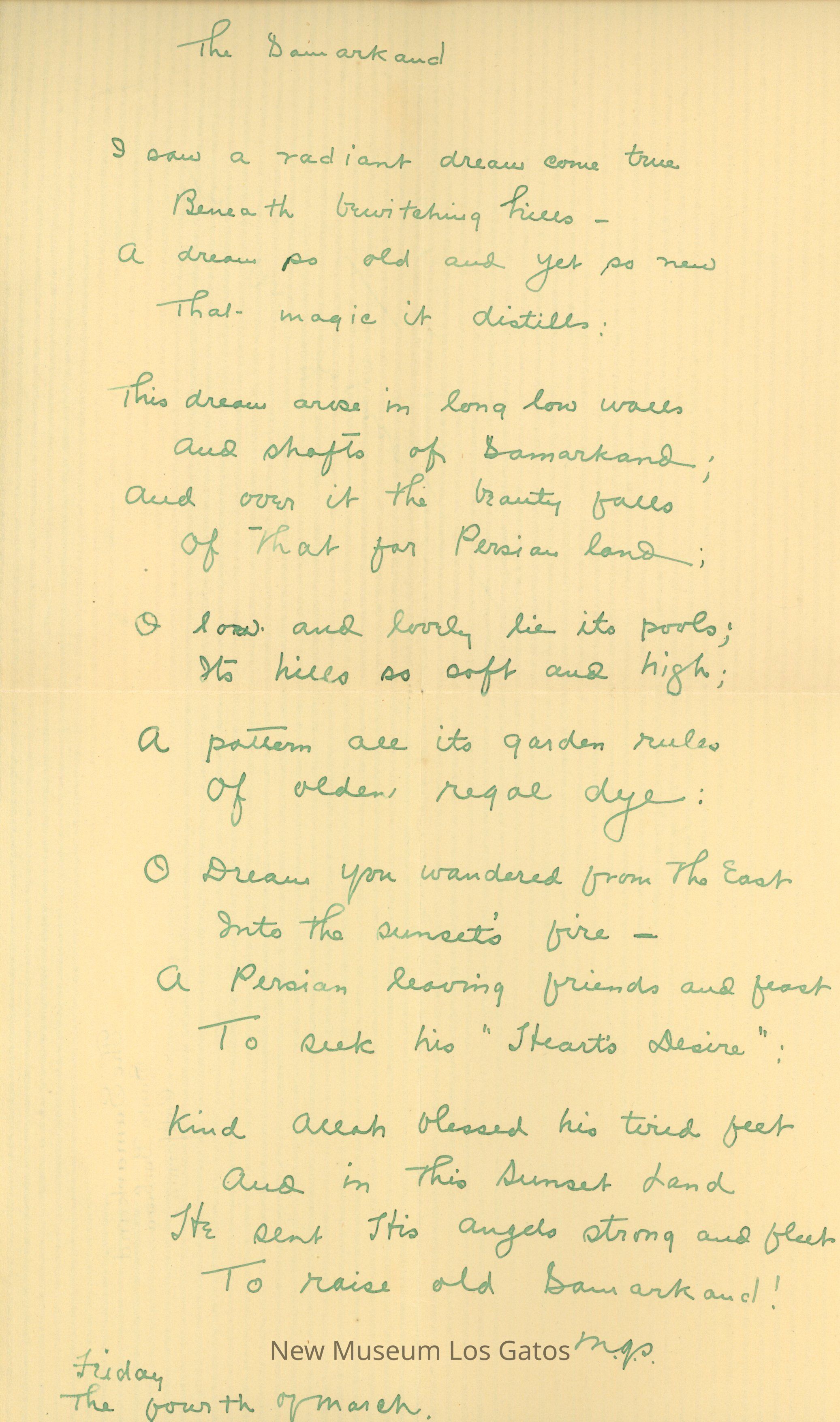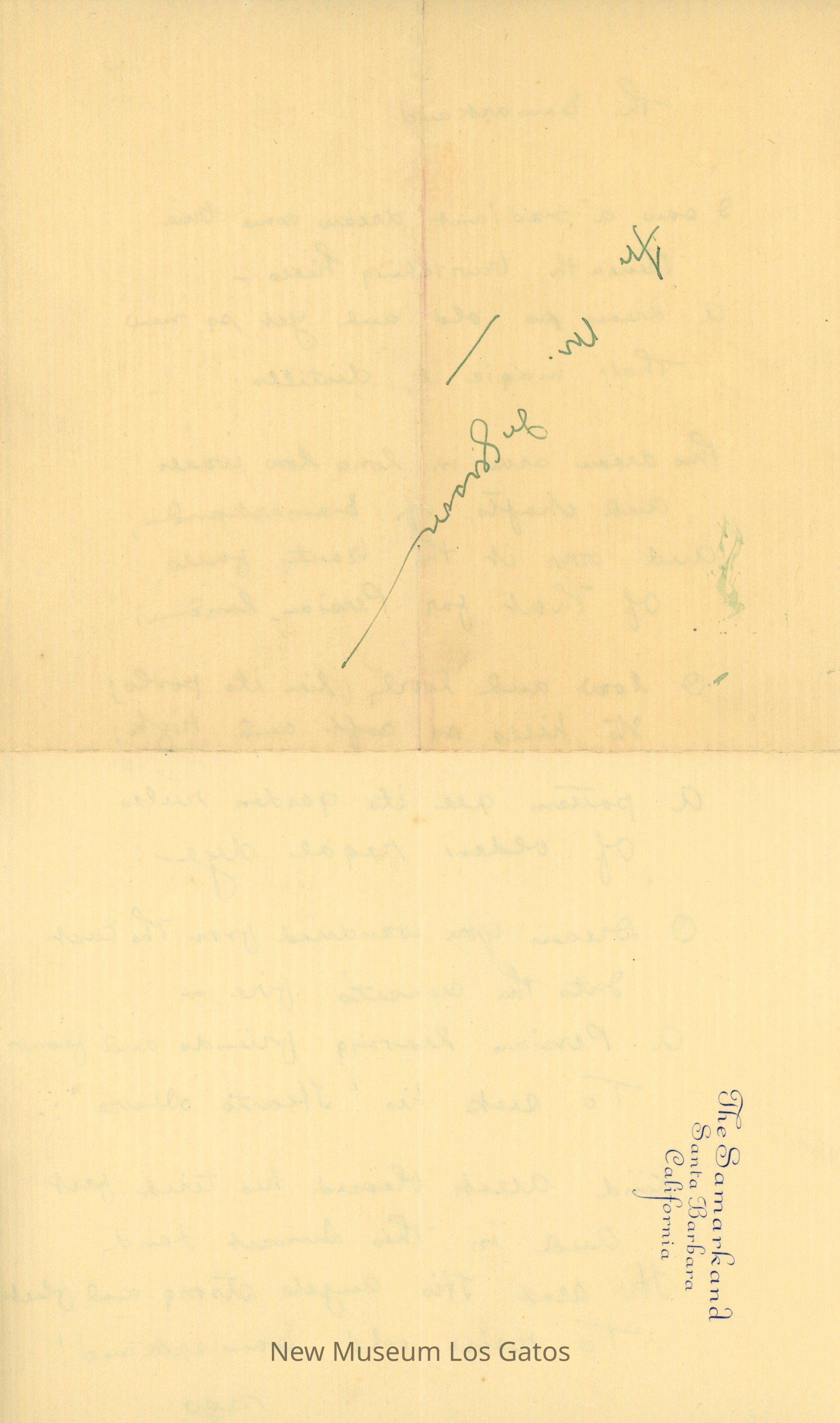 Single page poem about the Samarkand Hotel in Santa Barbara, California. The poem is attributed to "M.G.," or "M.G.S," and dated Friday, March 4th (unknown year). The letter is handwritten onto The Samarkand stationery. The poem is addressed to Frank Ingerson on the reverse side. The poem is 5 stanzas long.Collection