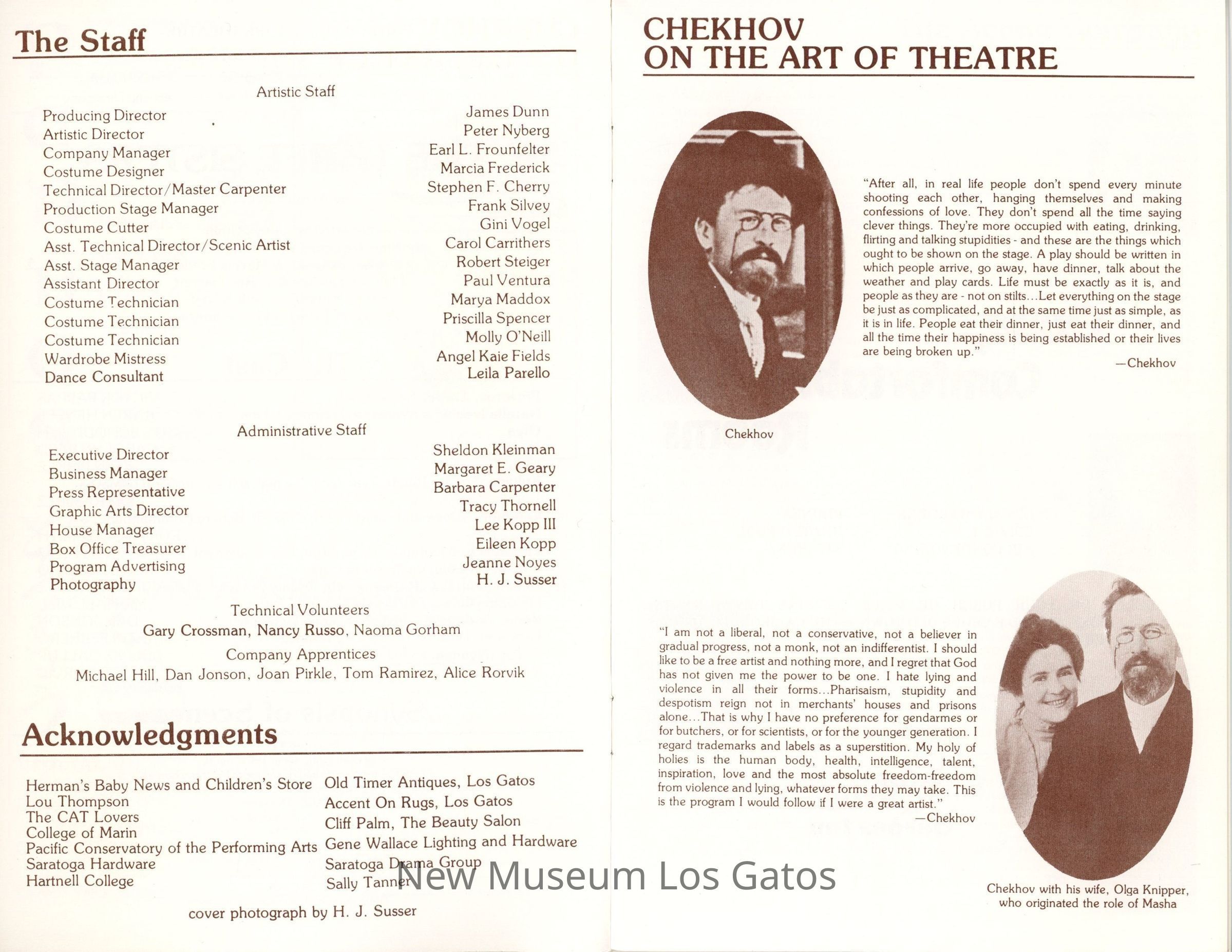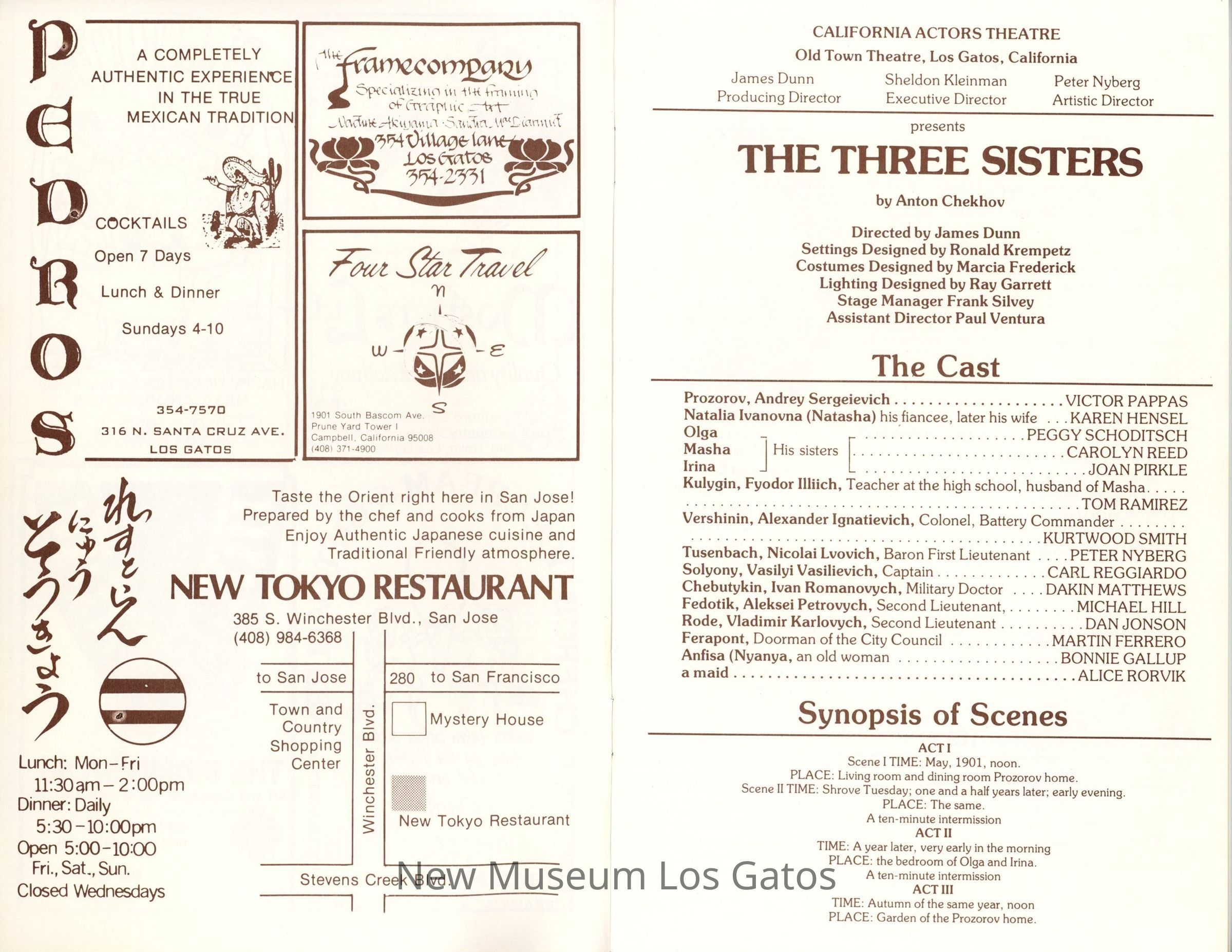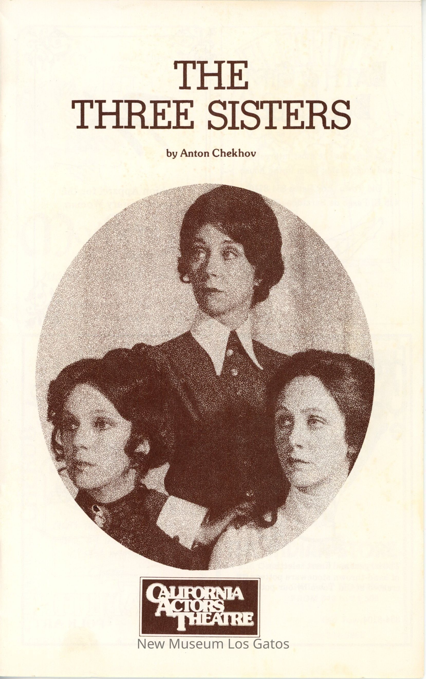 The show program/playbill for the California Actors Theatre 1976 production of "The Three Sisters." The program includes advertisements, a full cast list, bios and headshots of the company, information on the upcoming production, as well as a chronology of and quotes by Chekov.Collection