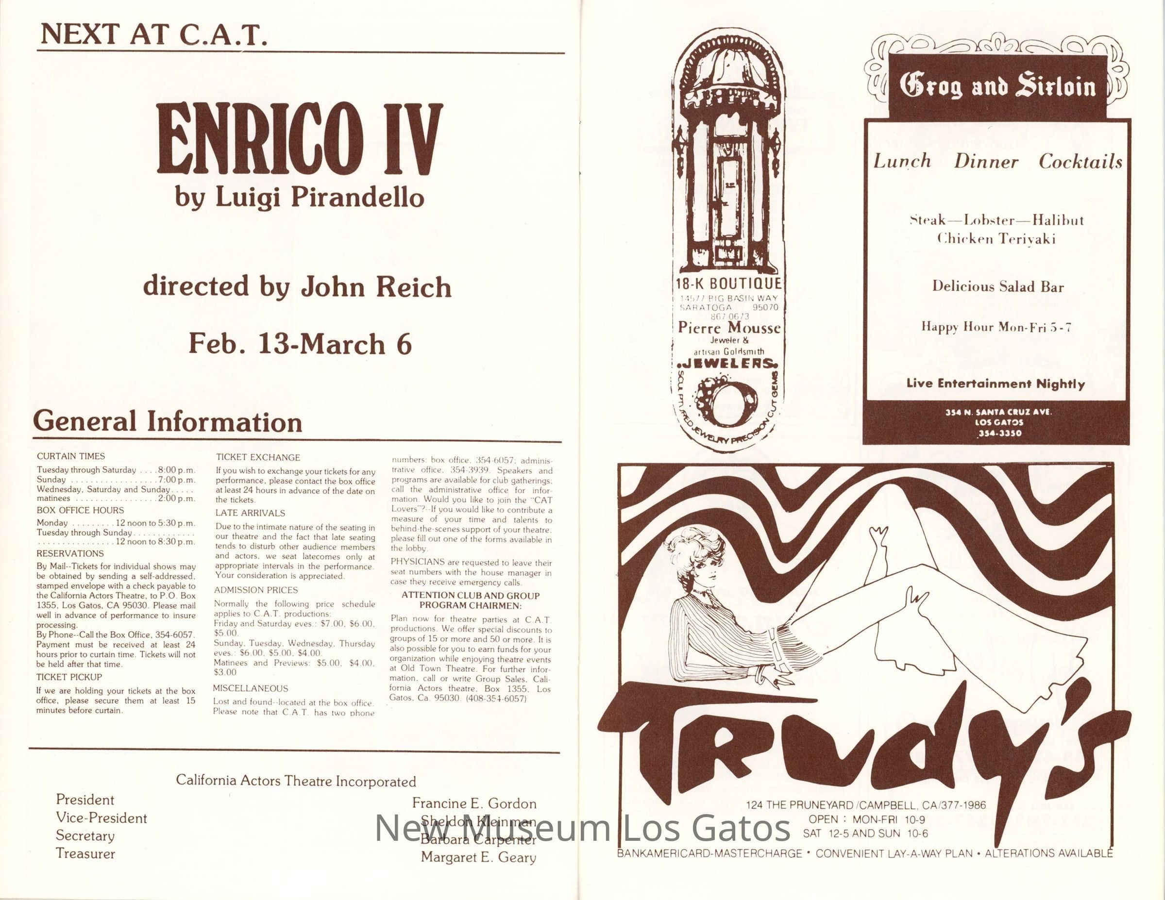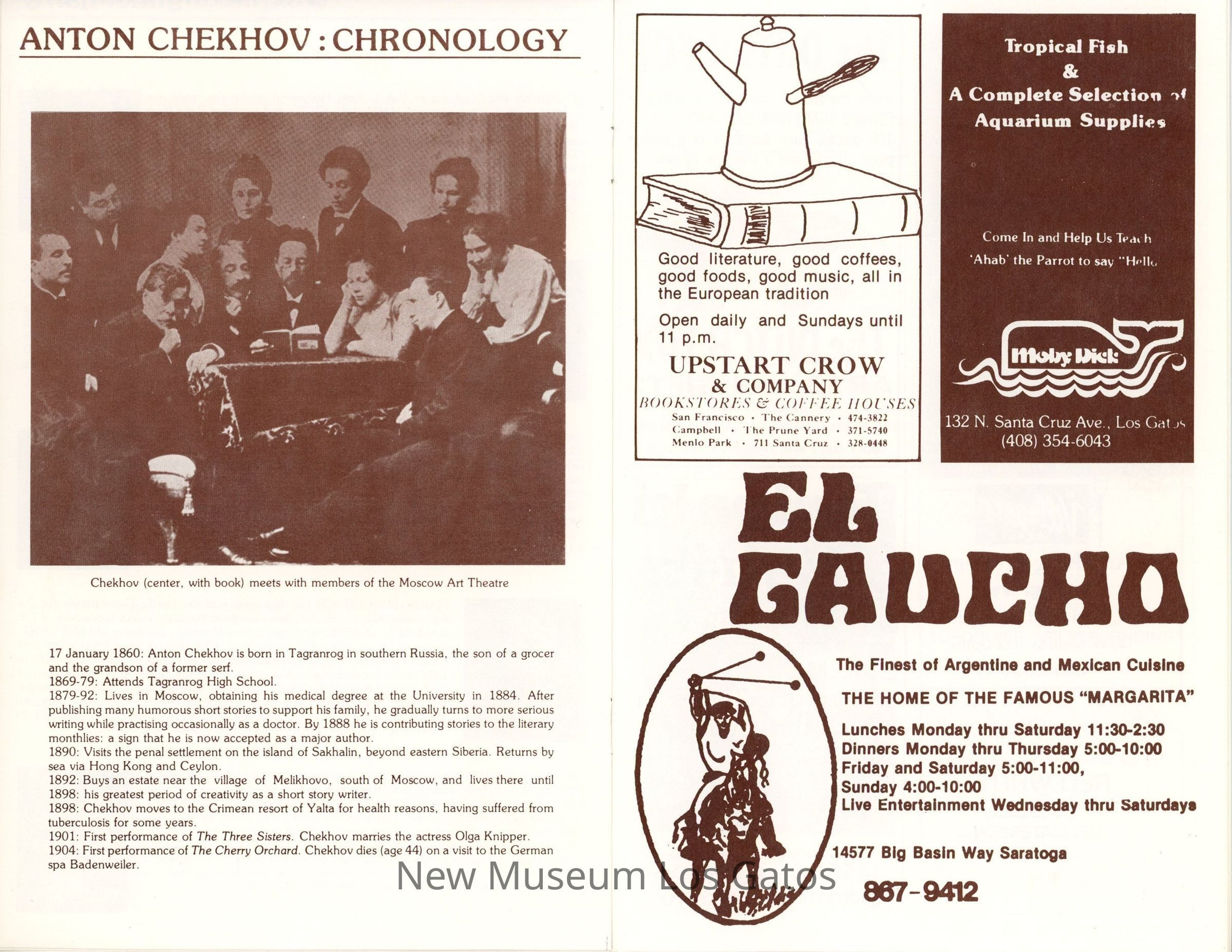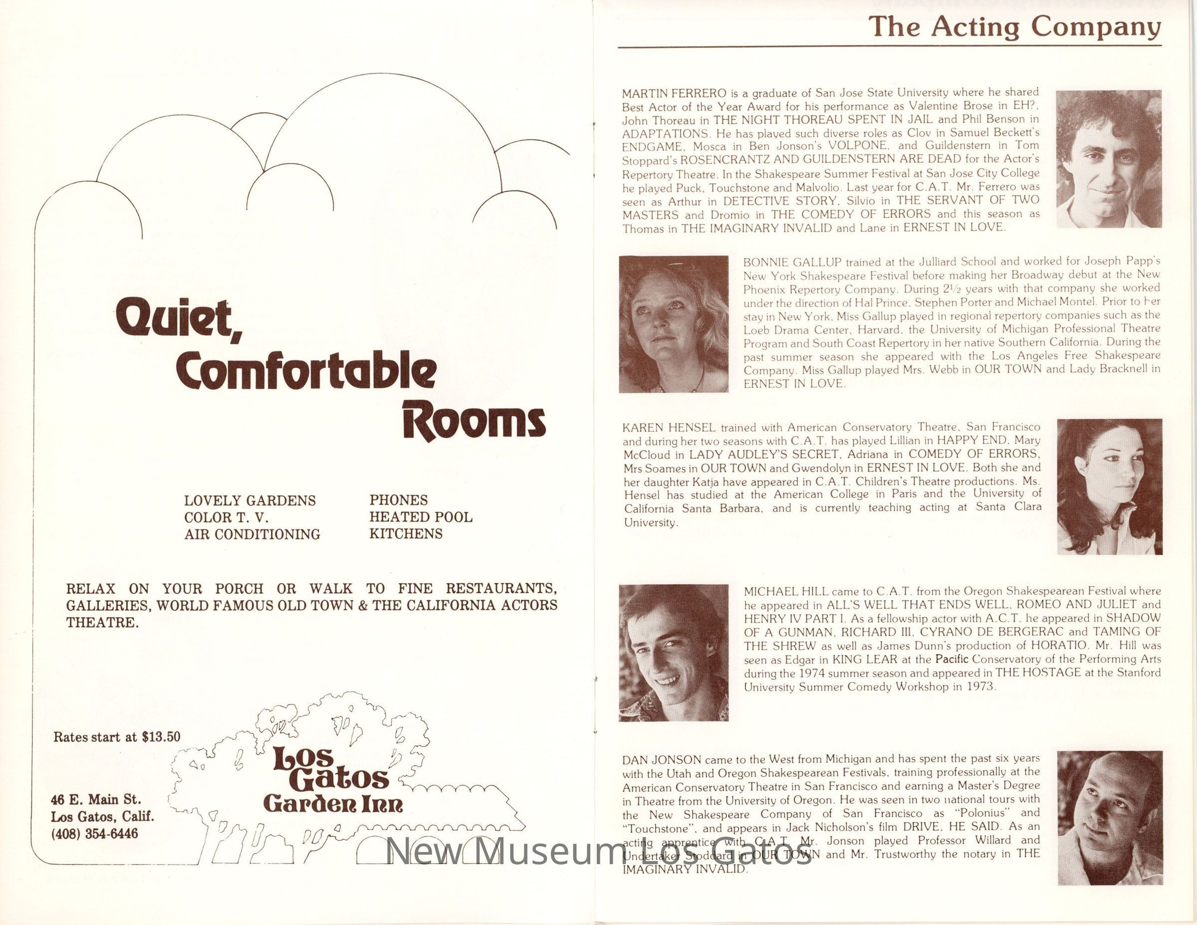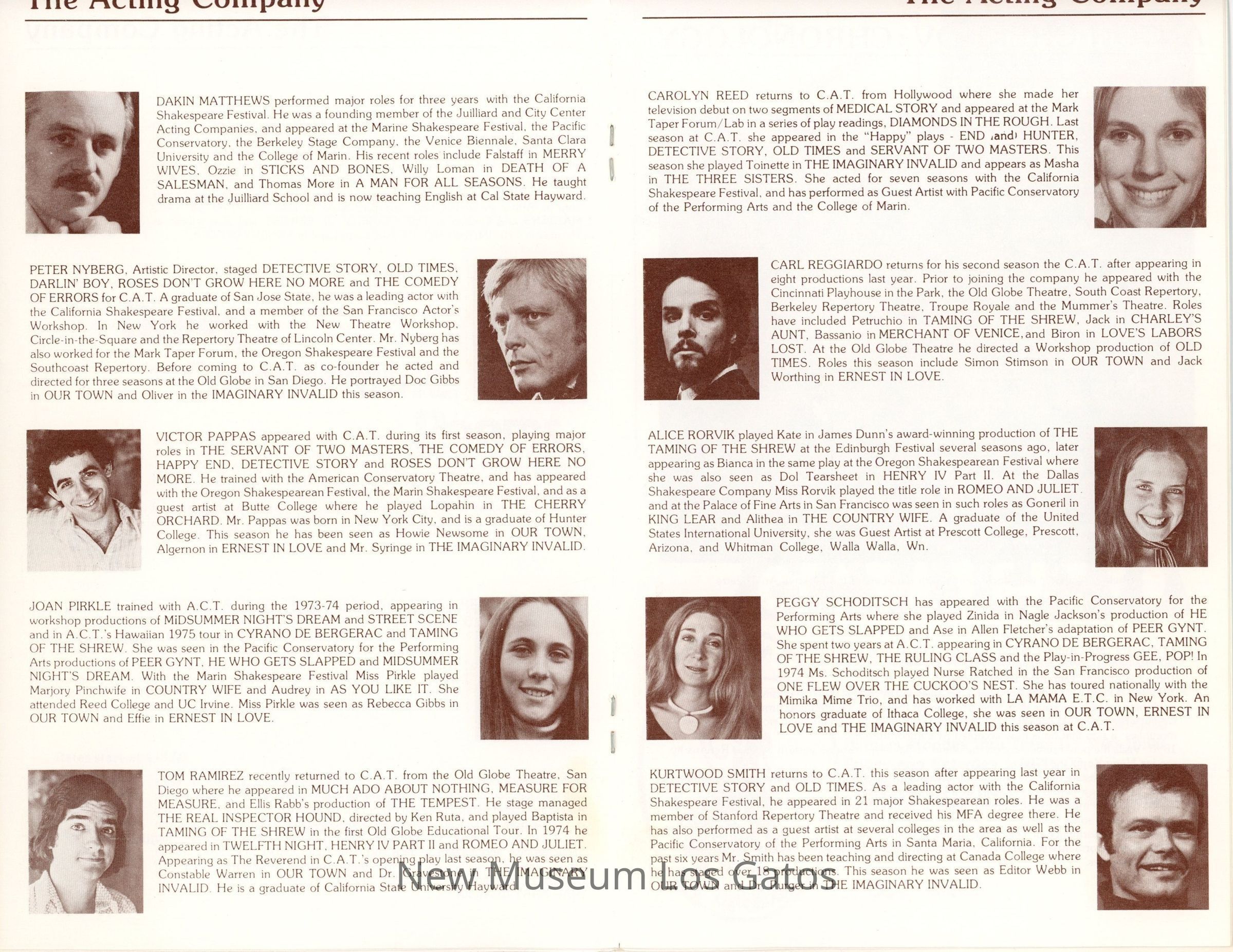 The show program/playbill for the California Actors Theatre 1976 production of "The Three Sisters." The program includes advertisements, a full cast list, bios and headshots of the company, information on the upcoming production, as well as a chronology of and quotes by Chekov.Collection