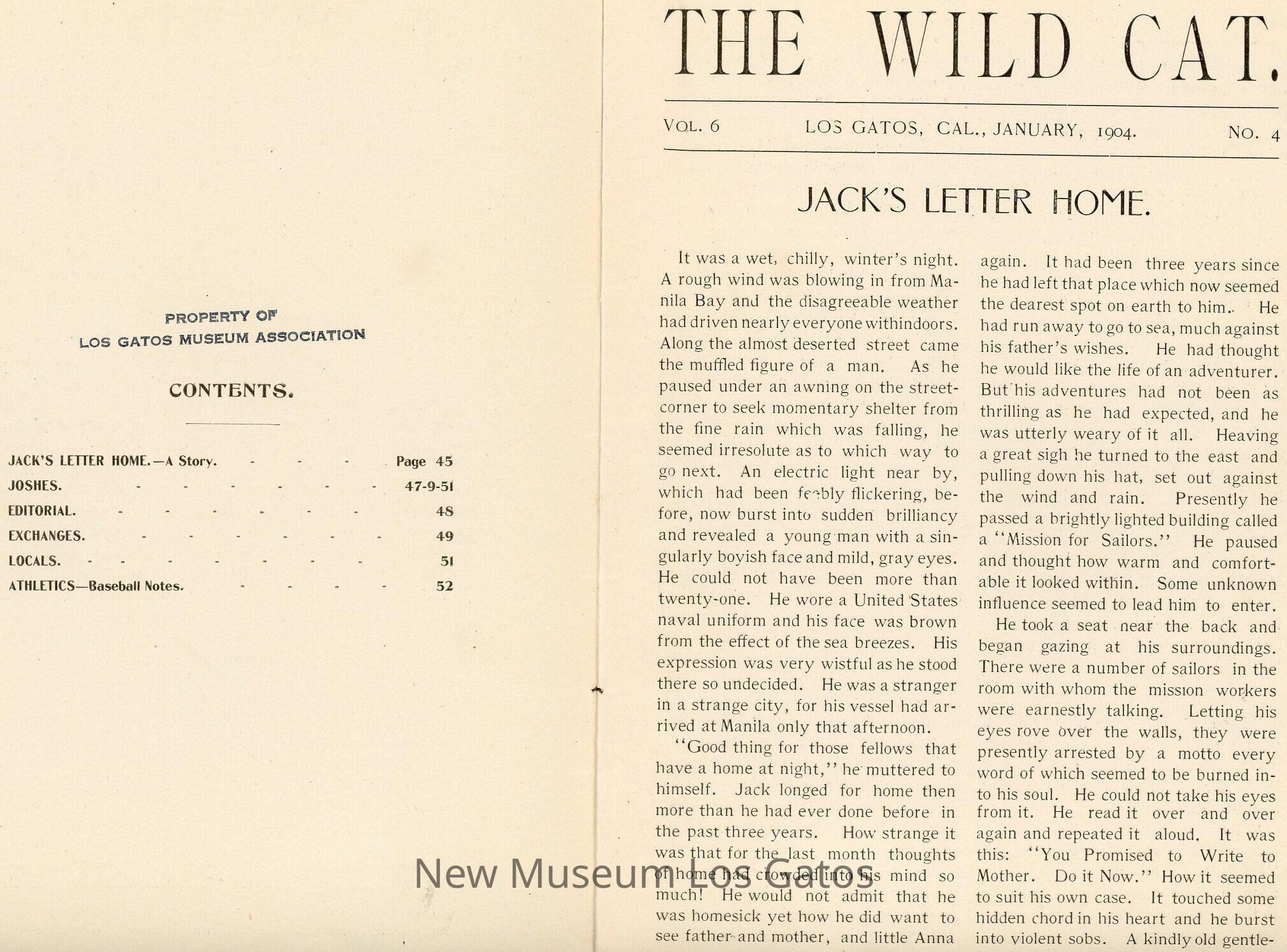 The Wildcat, a literary magazine/yearbook published by the students of Los Gatos High School, Volume 6, Number 4, published January 1904.