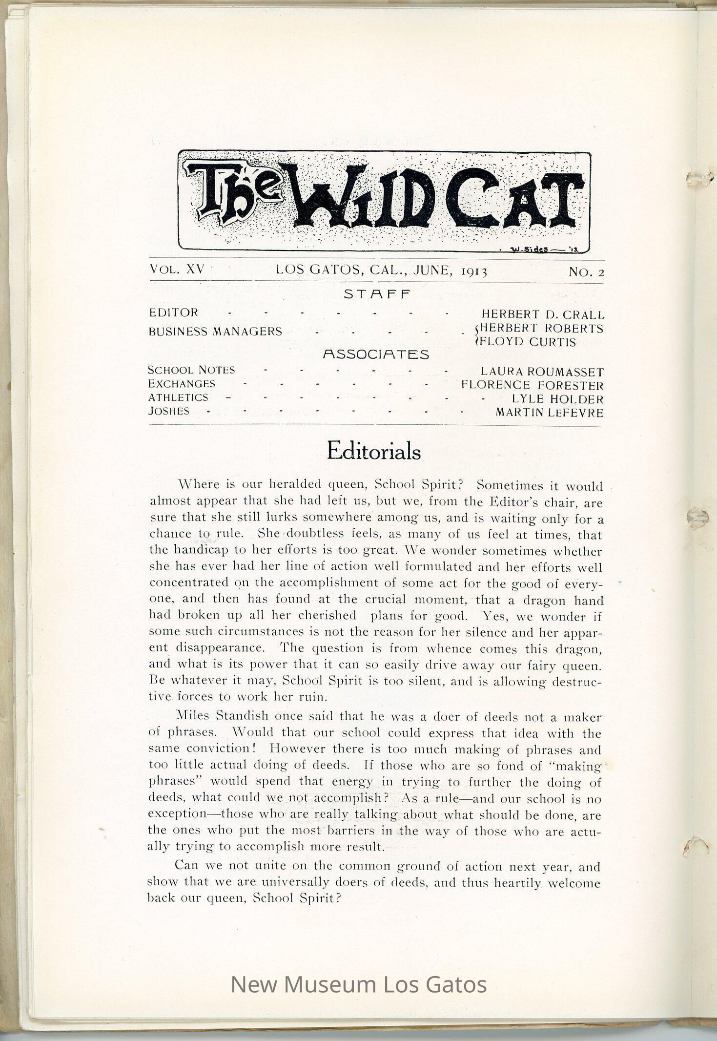 The Wildcat, a literary magazine/yearbook published by the students of Los Gatos High School, Volume 15, Number 2, published June 1913.