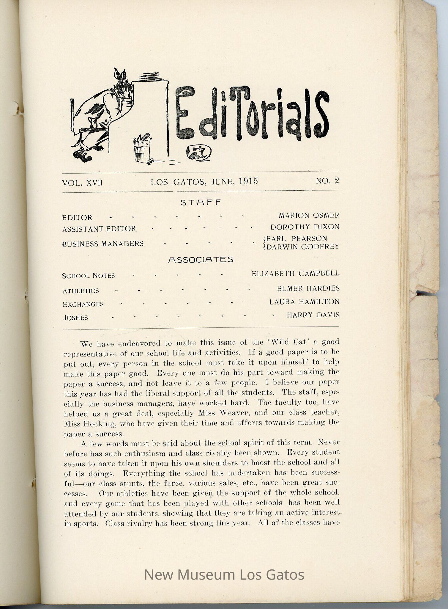The Wildcat, a literary magazine/yearbook published by the students of Los Gatos High School, Volume 17, Number 2, published June 1915.