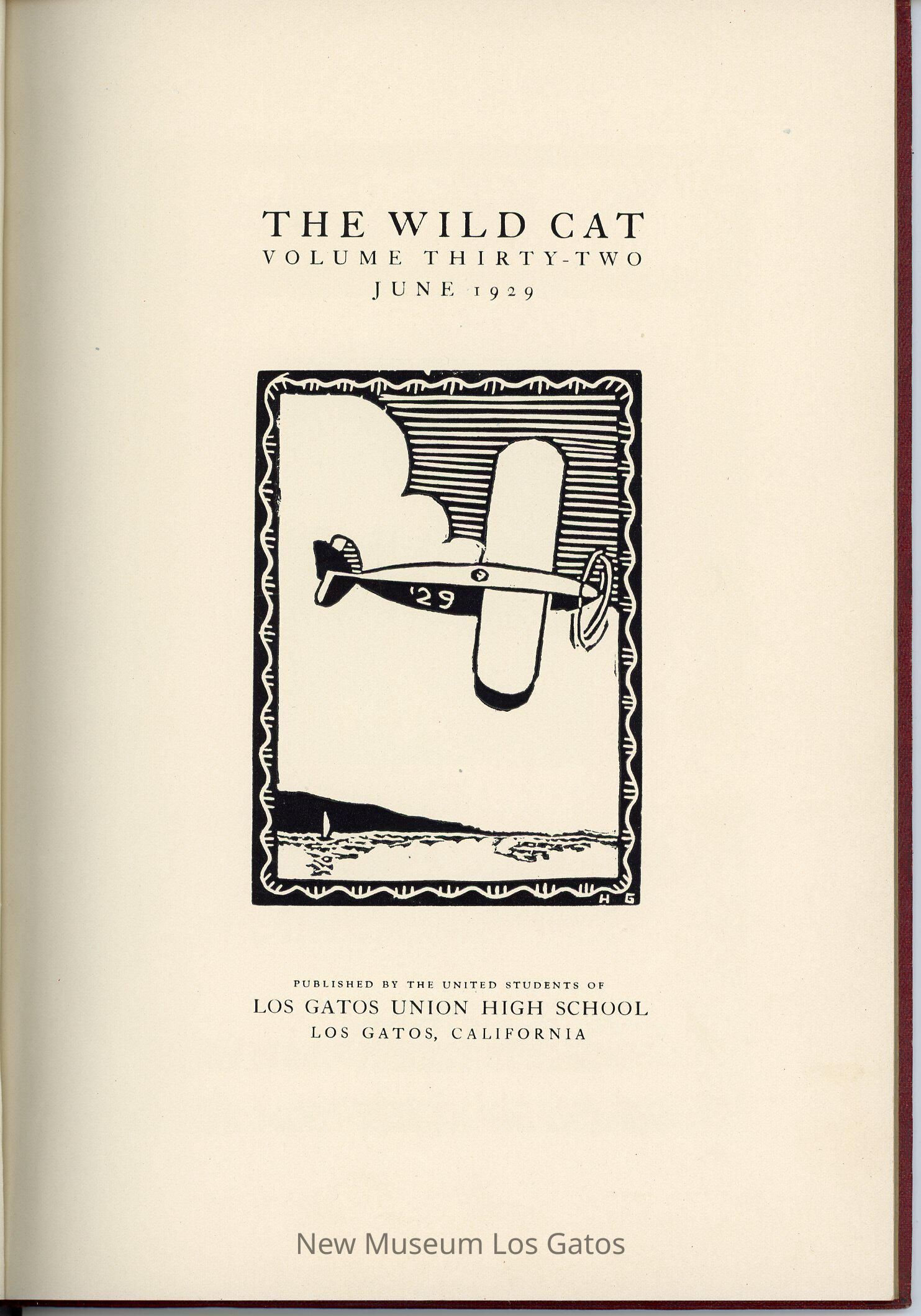 The Wildcat, a hardcover literary magazine/yearbook published by the students of Los Gatos High School in June 1929, volume number 32. Issue number is not specified in this particular issue.