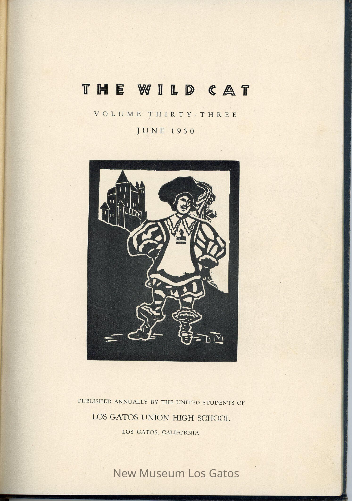 The Wildcat, a hardcover literary magazine/yearbook published by the students of Los Gatos High School in June 1930, volume number 33. Issue number is not specified in this particular issue.