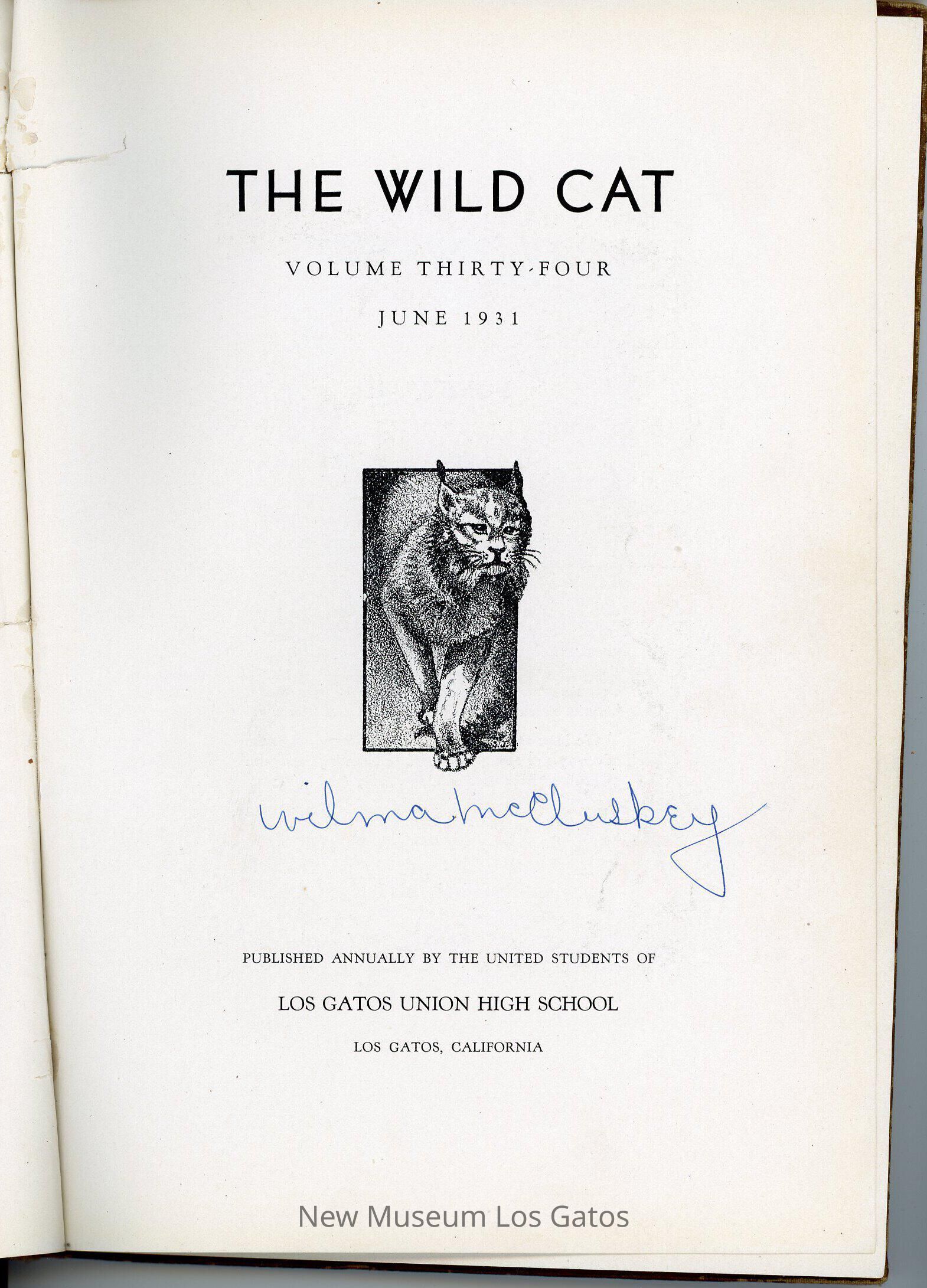 The Wildcat, a hardcover literary magazine/yearbook published by the students of Los Gatos High School in June 1931, volume number 34. Issue number is not specified in this particular issue.