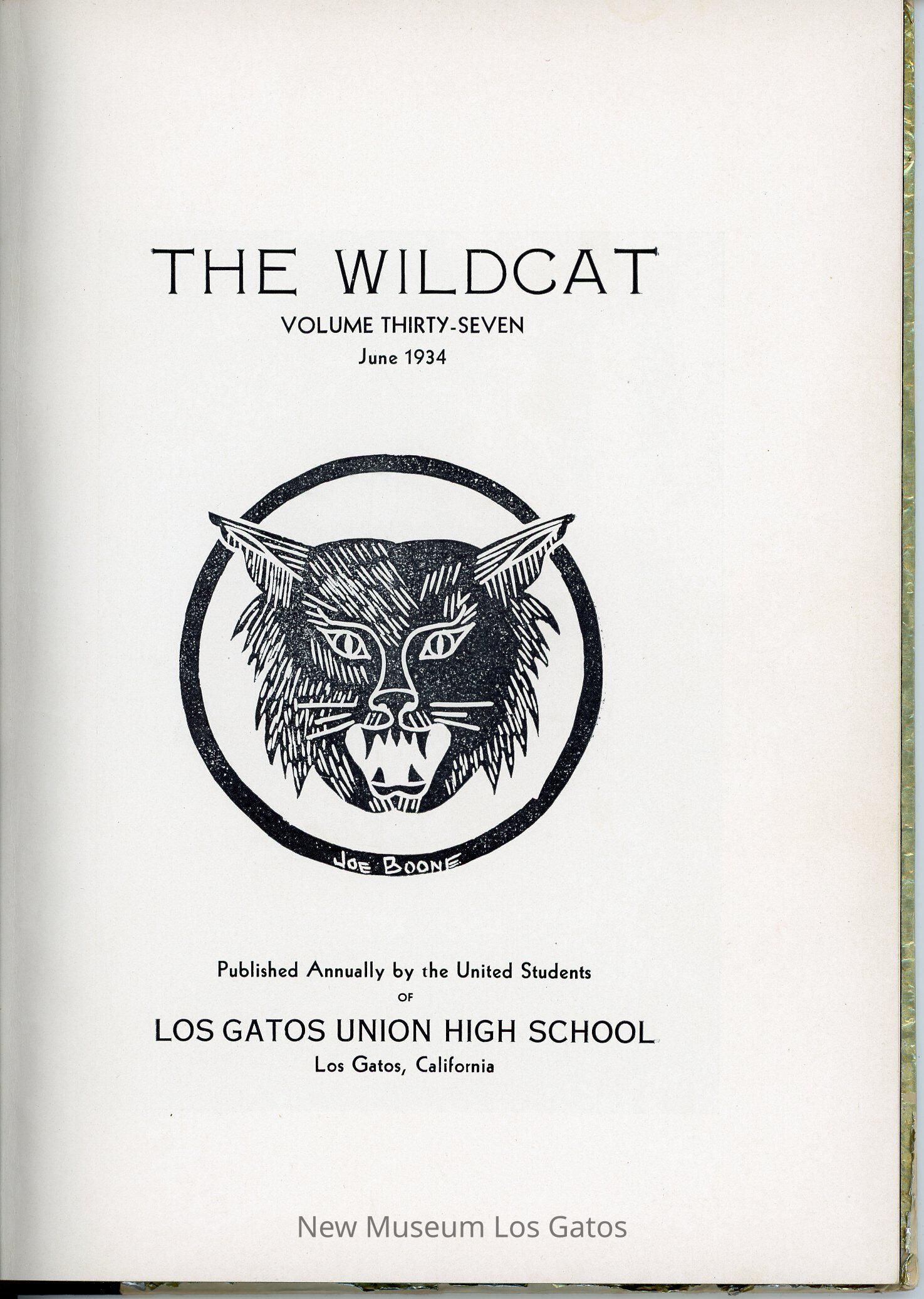 The Wildcat, a hardcover literary magazine/yearbook published by the students of Los Gatos High School in June 1934, volume number 37. Issue number is not specified in this particular issue.