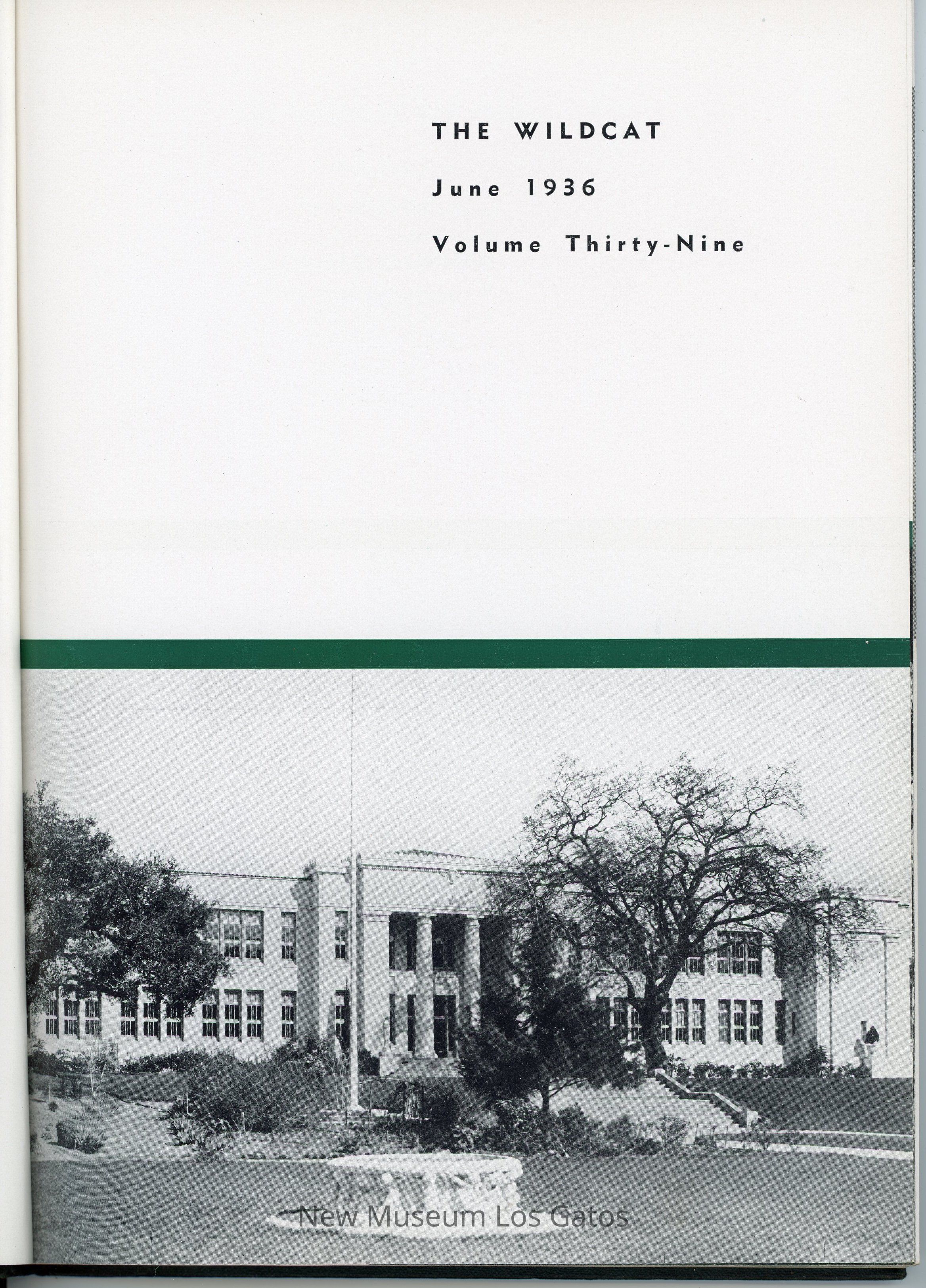 The Wildcat, a hardcover literary magazine/yearbook published by the students of Los Gatos High School in June 1936, volume number 39. Issue number is not specified in this particular issue.