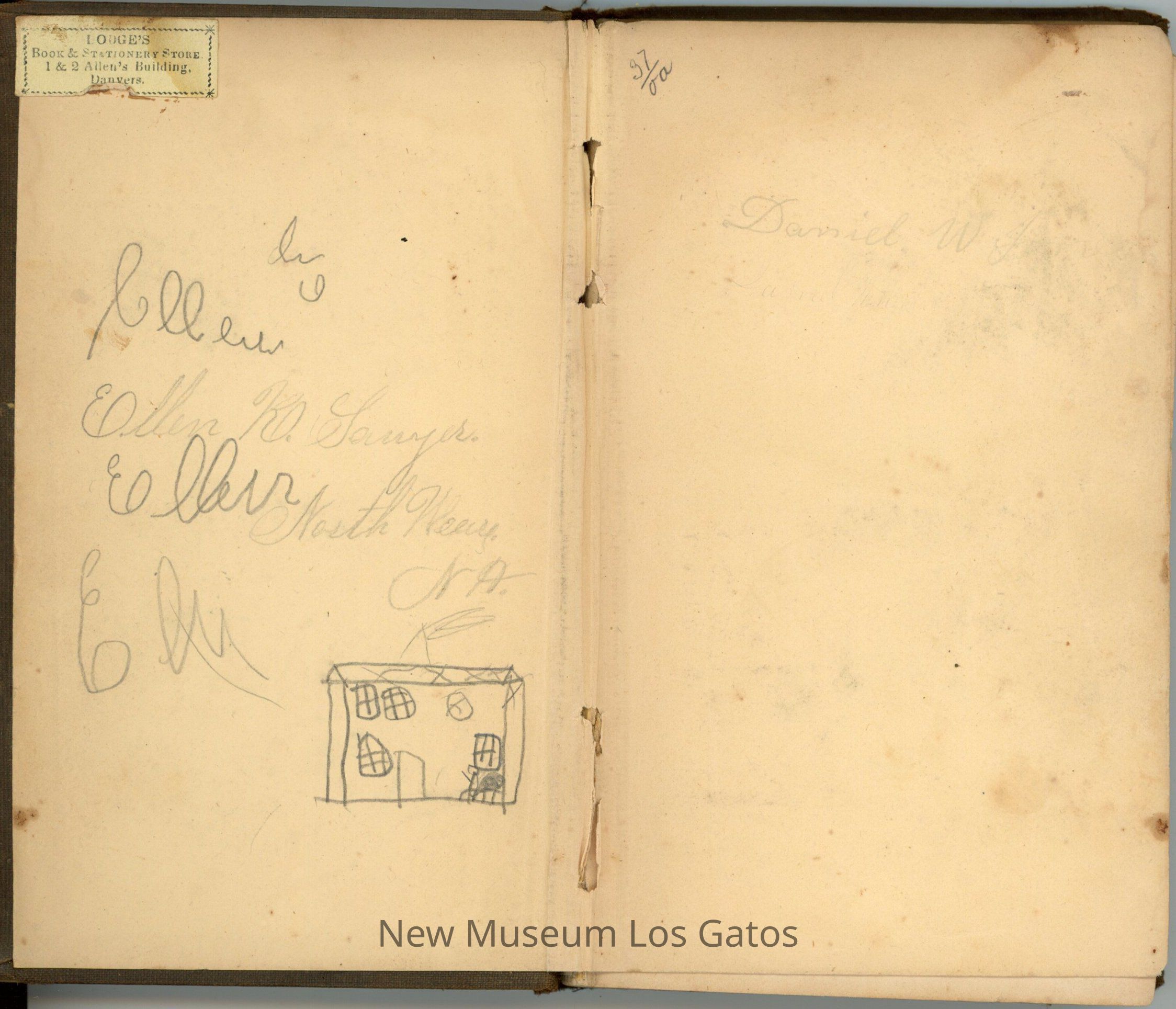 Transcribed are the coherent words; there are also a variety of doodles and a drawing of a building.