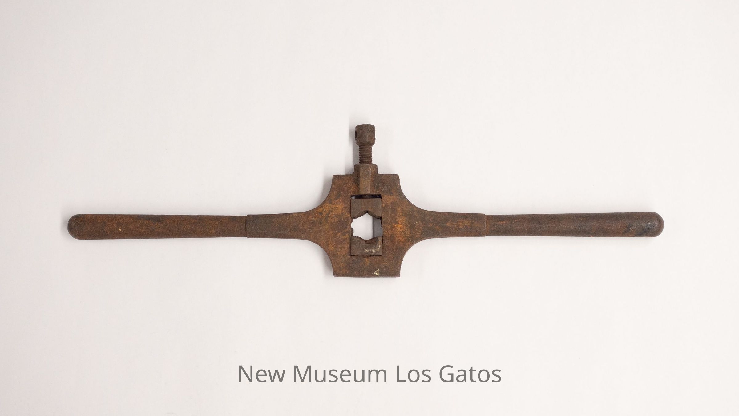 A double-handled metal tool. There is a center square area, with one cylindrical handle on each side. The the center square, there two smaller moveable metal parts, with the top one attached to a screw-top.Collection