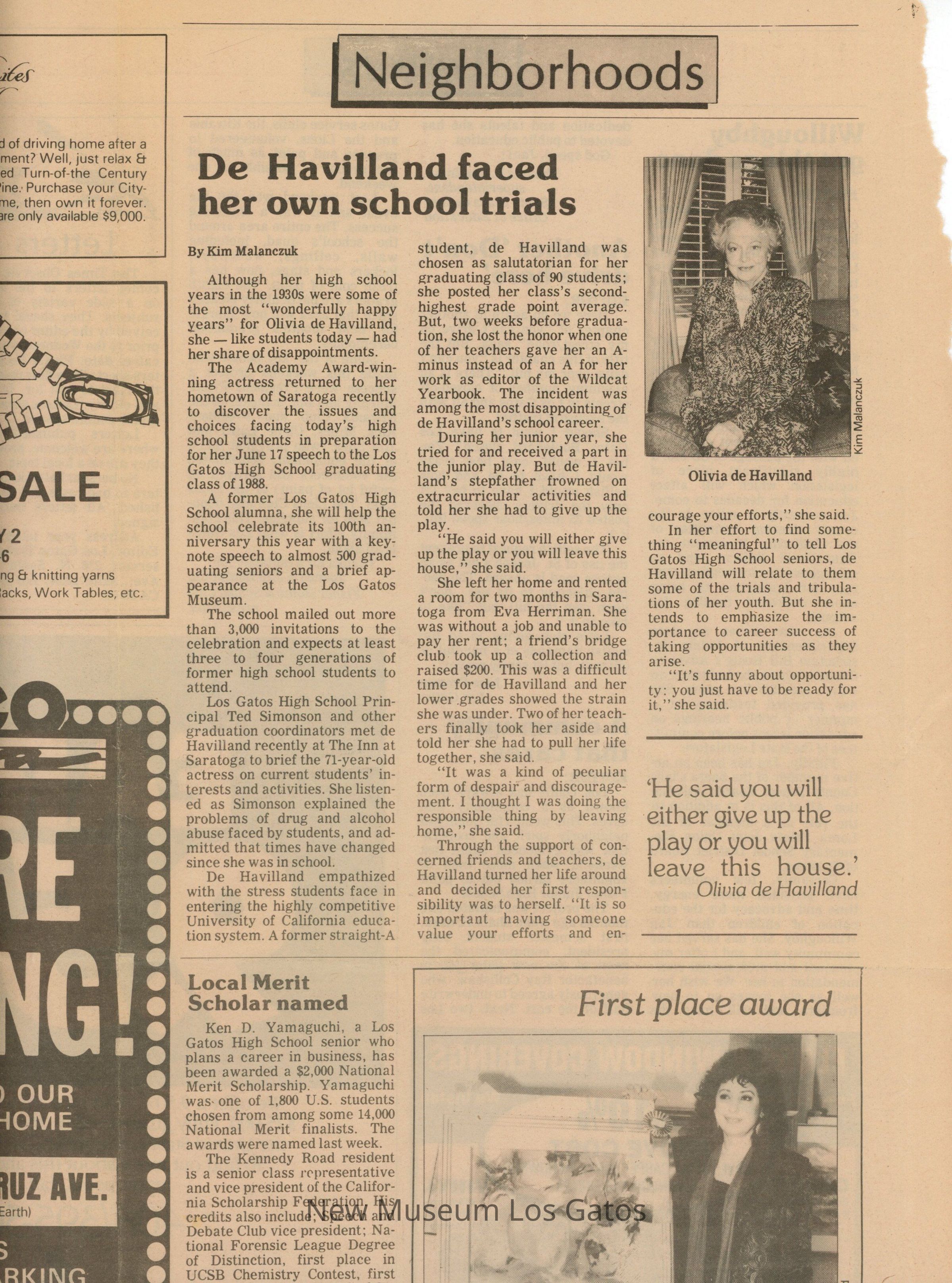 Newspaper clipping from the Los Gatos Times-Observer, on May 4th, 1988. The article regards Olivia de Havilland's time at Los Gatos High School, and her imminent speech to the graduating class of 1988.Collection