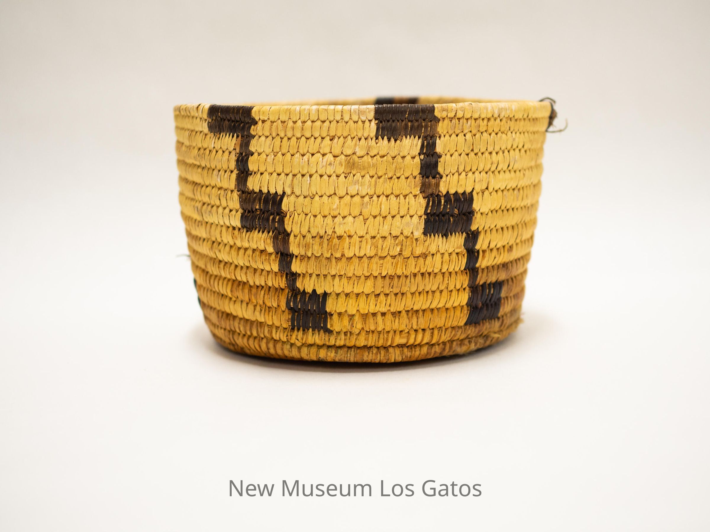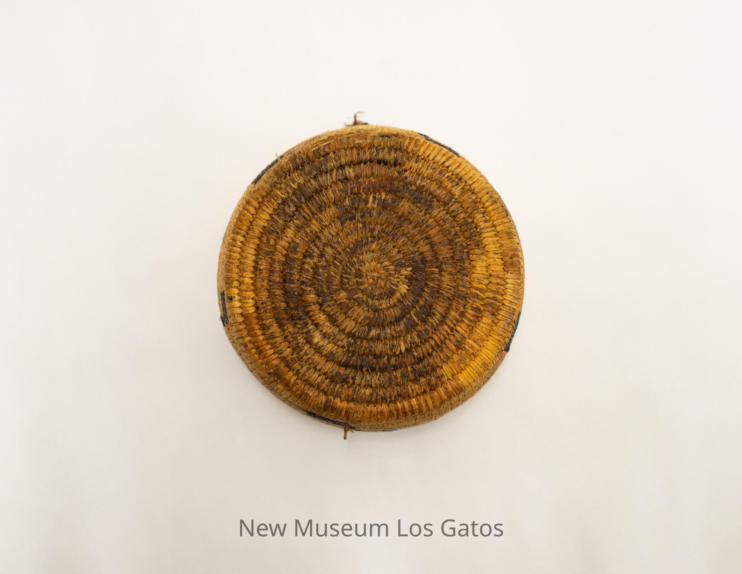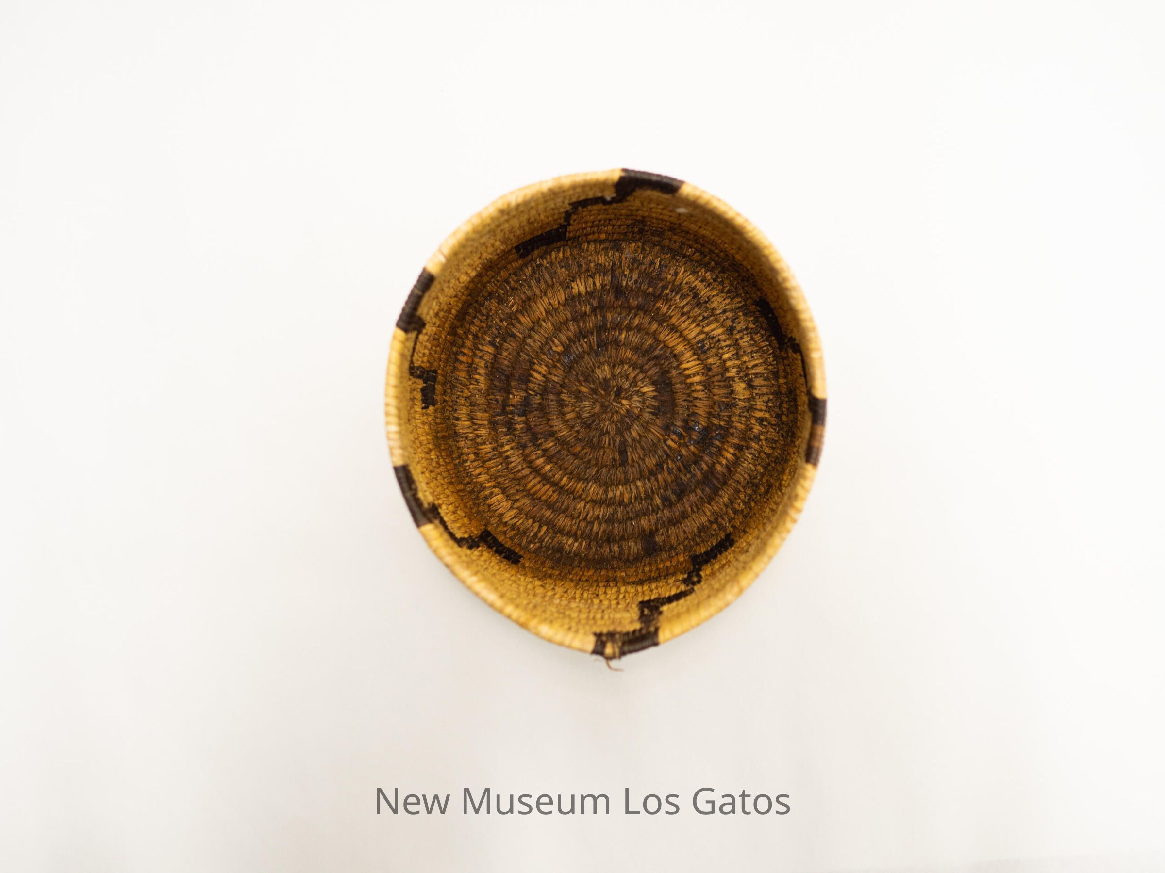 "Papago coiled basket from Arizona, made for the souvenir trade from 1920 onwards. Made of yucca leaf, split devil's claw pods (black elements) and split cattail leaf (foundation). - Frank A. Norick Lowie Museum Univ. of Calif."