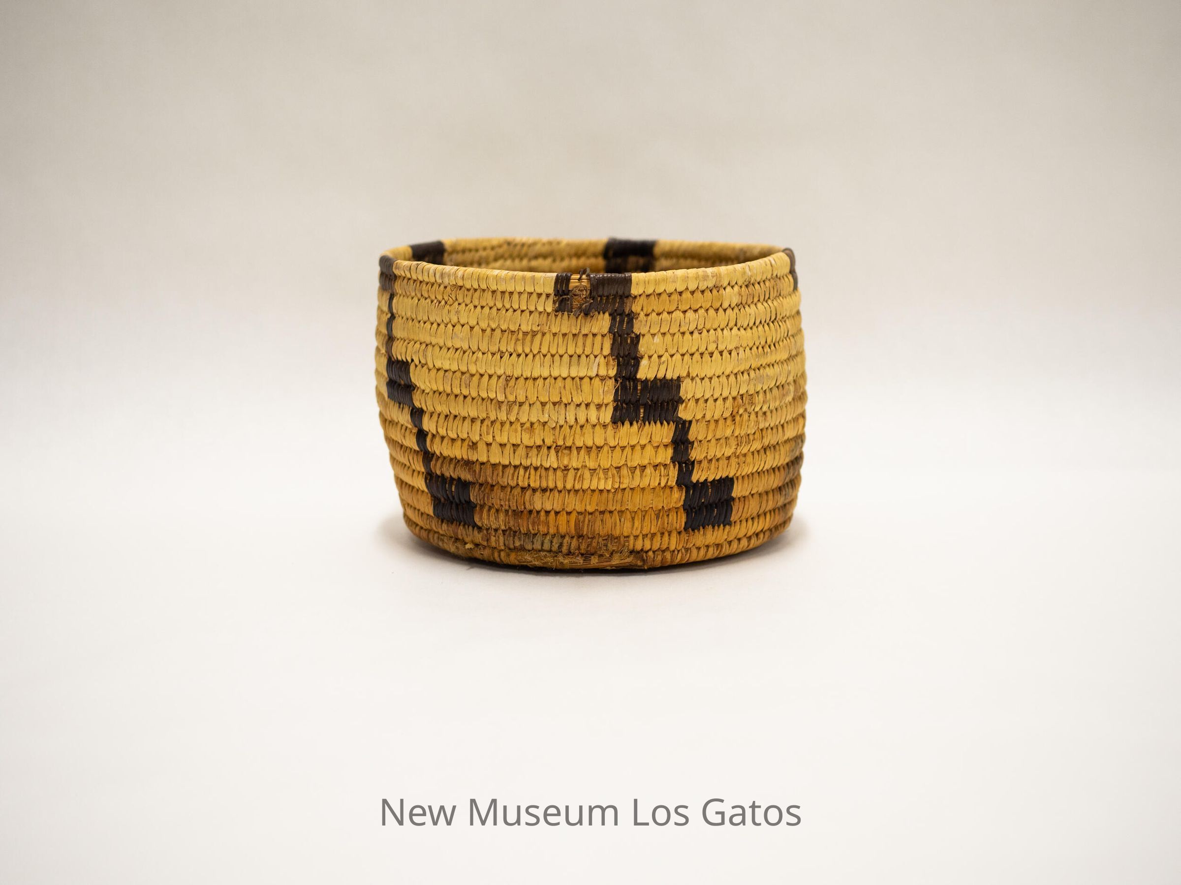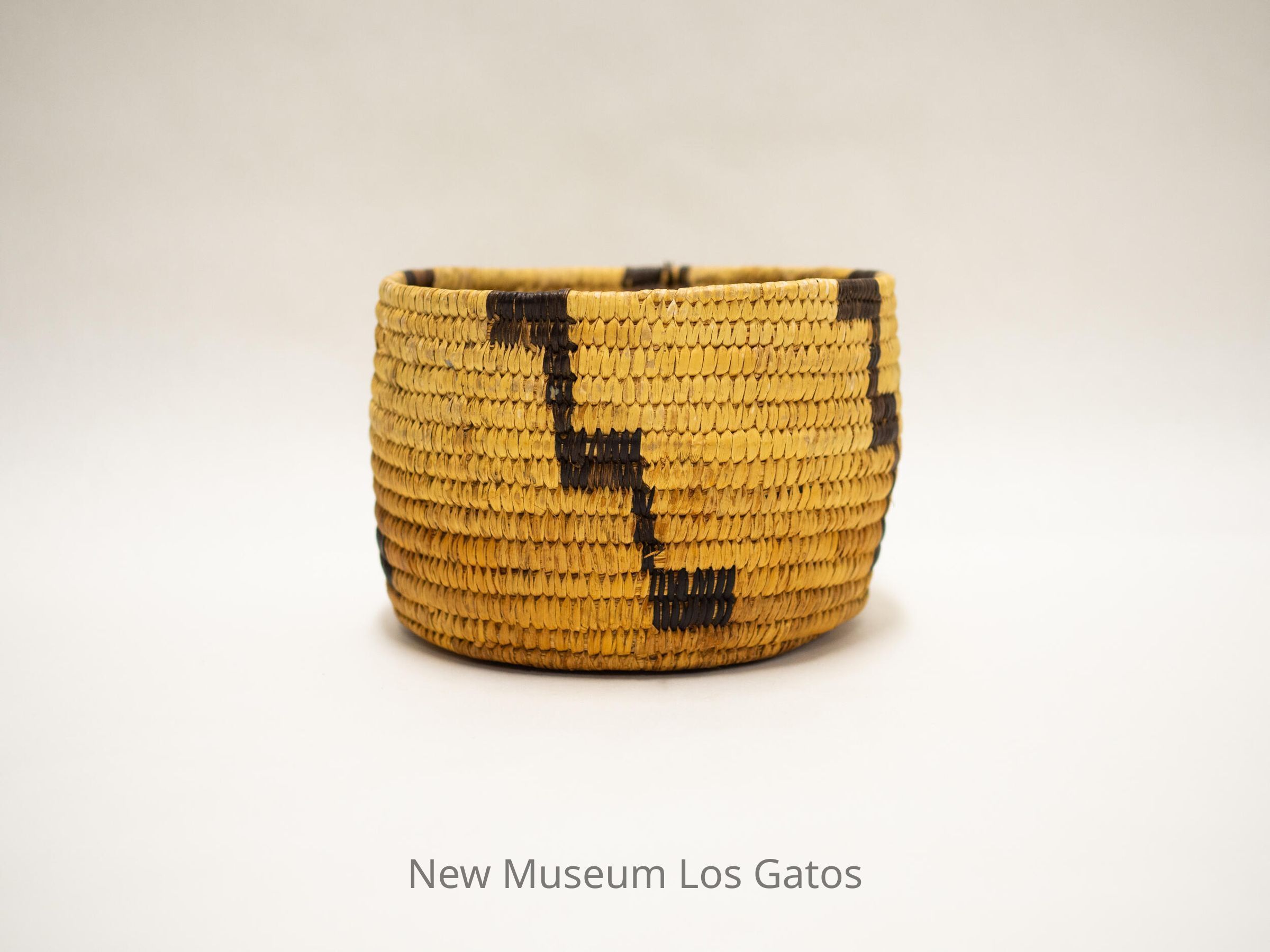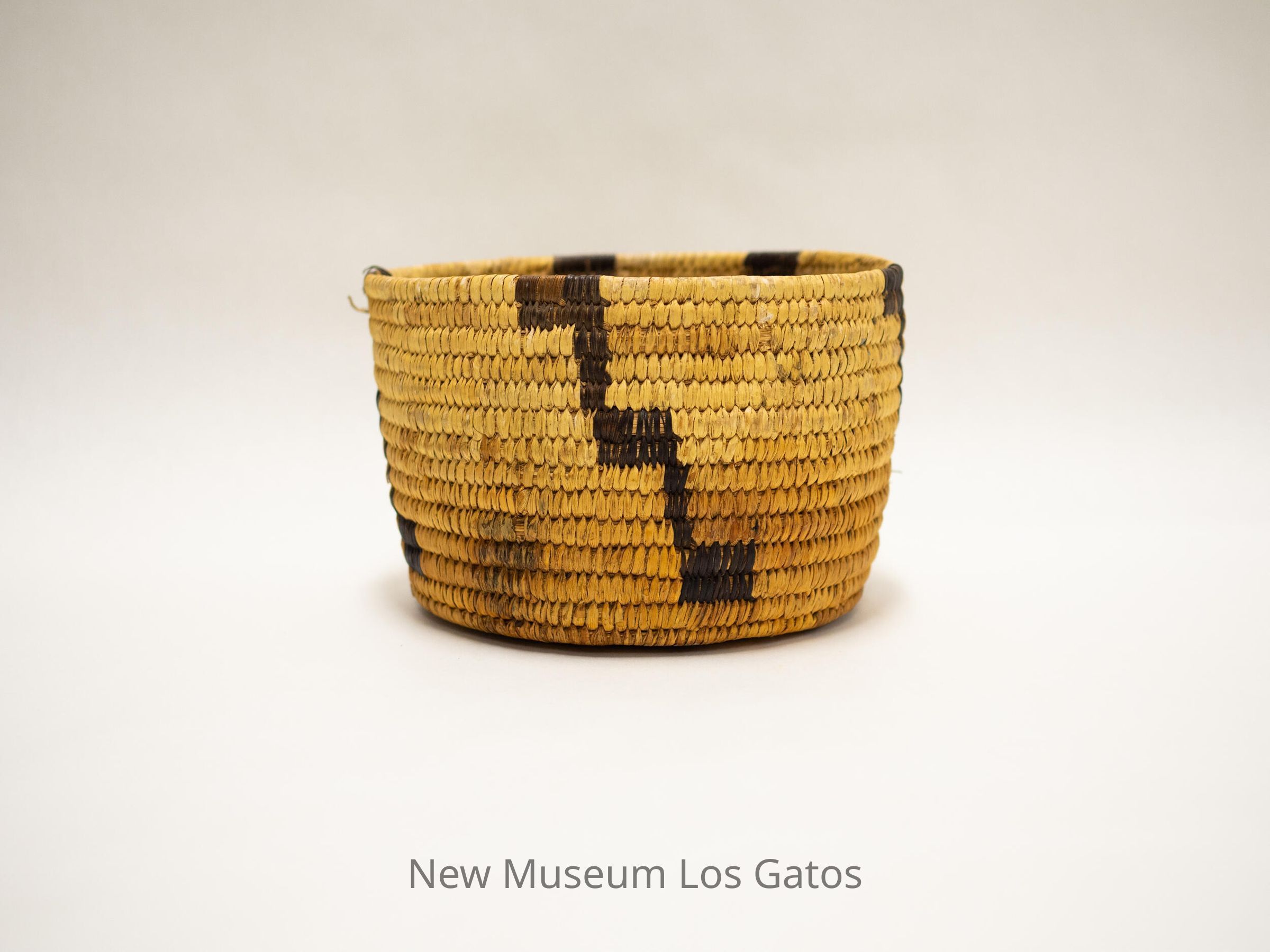 "Papago coiled basket from Arizona, made for the souvenir trade from 1920 onwards. Made of yucca leaf, split devil's claw pods (black elements) and split cattail leaf (foundation). - Frank A. Norick Lowie Museum Univ. of Calif."