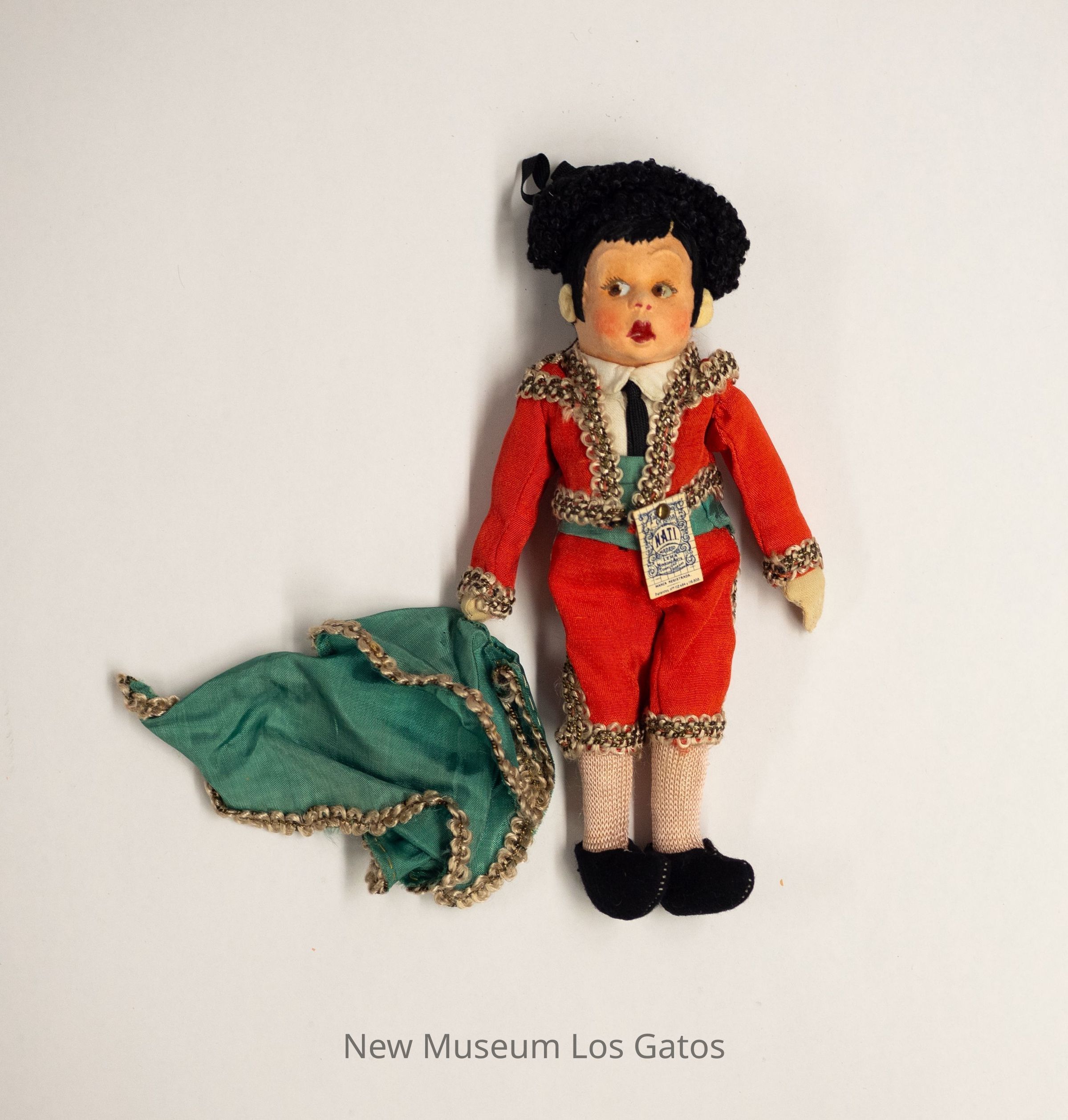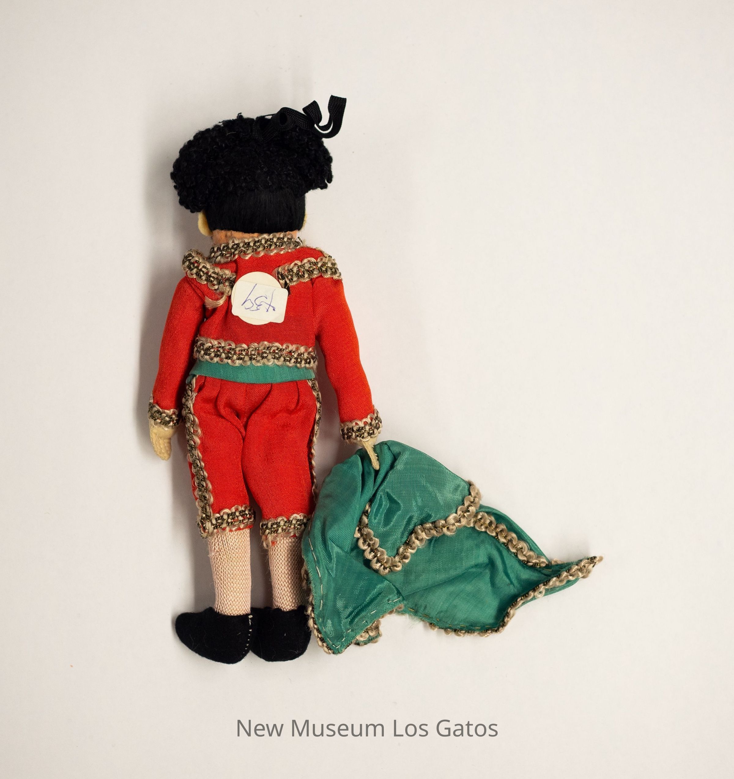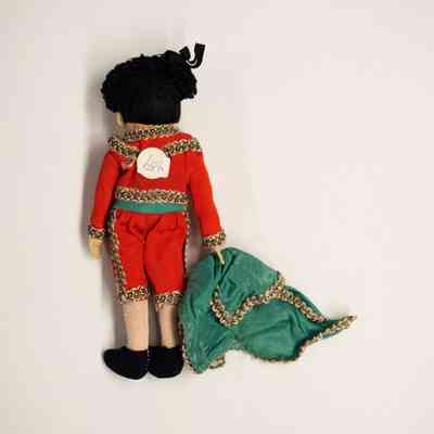 A fabric Toreador (bullfighter) doll, that is also an ornament. The doll is wearing black shoes, a red pair of pants and bolero with gray, black, and gold trim. The doll is also wearing a collared shirt, black tie, and green cummerbund. The doll has black hair and is wearing a black hat, to which a fabric loop is attached. The doll is holding a green piece of fabric with gray, black, and gold edges in its right hand.Collection