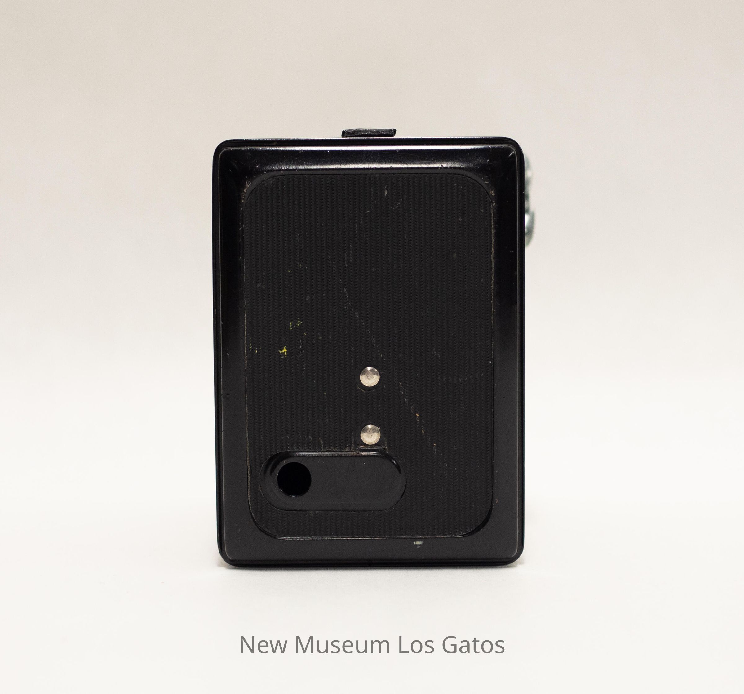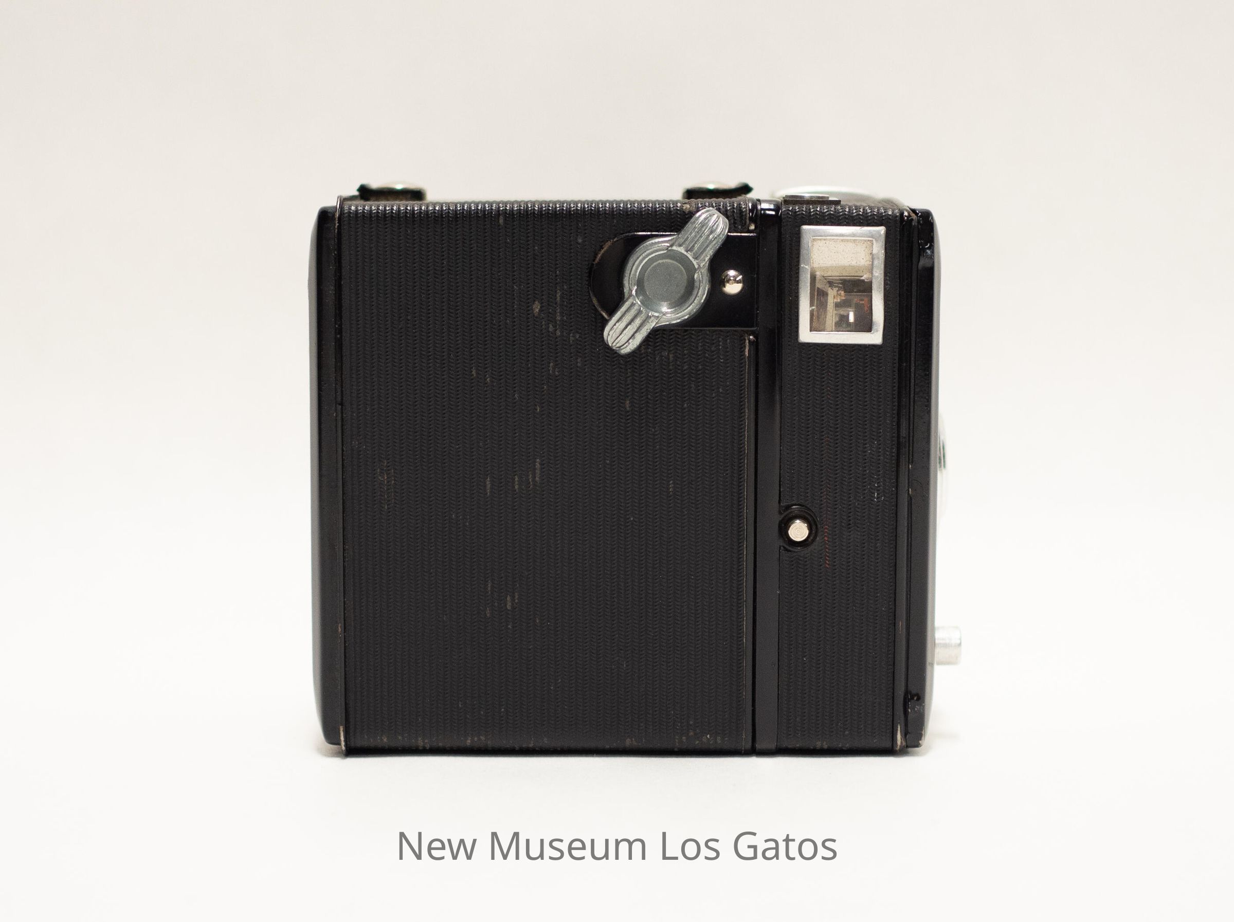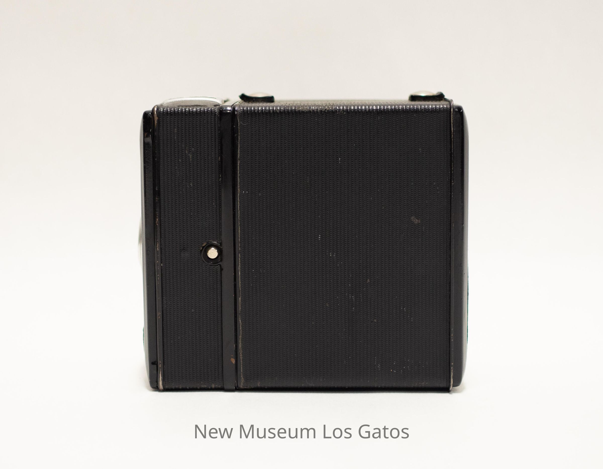 A black, rectangular box camera with a silver faceplate. The faceplate features the lens in the center, with a silver button in the lower left corner, a silver dial in the lower right corner, and two matching viewfinder circles in both upper corners. On the top of the camera, there is a rectangular viewfinder lens, as well as two silver buttons, where the strap used to attach. On the right side of the camera is the other rectangular viewfinder lens.Collection