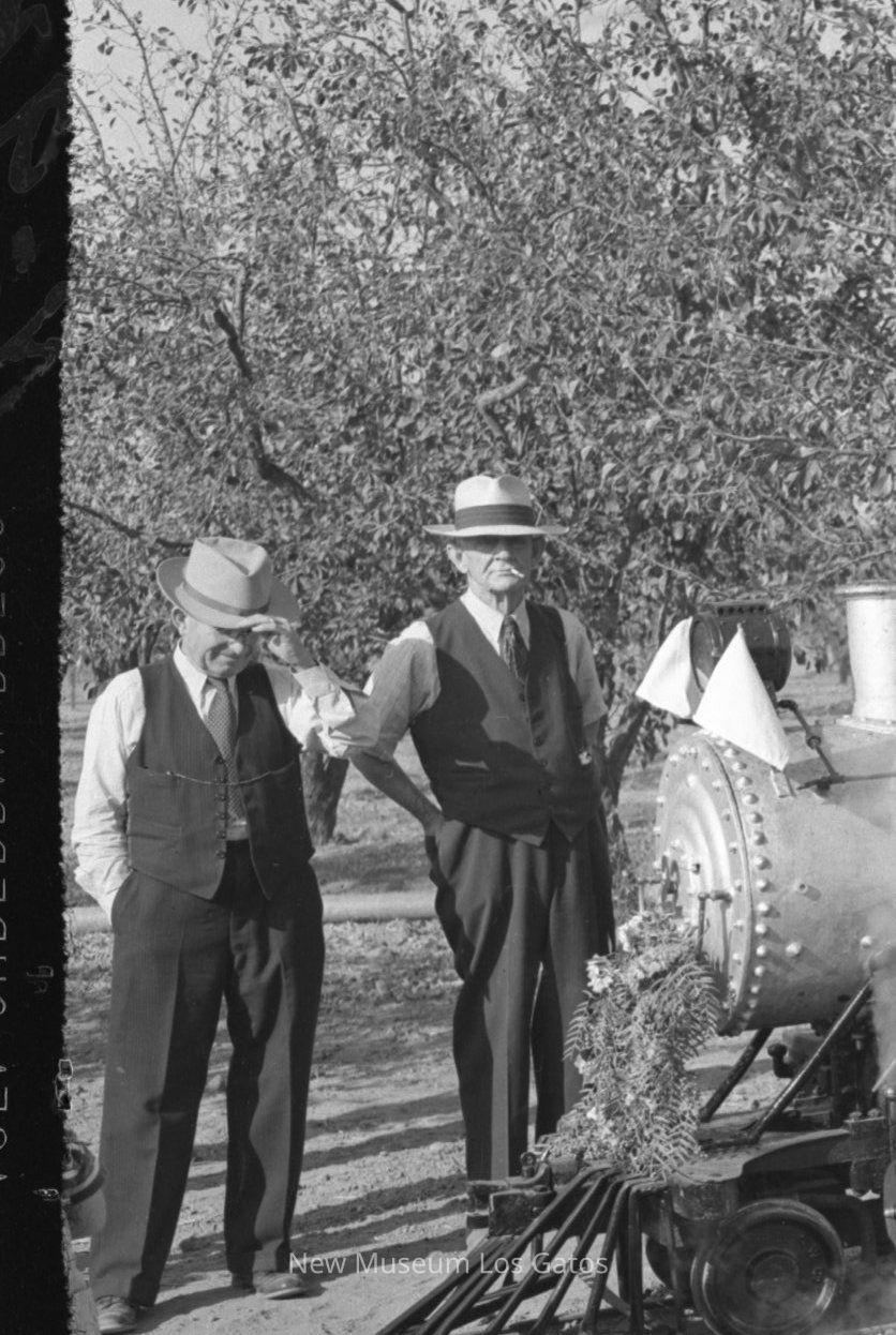 A black and white photograph negative, depicting a train at the golden spike ceremony for the Wildcat Railroad on October 16, 1943. The train consists of the steam engine and the beginning of one passenger car. There are people standing behind the train, and a few children sitting in chairs with their backs to the camera in the foreground.