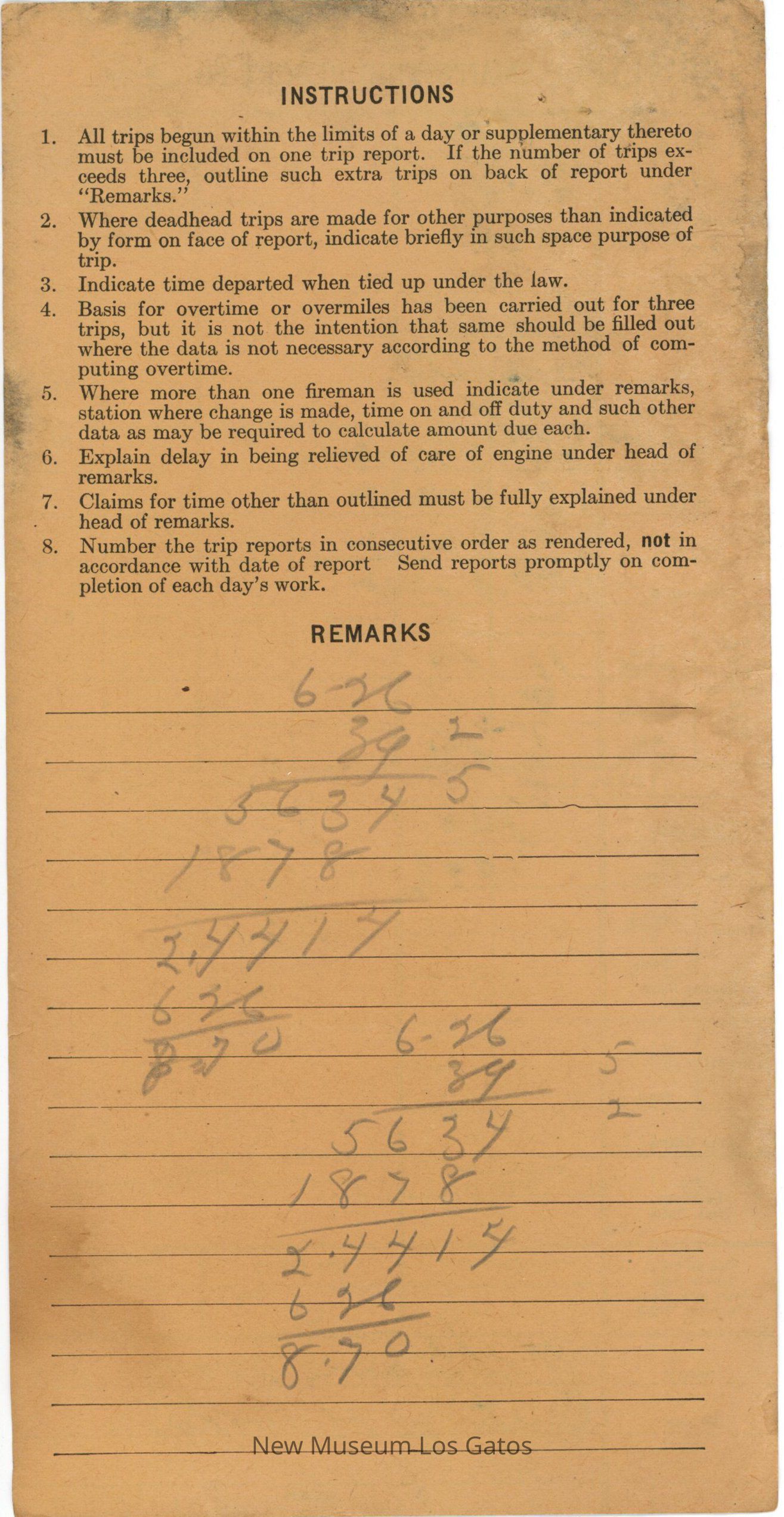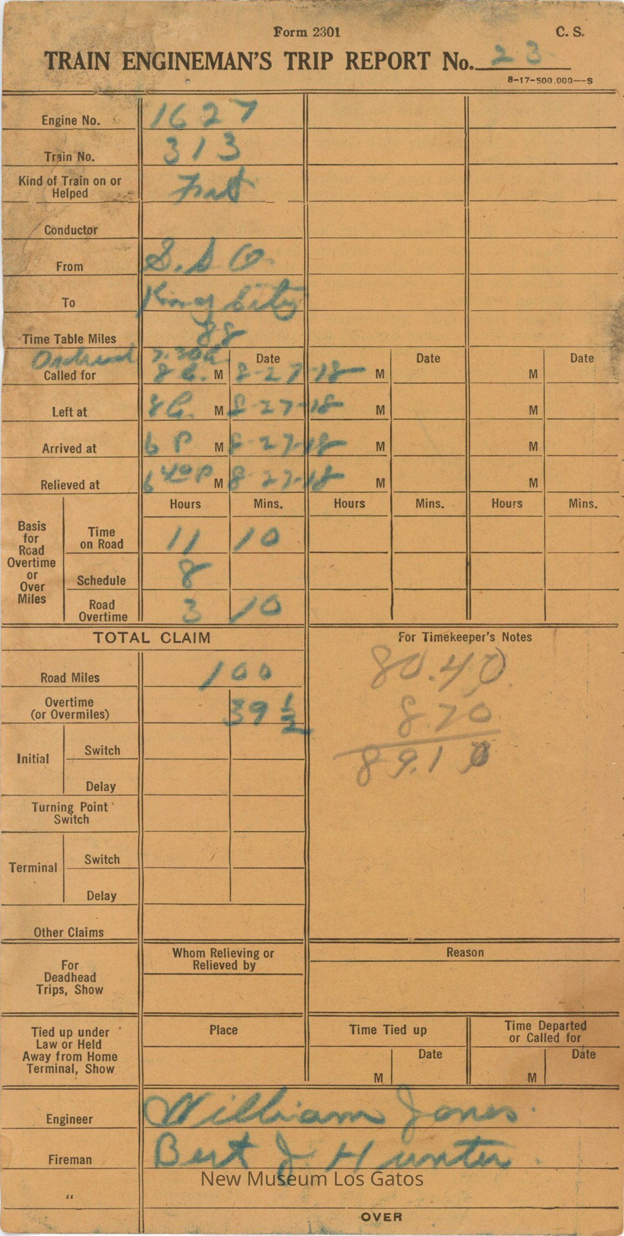 A train engineman's trip report, number 23, filled out by William Jones. The report contains details of his trip from San Luis Obispo to King City.Collection