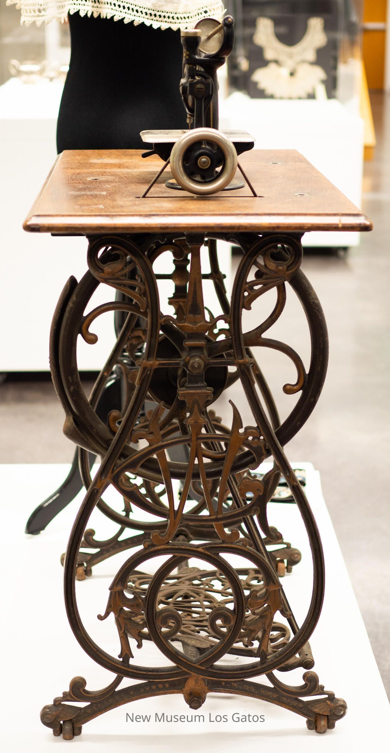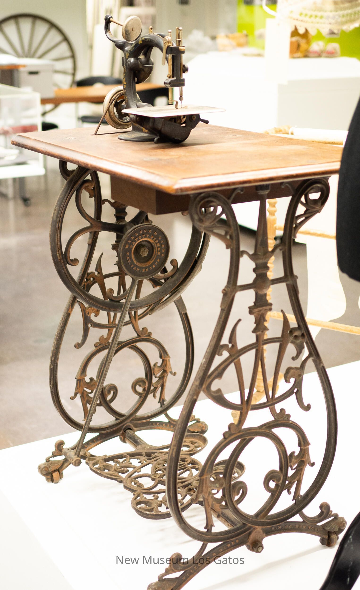 A large, foot pedal operated sewing machine. The base and sides are cast iron, and have a floral, decorative pattern that also includes the "WG" initials of the manufacturer. The top of the sewing machine is a rectangular wooden table, and attached to the right side of the table is the sewing mechanism itself. The arm and bed is metal that is painted black with golden leaves and grapes decorating the sides, as well as the manufacturer's name painted in gold. The needle, needle clamp, throat plate, and balance wheel are a silver metal. There is a small wooden drawer attached to the bottom of the table that slides out, and inside the drawer are genuine Willcox and Gibbs sewing needles and parts.Collection