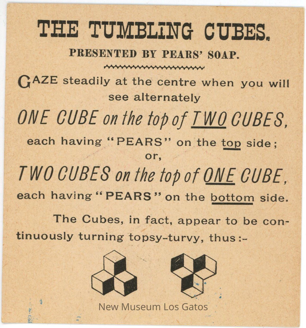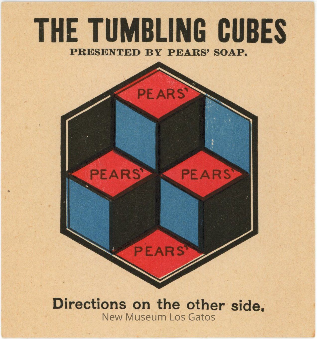 An advertising card, featuring "The Tumbling Cubes" illusion. The front of the card has a pattern of red, black, and blue square and diamond shapes, while the back of the card has the instructions for the illusion.Collection