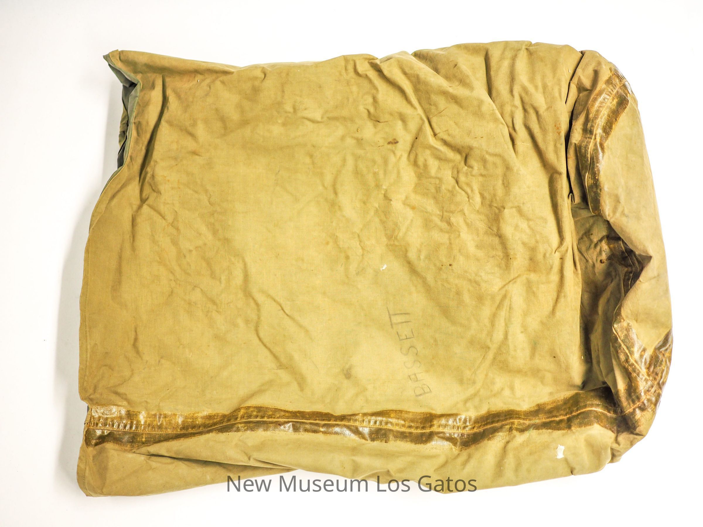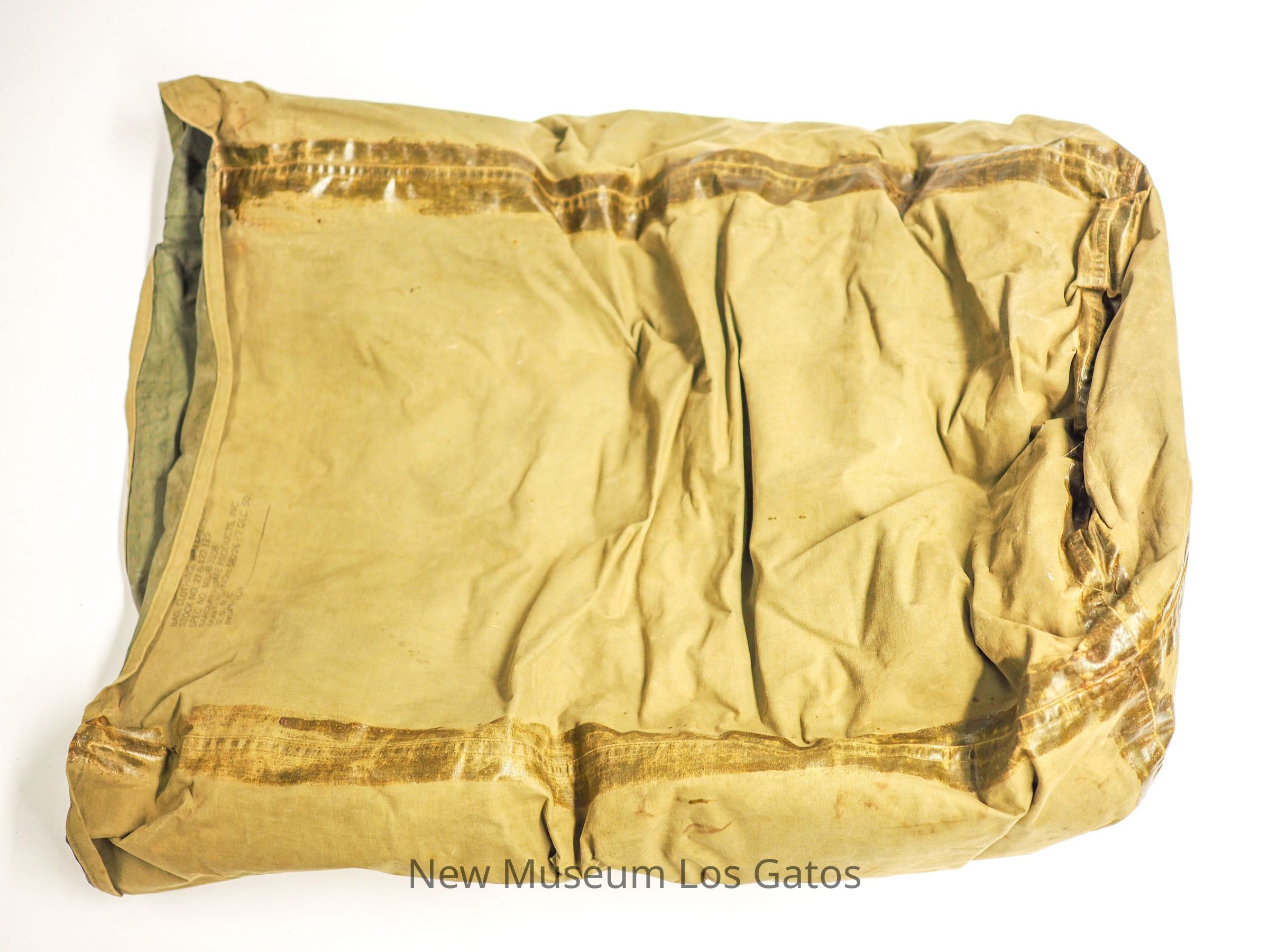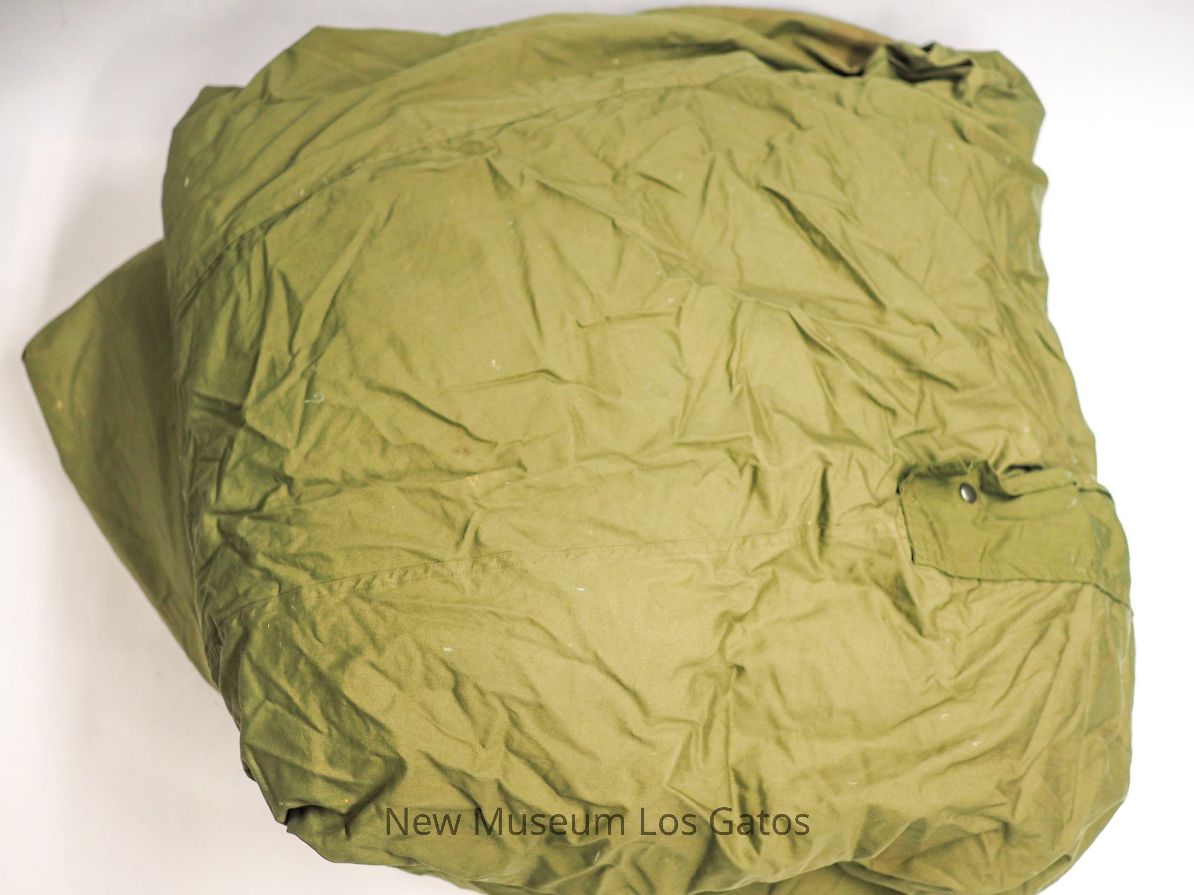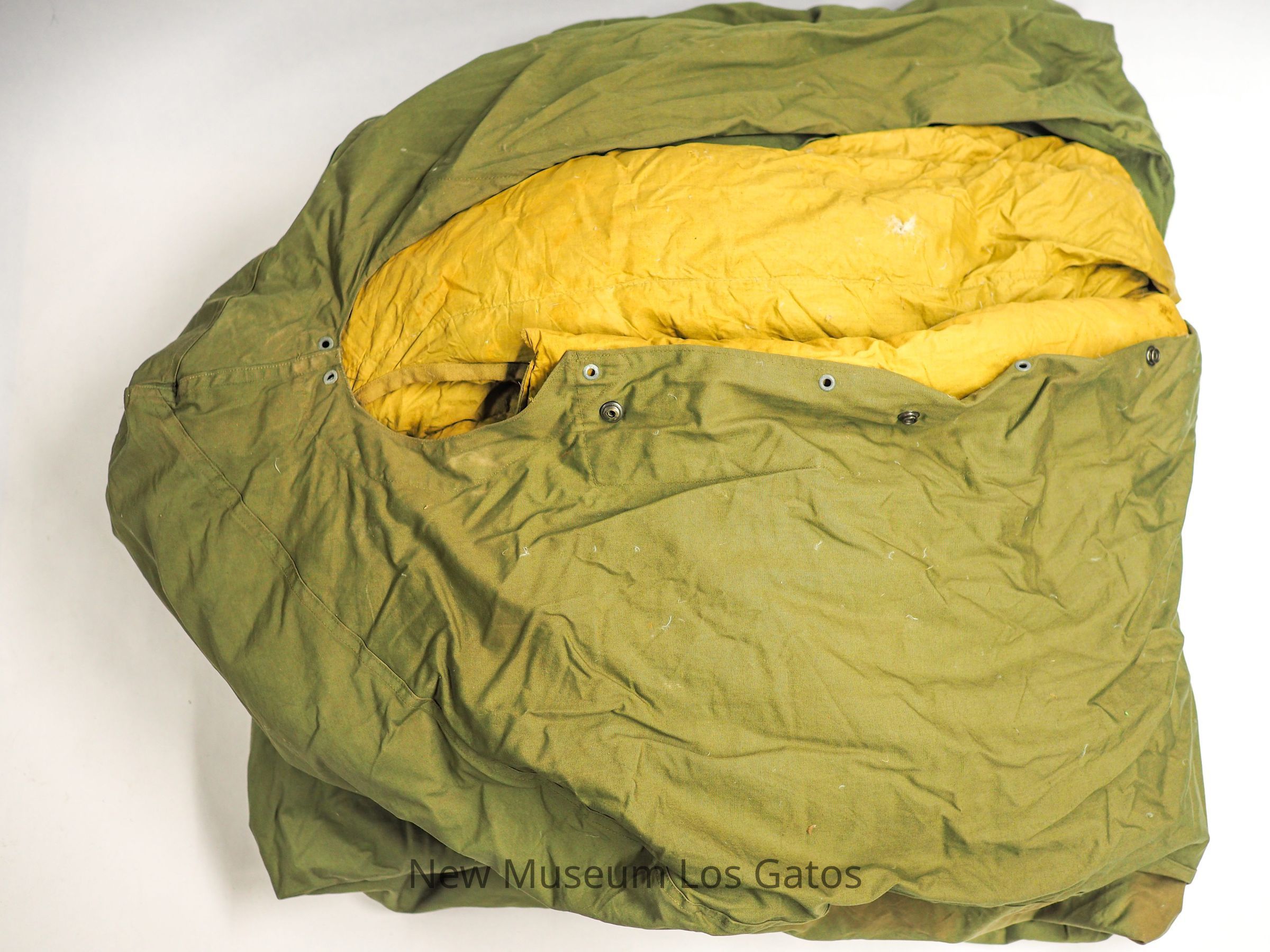 A Korean War-era U.S. Army sleeping bag with feather stuffing. The sleeping bag has a round hood and tapers down to a point at the feet. It is contained in a large olive green clothing bag made of a synthetic plastic-like fabric.Collection