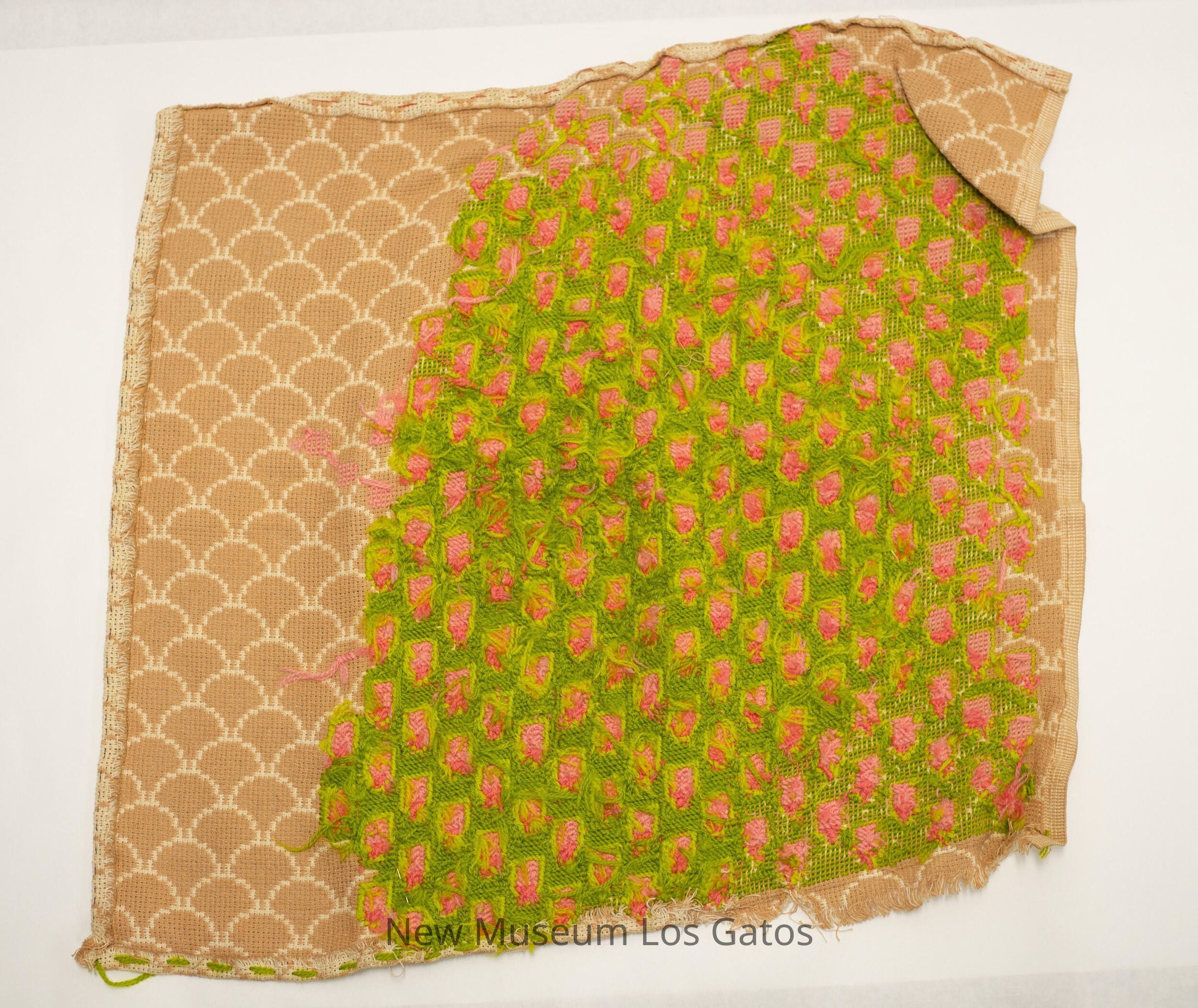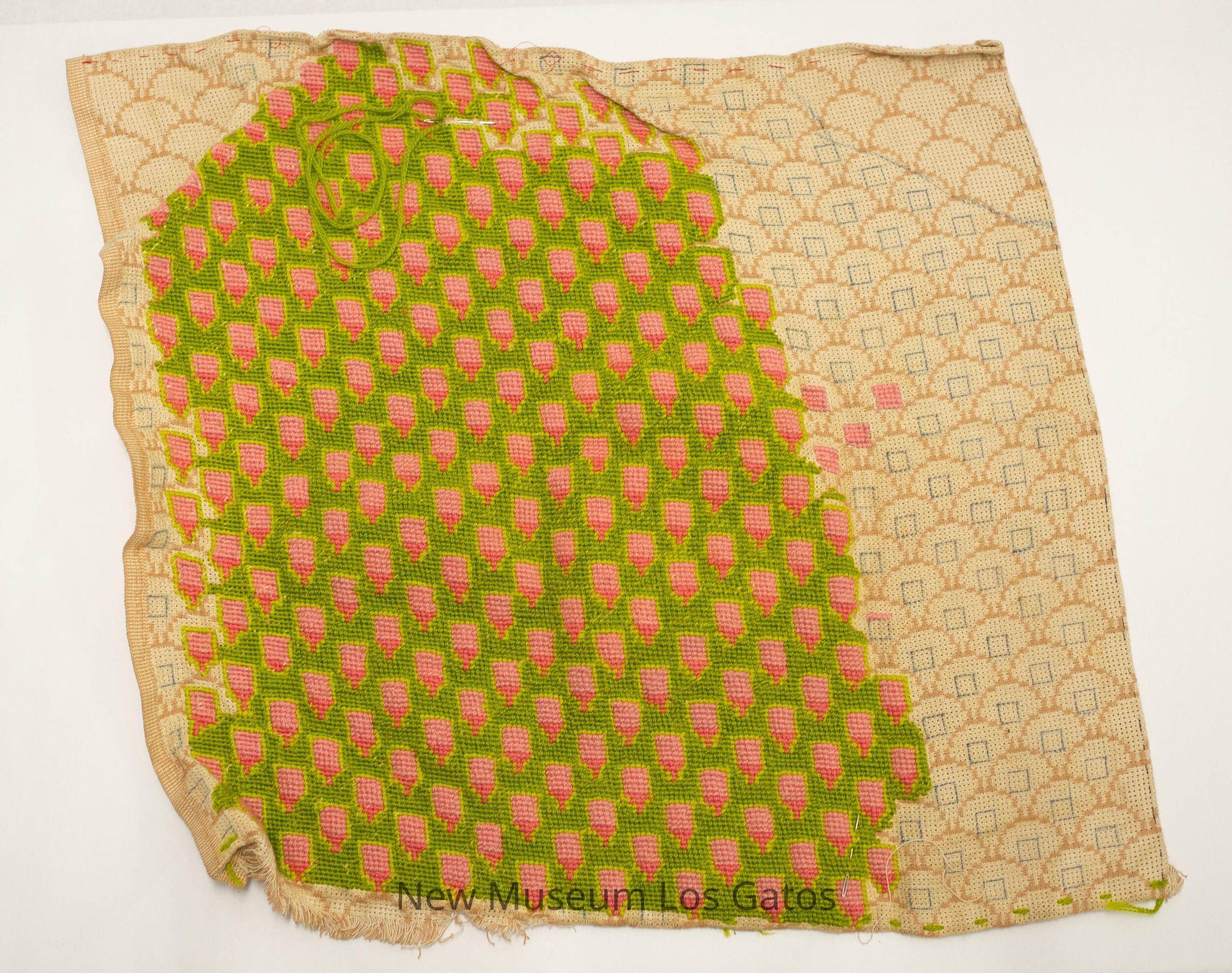 A square piece of fabric with an unfinished needlepoint pattern. The base fabric is cream and tan, with the tan forming a scale pattern. Inside each scale is a blue square. The needlepoint yarn is green, with a two-toned pink bottle-looking pattern. Lighter green yarn borders the pink. There are two silver needles embedded in the needlepoint portion, one on each end, with one still attached to green yarn.Collection