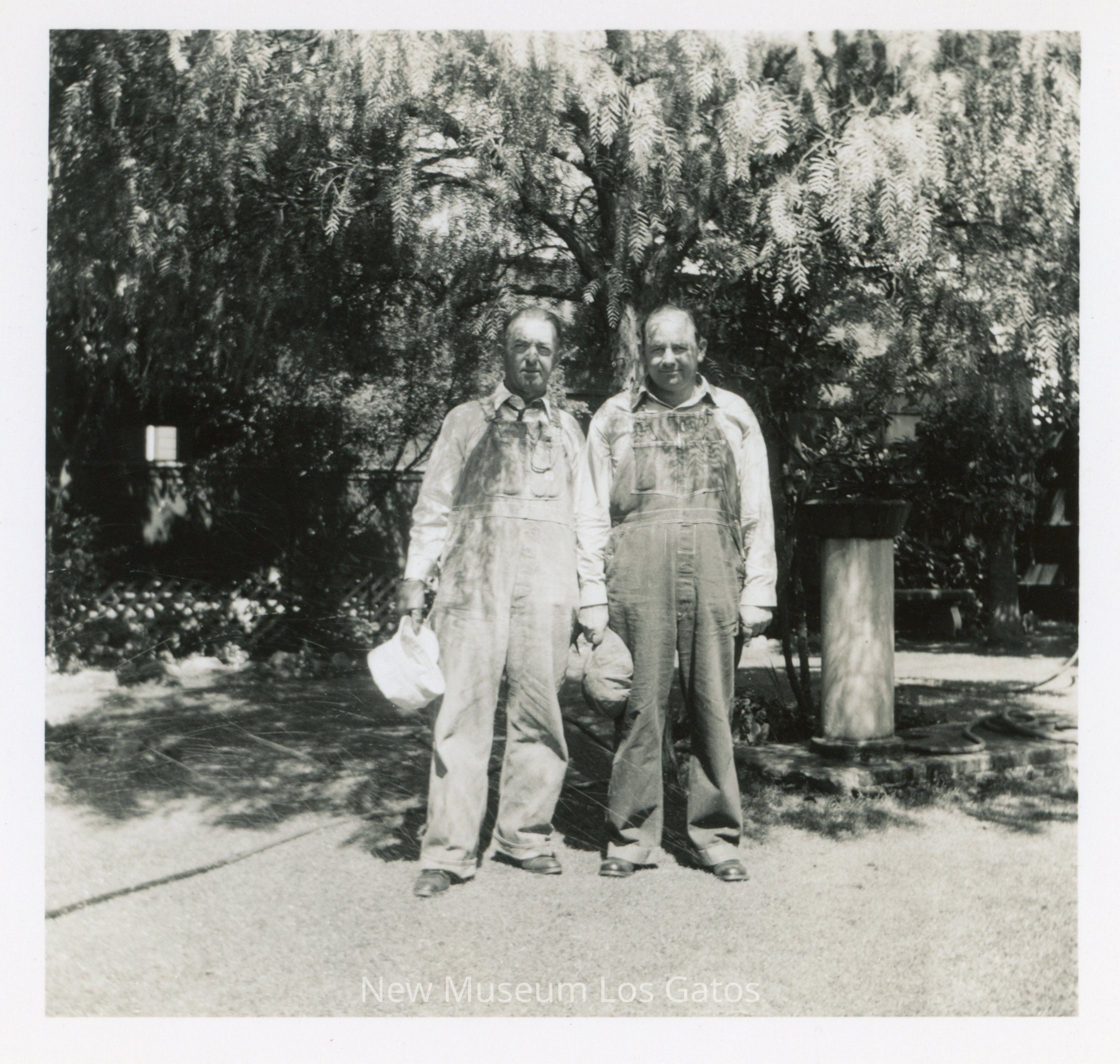 A black and white photograph featuring two unidentified men. The men are both wearing overalls and holding a hat in their right hands, standing underneath trees. The men are most likely Wildcat Railroad conductors. The image is surrounded by a white border.Collection