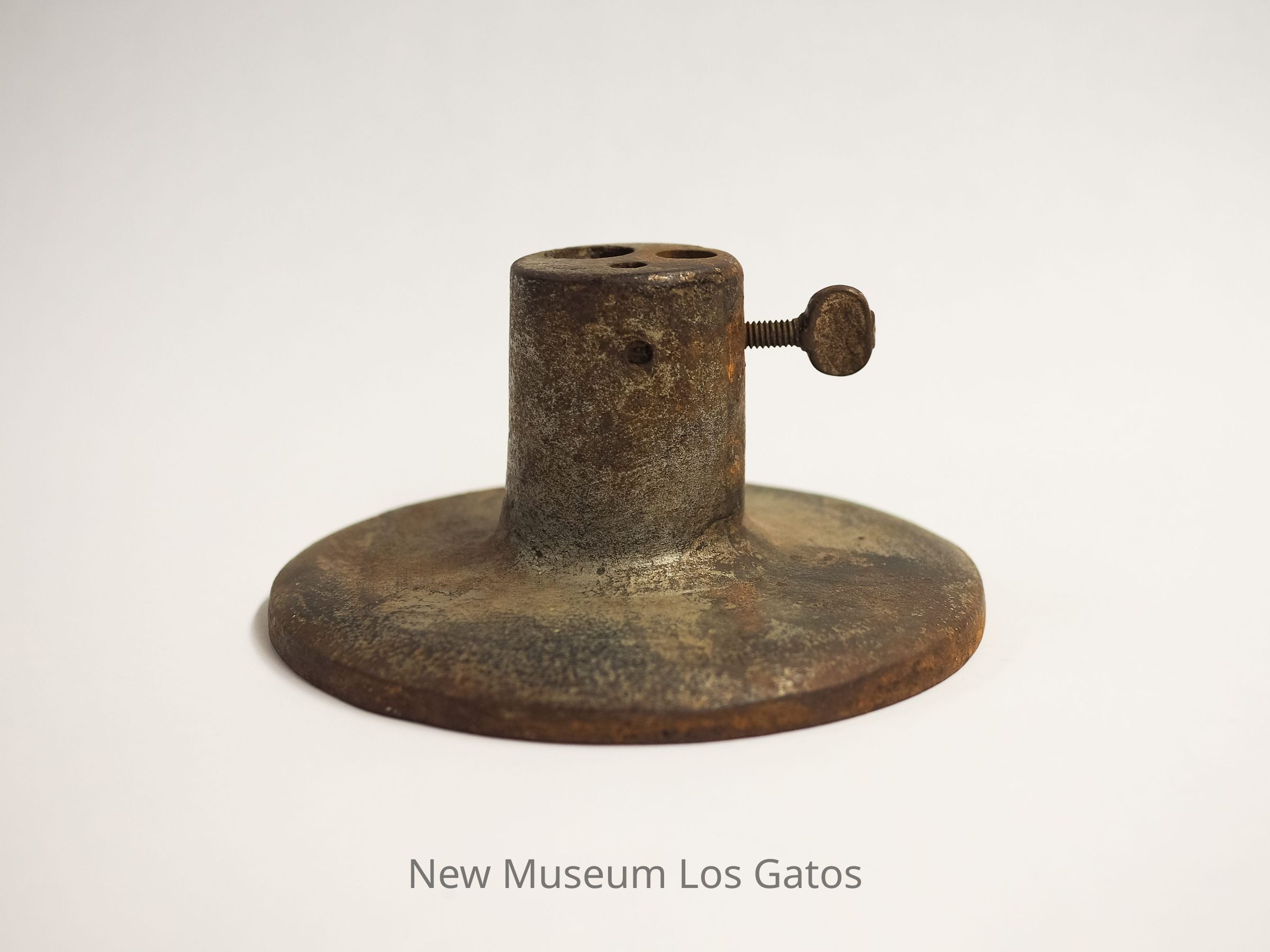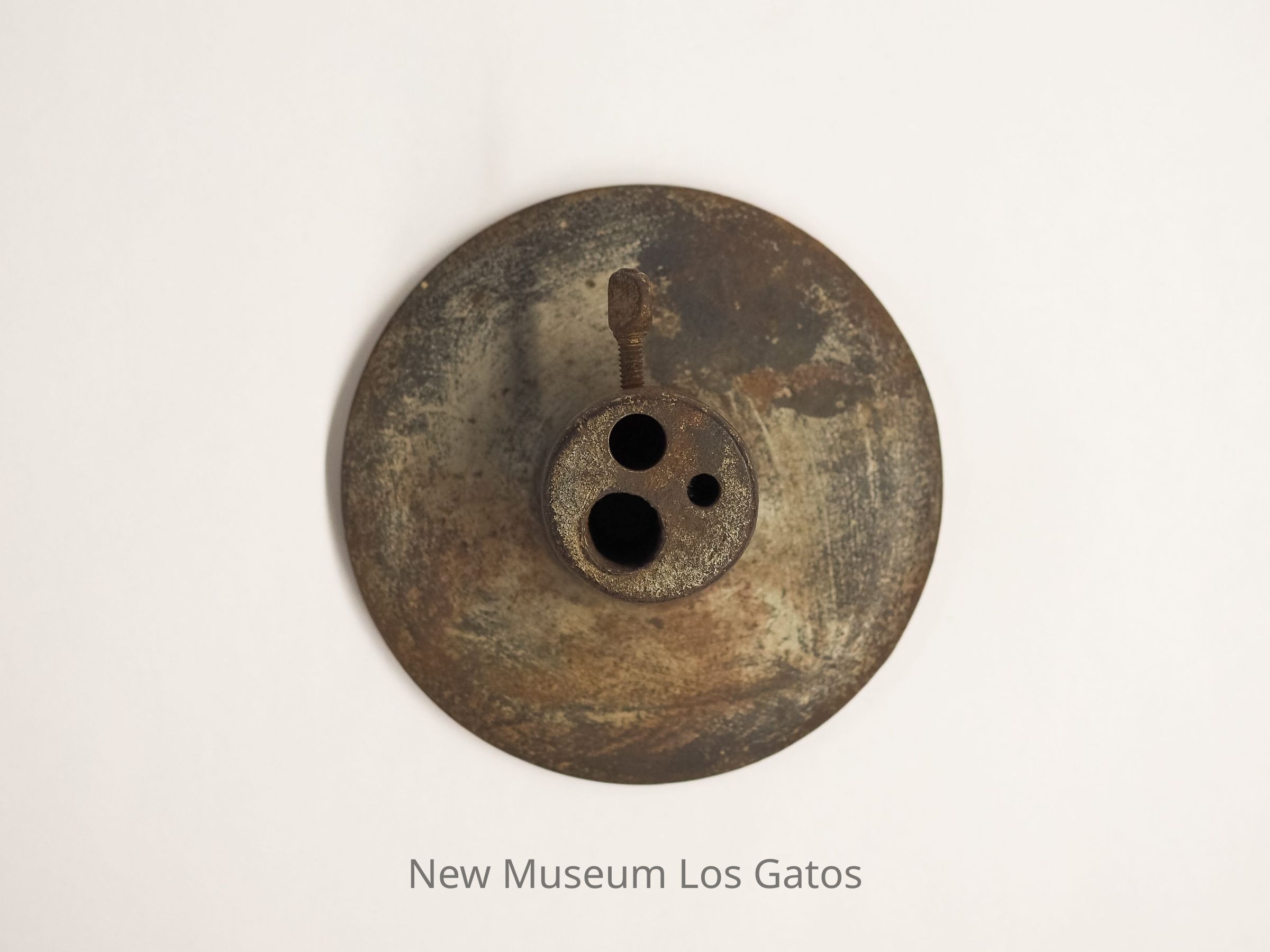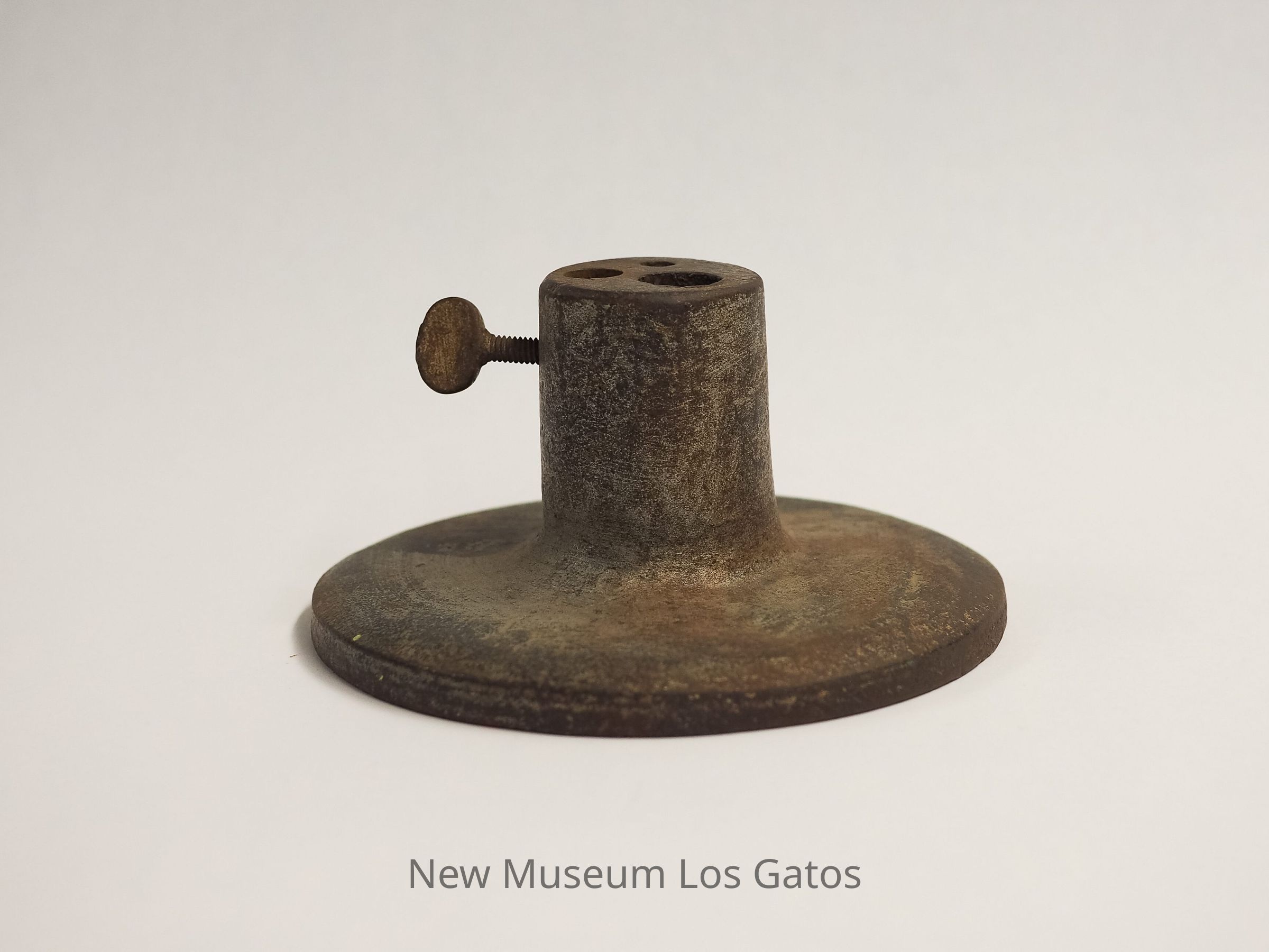 A circular metal object with an accompanying metal rod. The circular portion is mostly flat, with a raised cylindrical center. That cylindrical center has three holes of different sizes, the largest of which goes completely through the object, as well as a twist screw coming out of the side. The metal rod is cylindrical, with a pointed tip.Collection