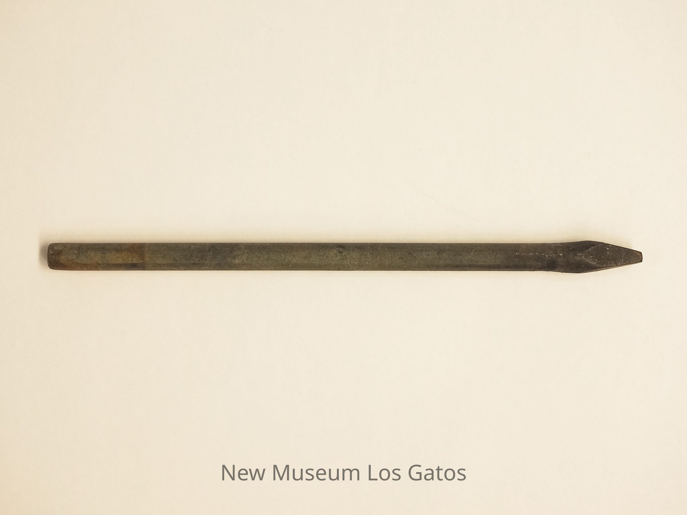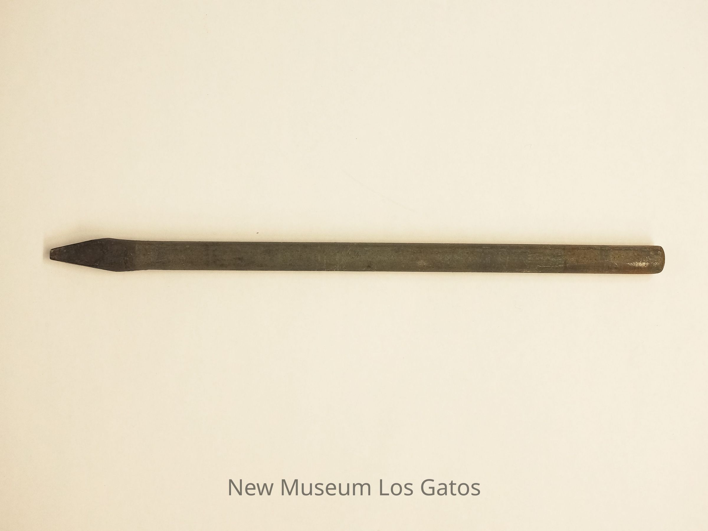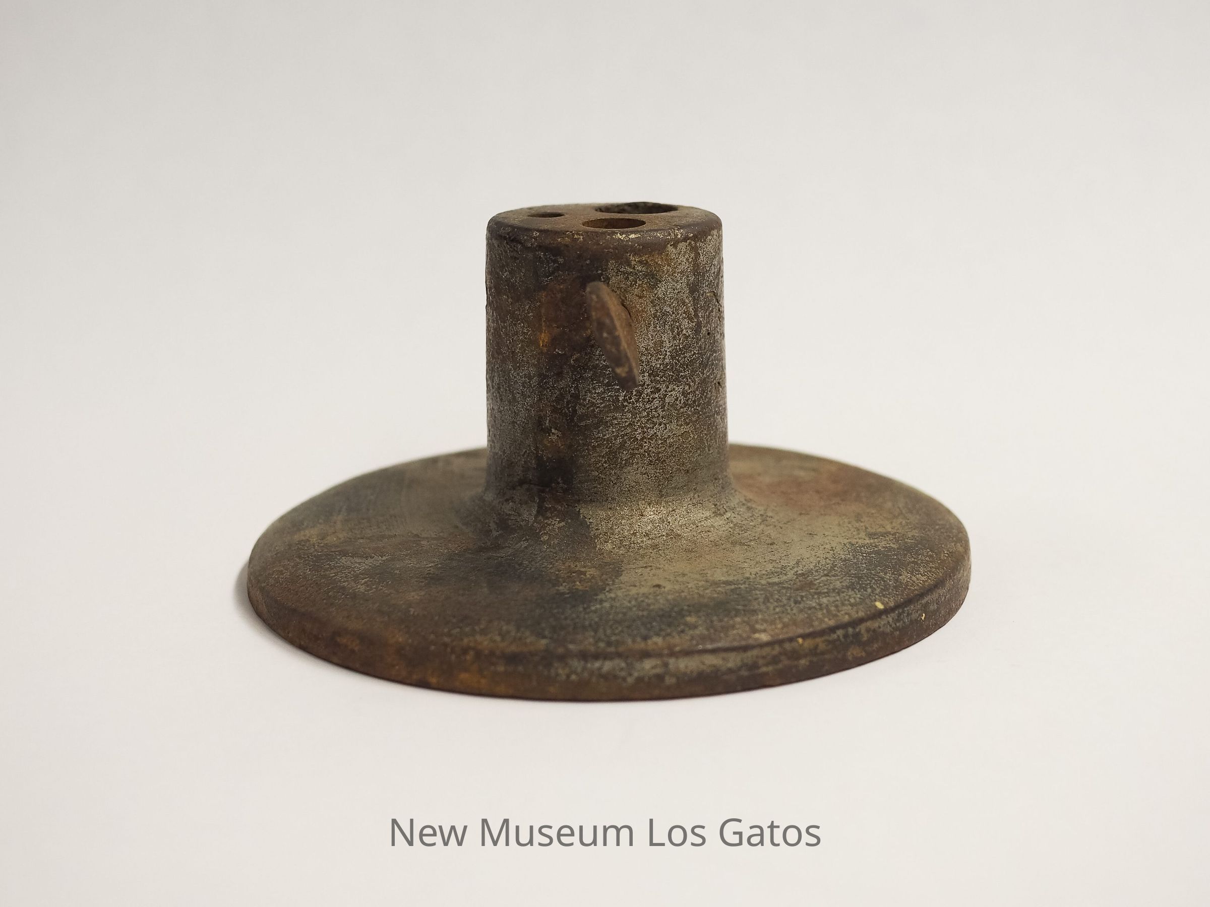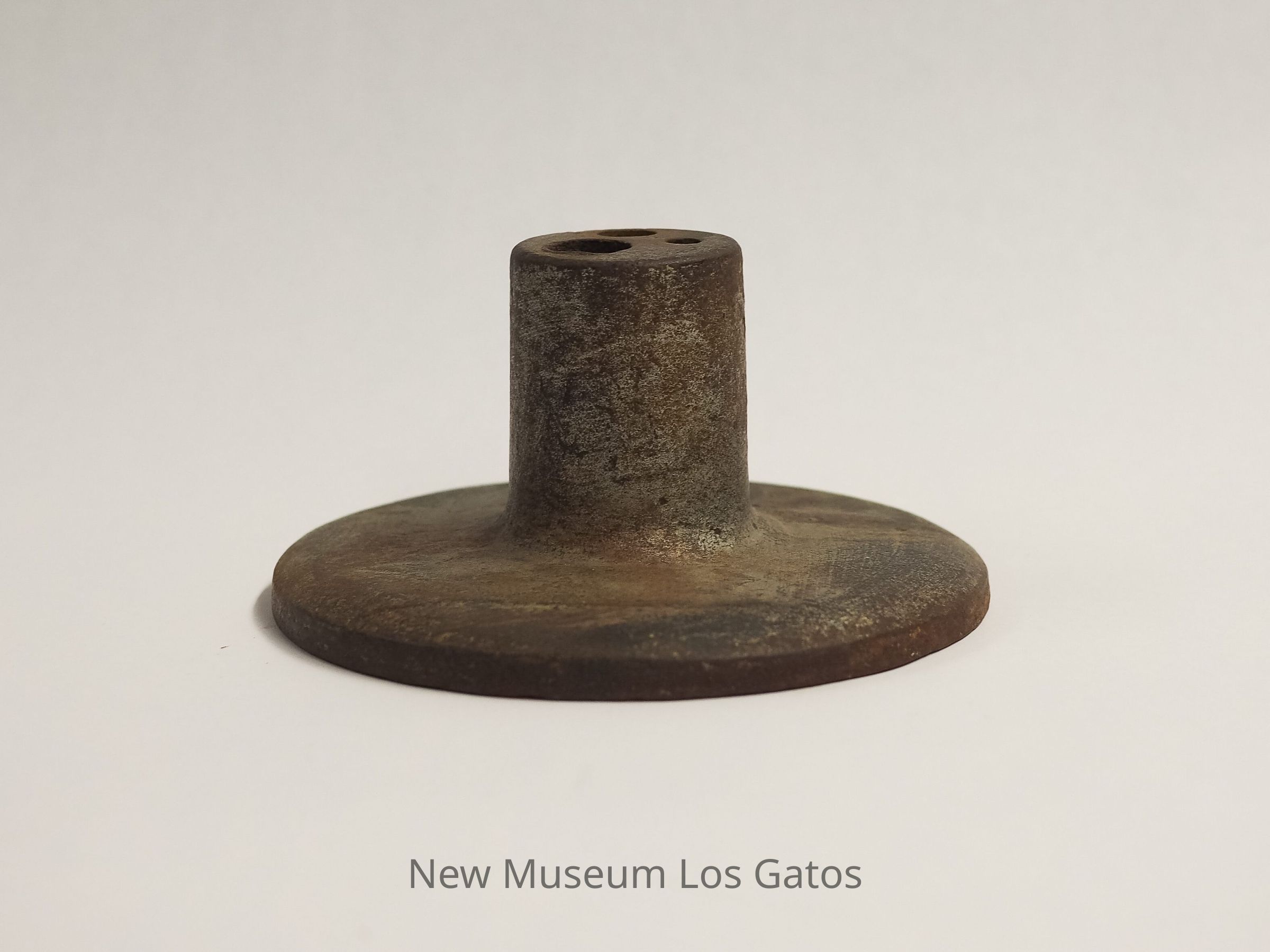 A circular metal object with an accompanying metal rod. The circular portion is mostly flat, with a raised cylindrical center. That cylindrical center has three holes of different sizes, the largest of which goes completely through the object, as well as a twist screw coming out of the side. The metal rod is cylindrical, with a pointed tip.Collection