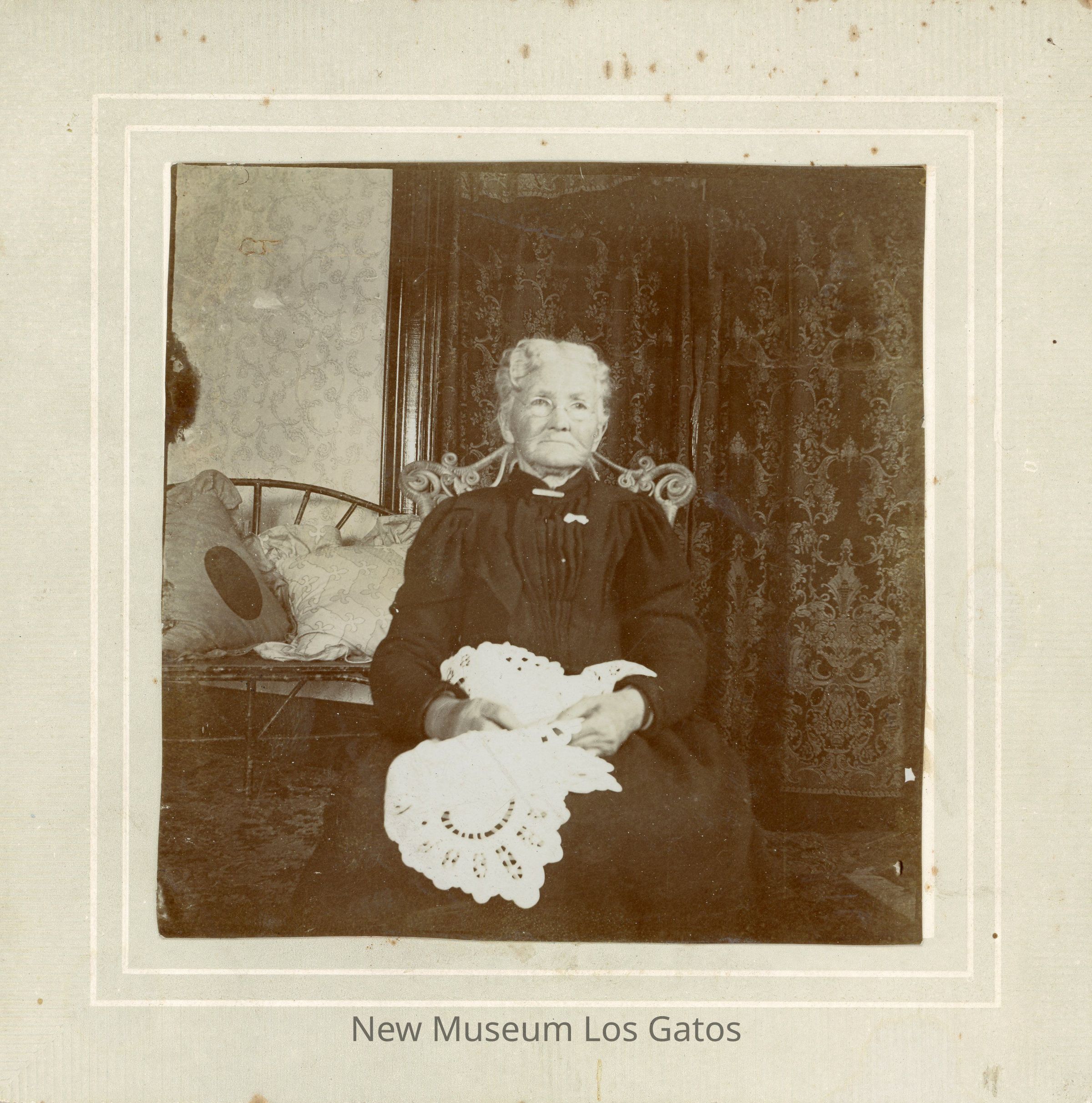 A black and white photograph of an unidentified older woman, sitting in a room. The woman is wearing a dark colored dress with her hair pinned back, and is holding a white fabric. She is sitting on a chair, with a wire couch and pillows behind her. The photograph is surrounded by a white border.Photograph Details
