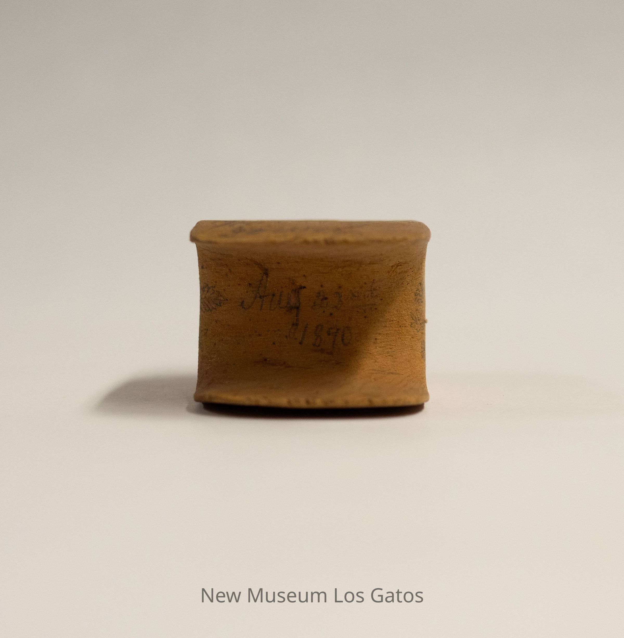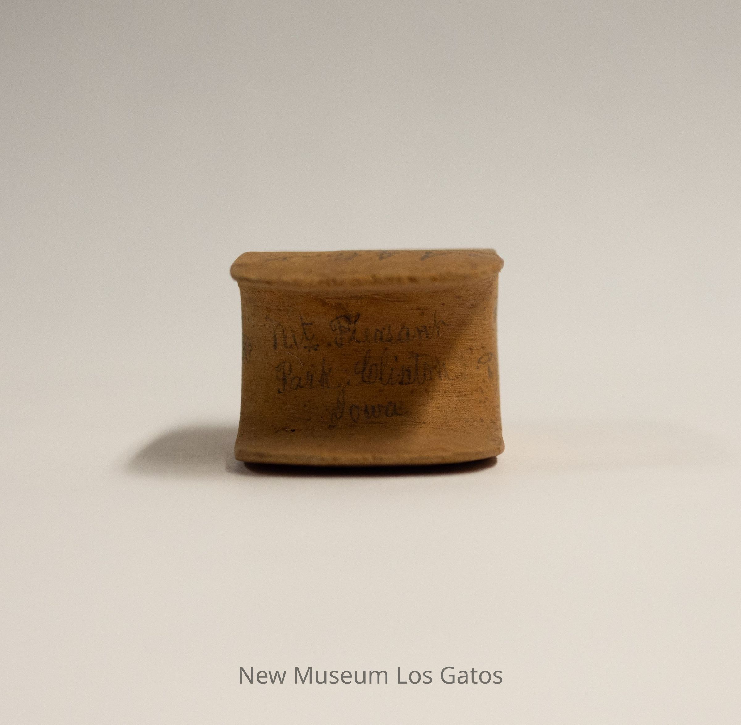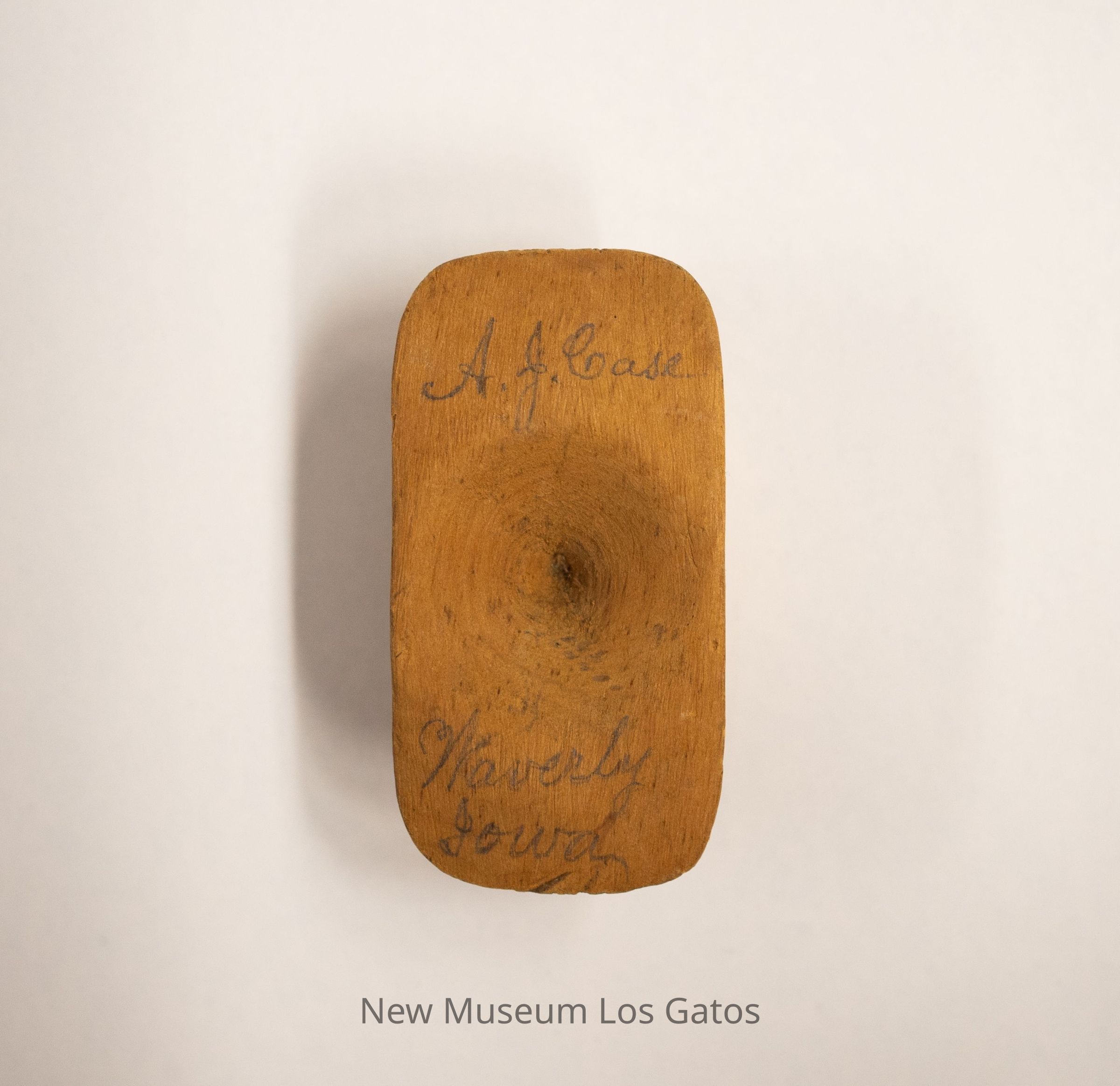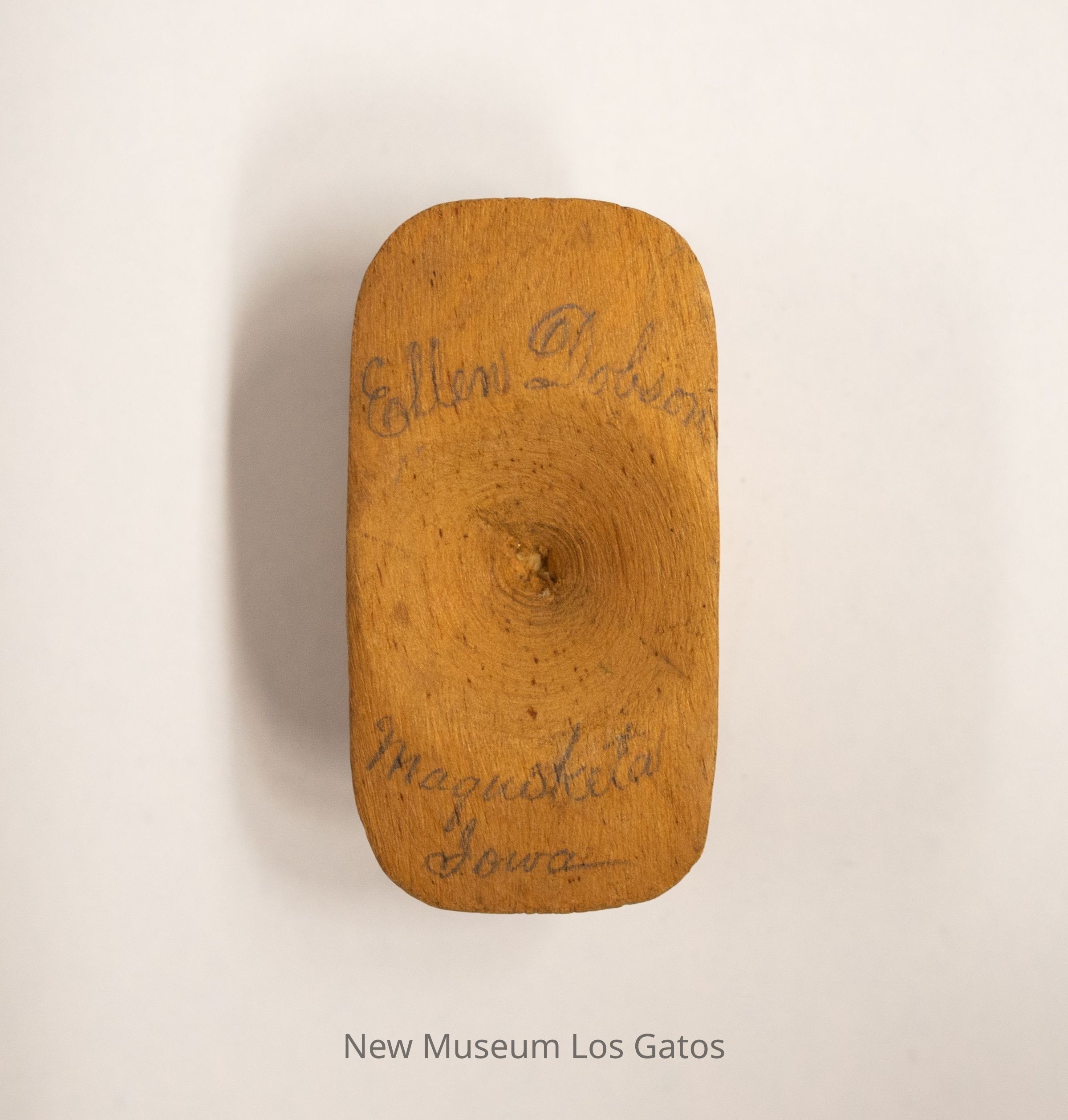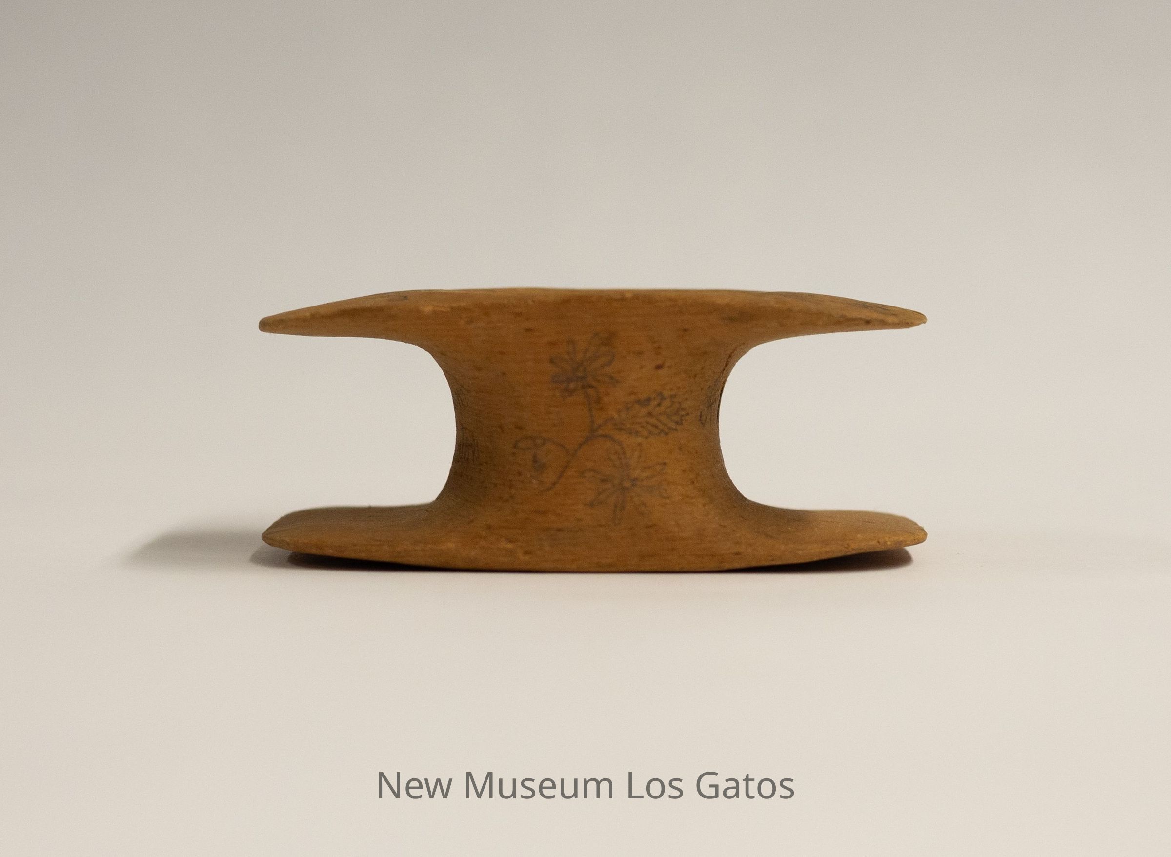 A small, unidentified wooden object. The object is flat on the top and bottom, with a thick base/stem in the center. There is a concavity/divet on each flat side.Collection