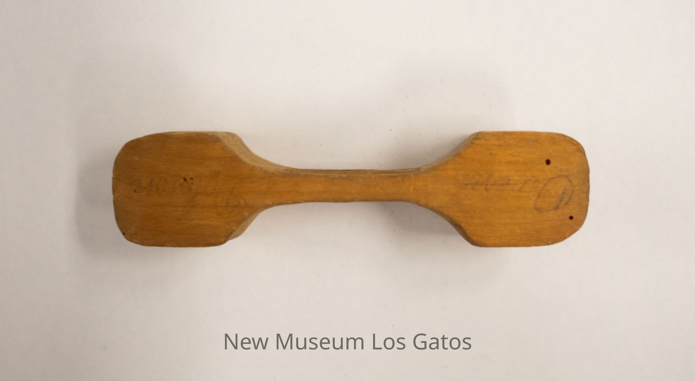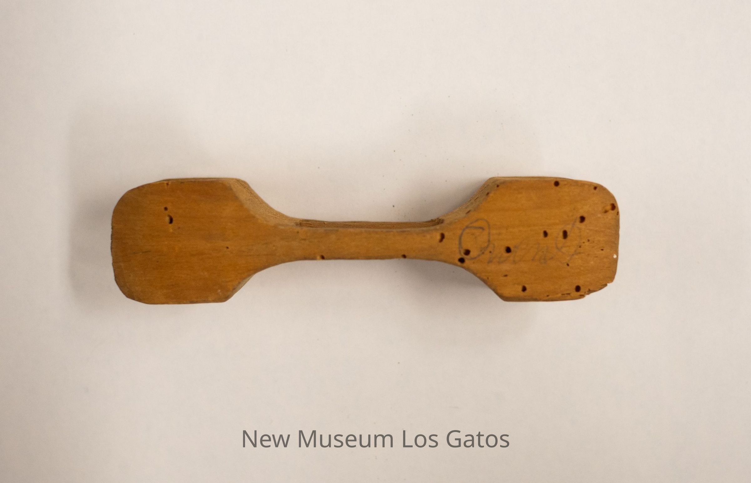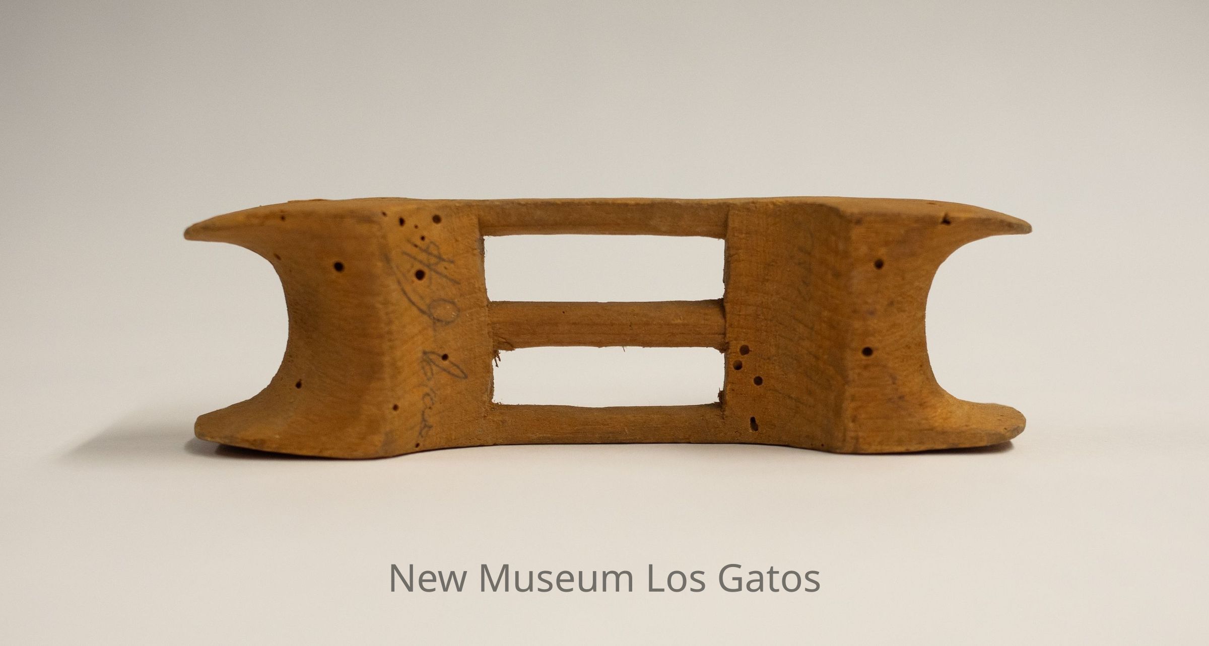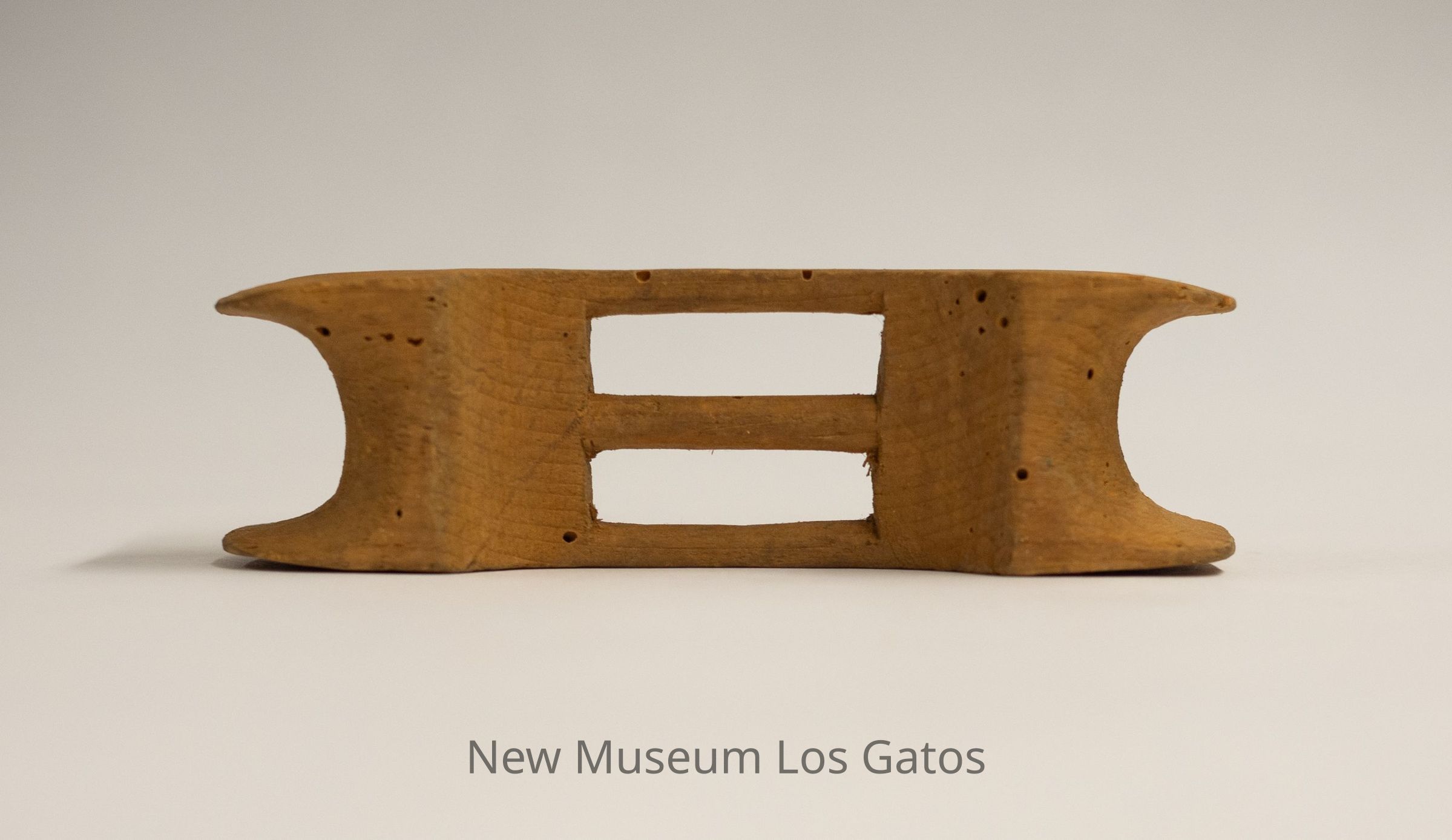A small, unidentified wooden object. The object has curves carved out of each end, with three connector sticks inbetween.Collection