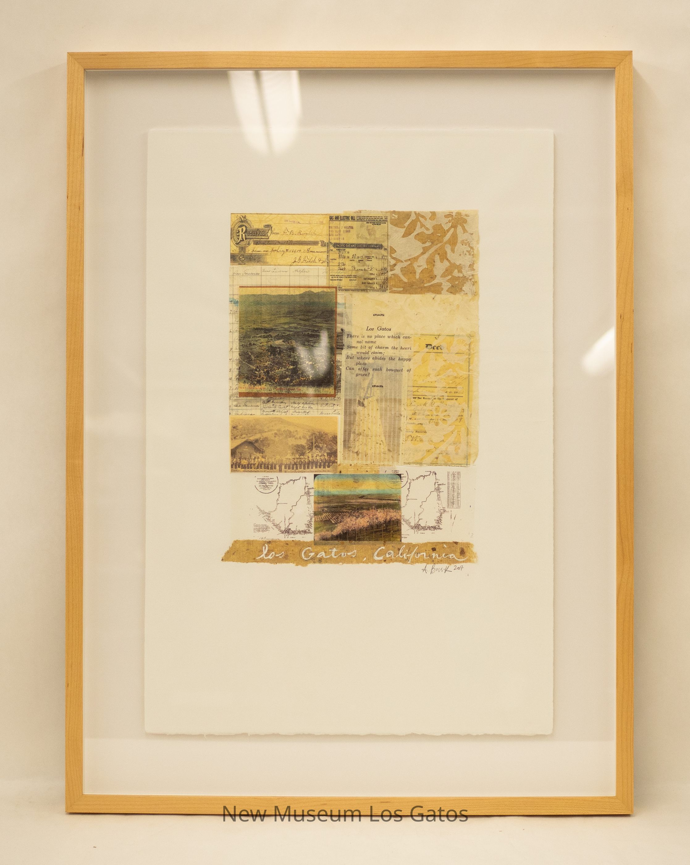 A collage consisting of pieces of various photographs, documents, and maps that pertain to Los Gatos from NUMU's permanent collection. At the bottom is a strip of paper with "Los Gatos, California" written in white ink.Artwork Details
